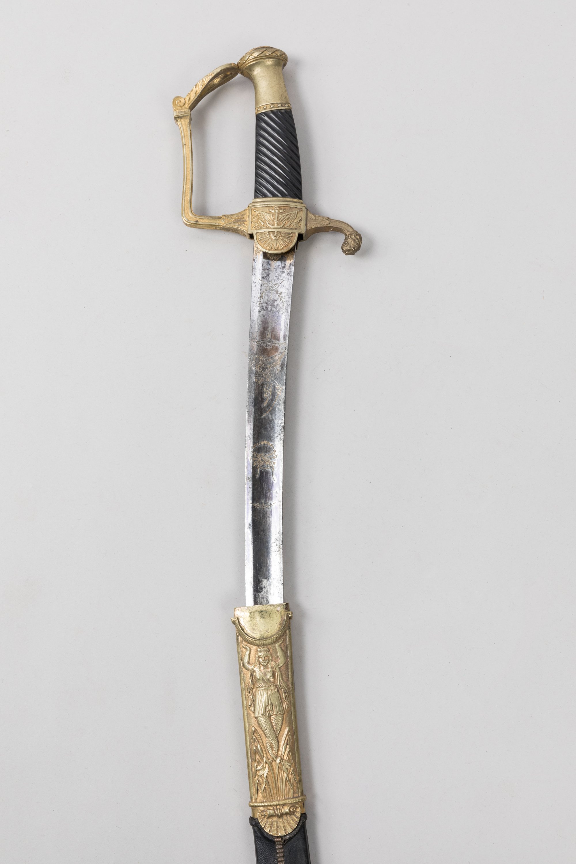 Fourreau recouvert de chagrin, à deux garnitures en laiton au modèle. Chappe à décor de sirène et bouterole de roseaux.
