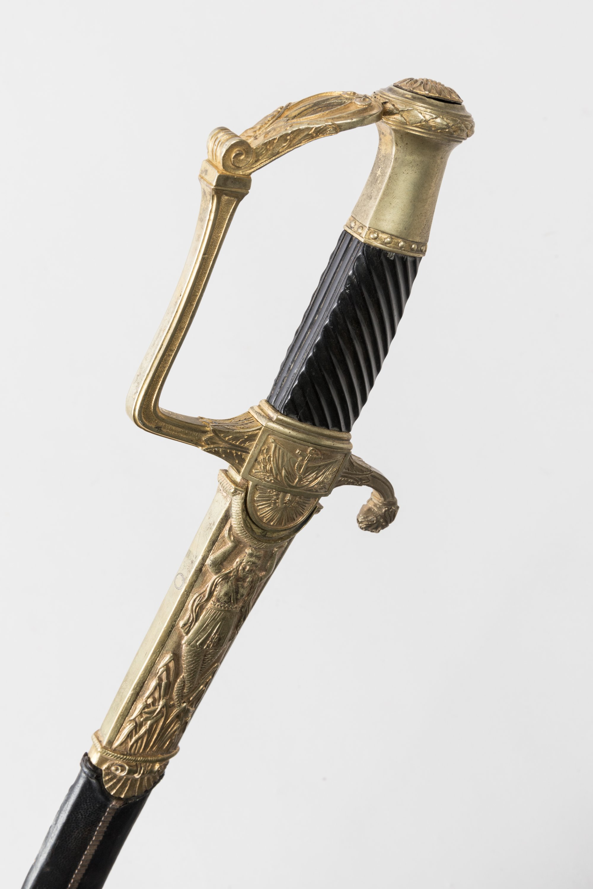 Fusée en ébène cannelé. Monture en laiton, garde à une branche en colonne. Nœud de corps à l’ancre sur fond de drapeaux (traces de réparation). Quillon au mufle léonin.