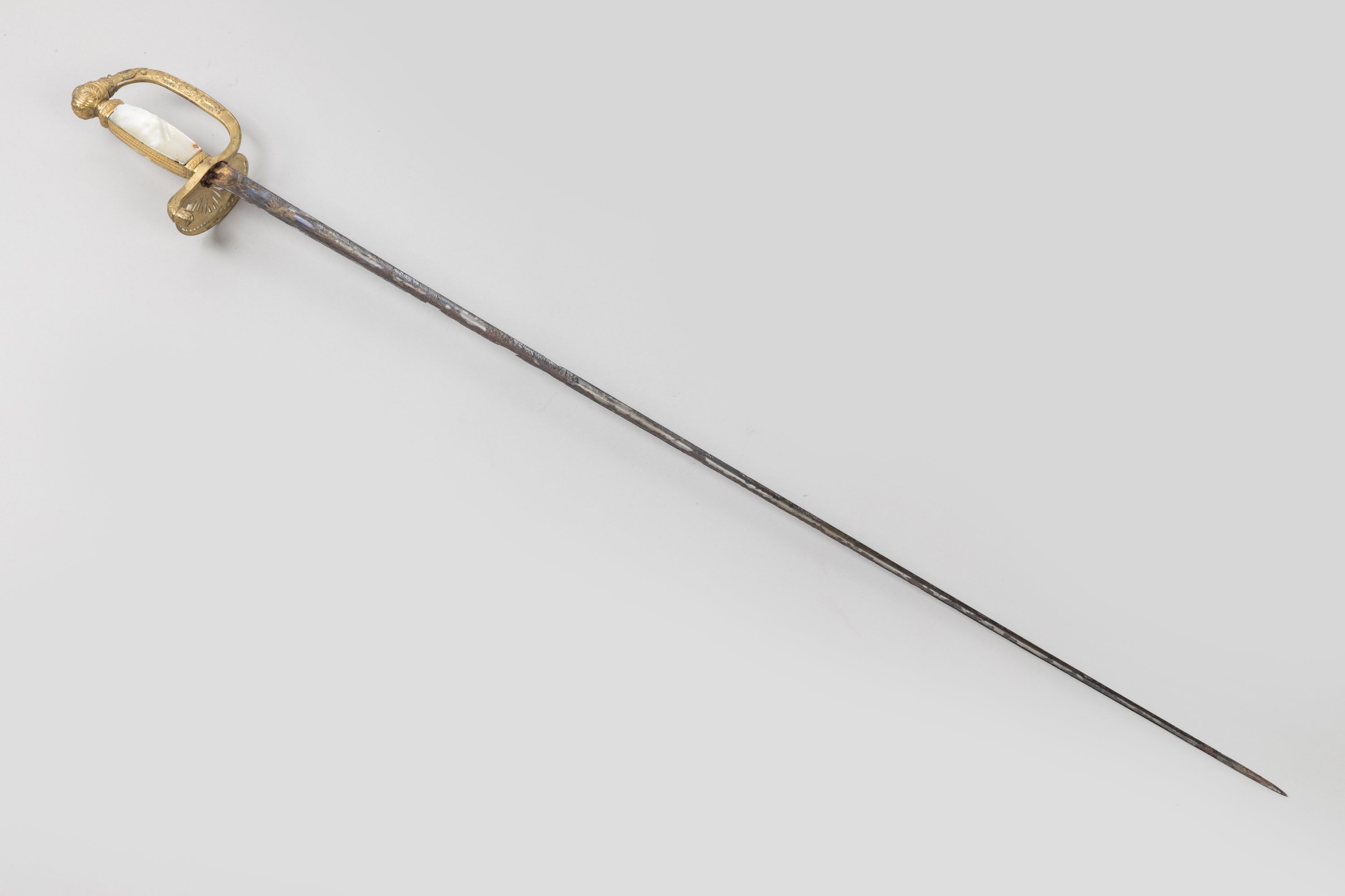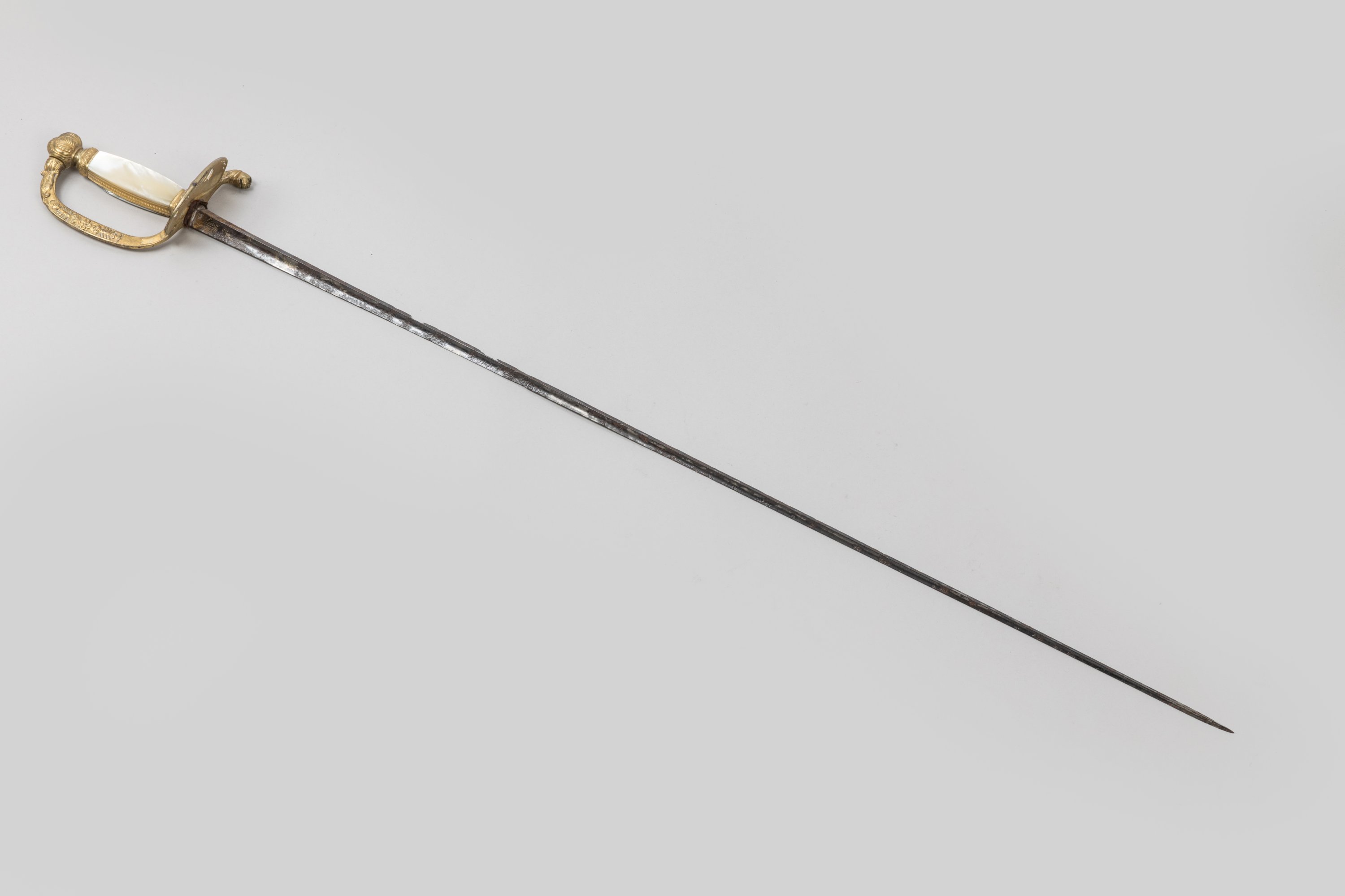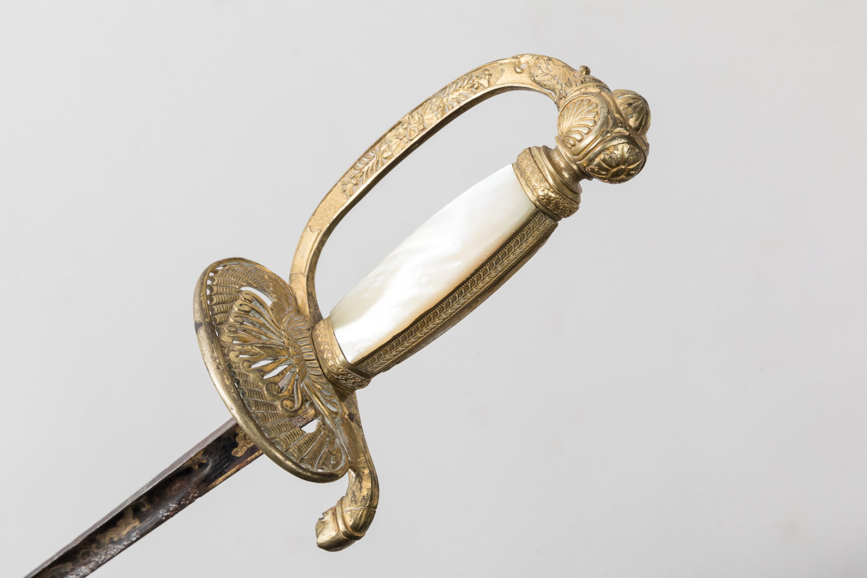 Fusée à plaquettes de nacre (accident et réparation à l'une). Monture en laiton doré, pommeau à palmettes, garde à une branche, clavier ajourée à la palmette. Lame triangulaire de Solingen avec restes de gravure de bleu et d’or.