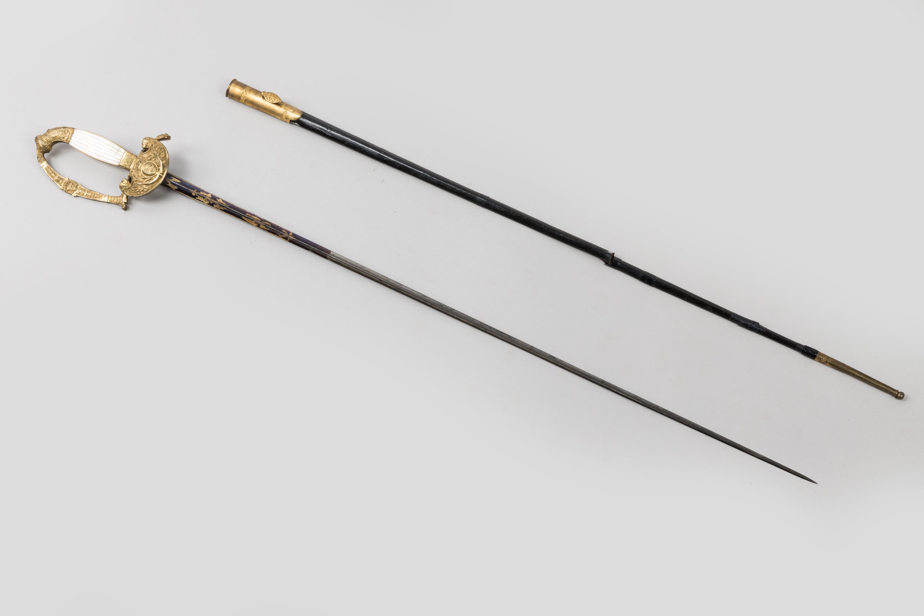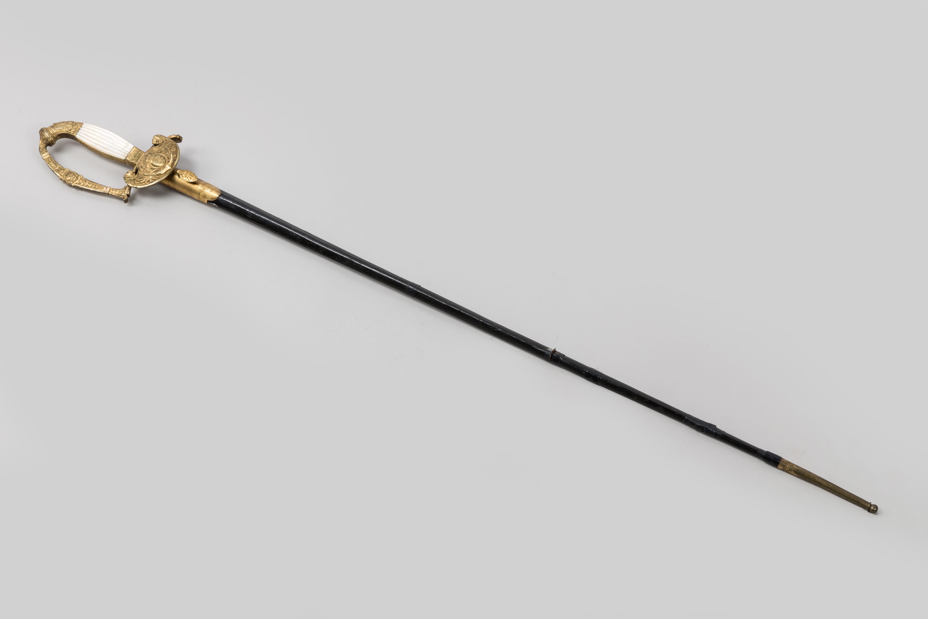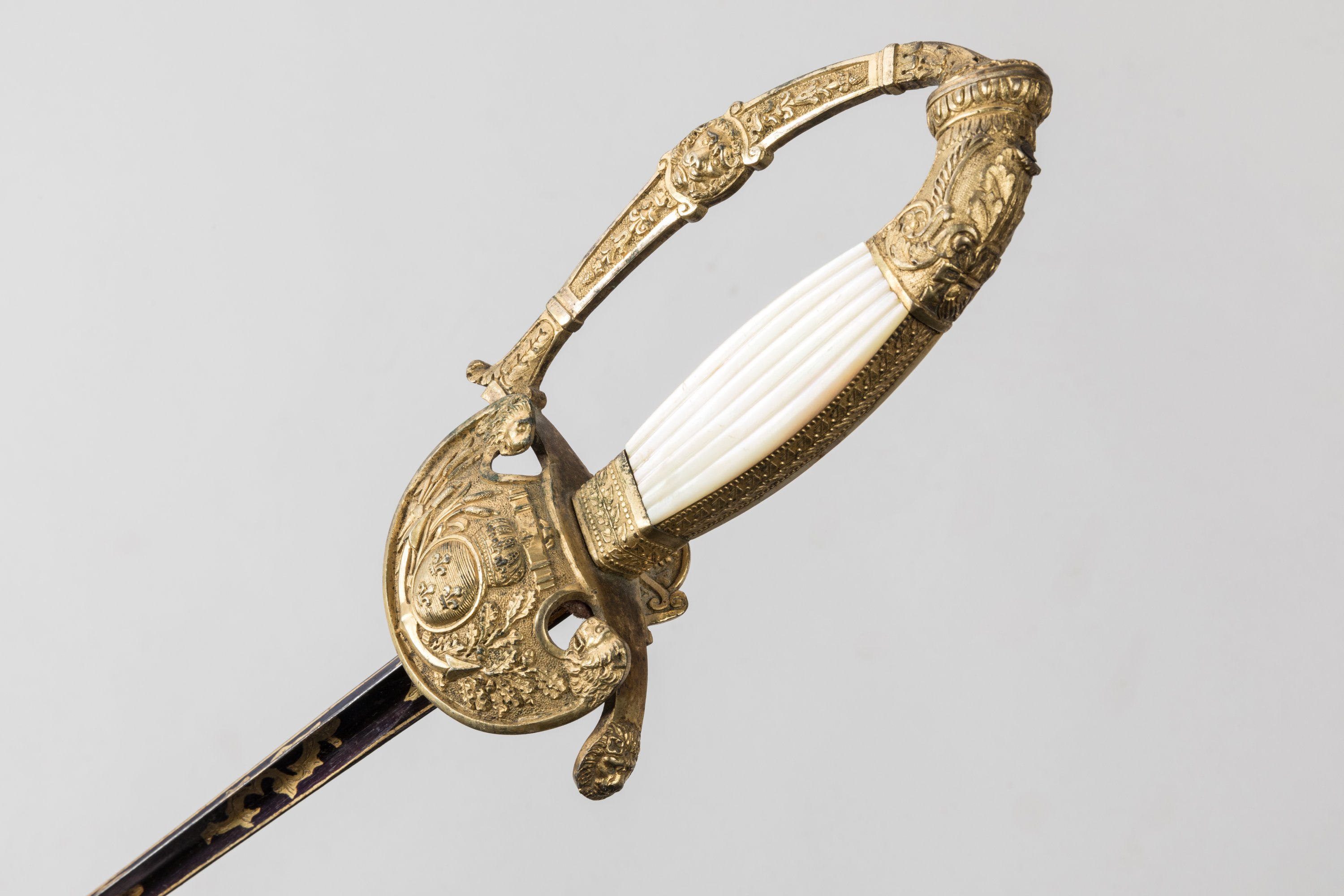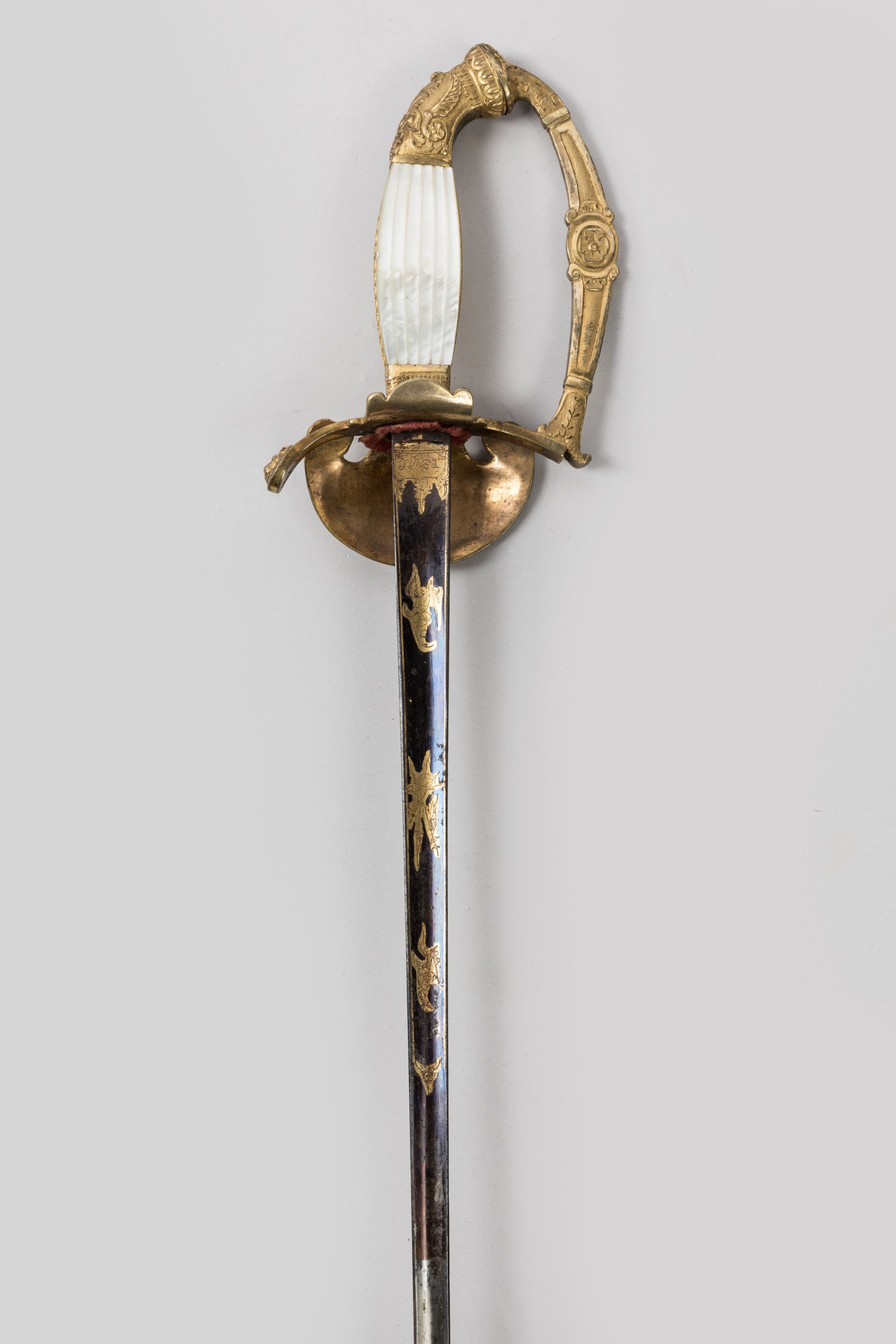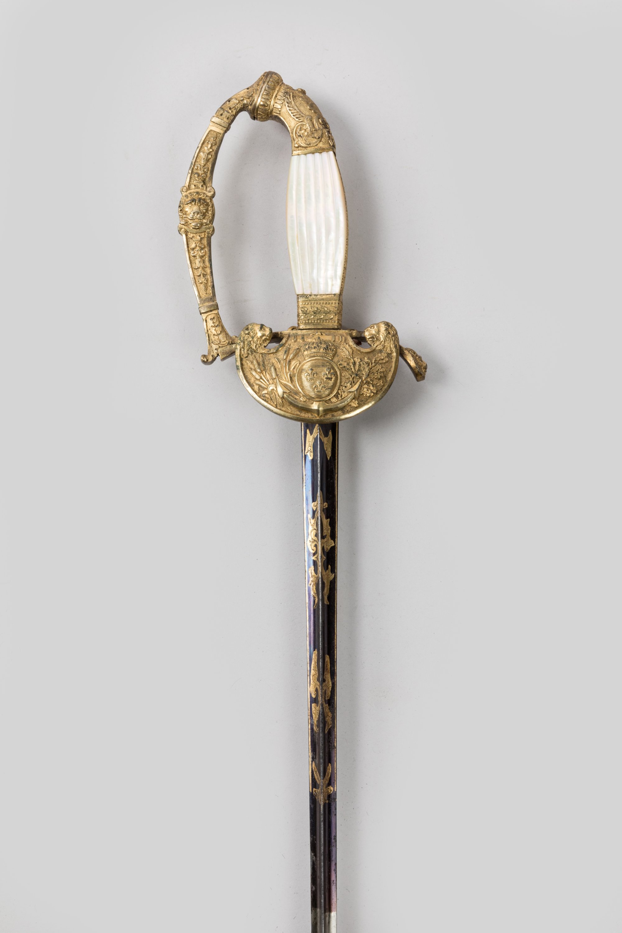 Fusée à plaquettes de nacre. Monture en laiton doré ciselé, garde à une branche, à clavier aux armes de France sous couronne royale dans une couronne de feuilles de chêne et de roseaux.