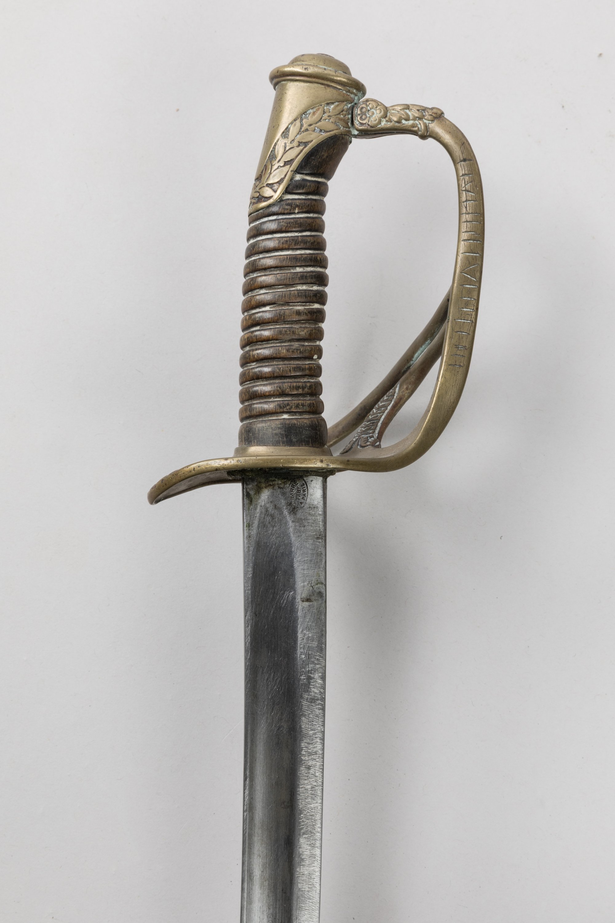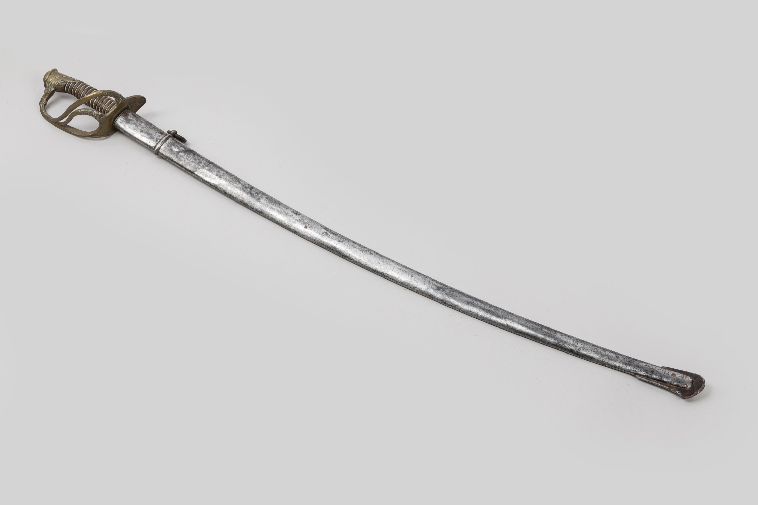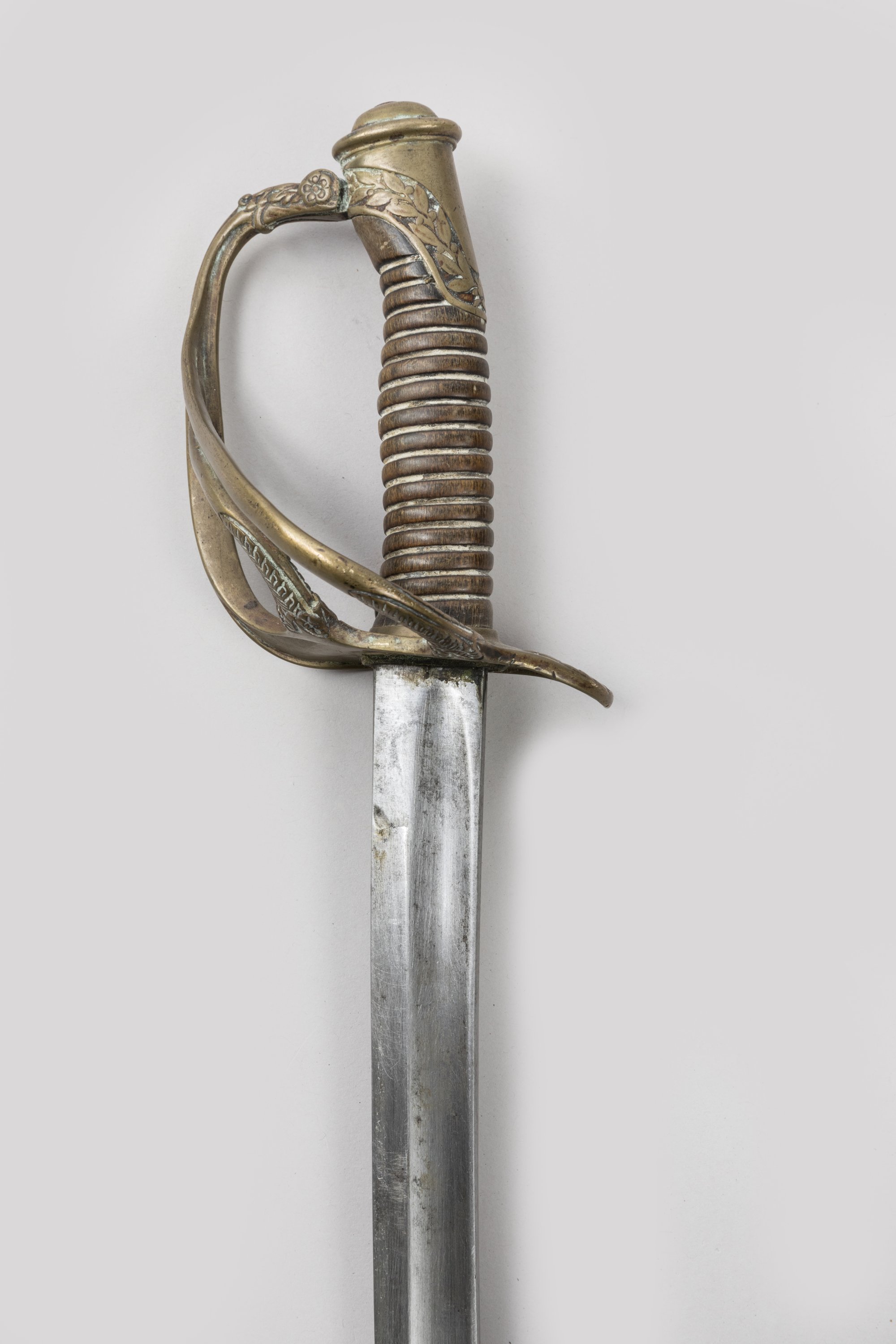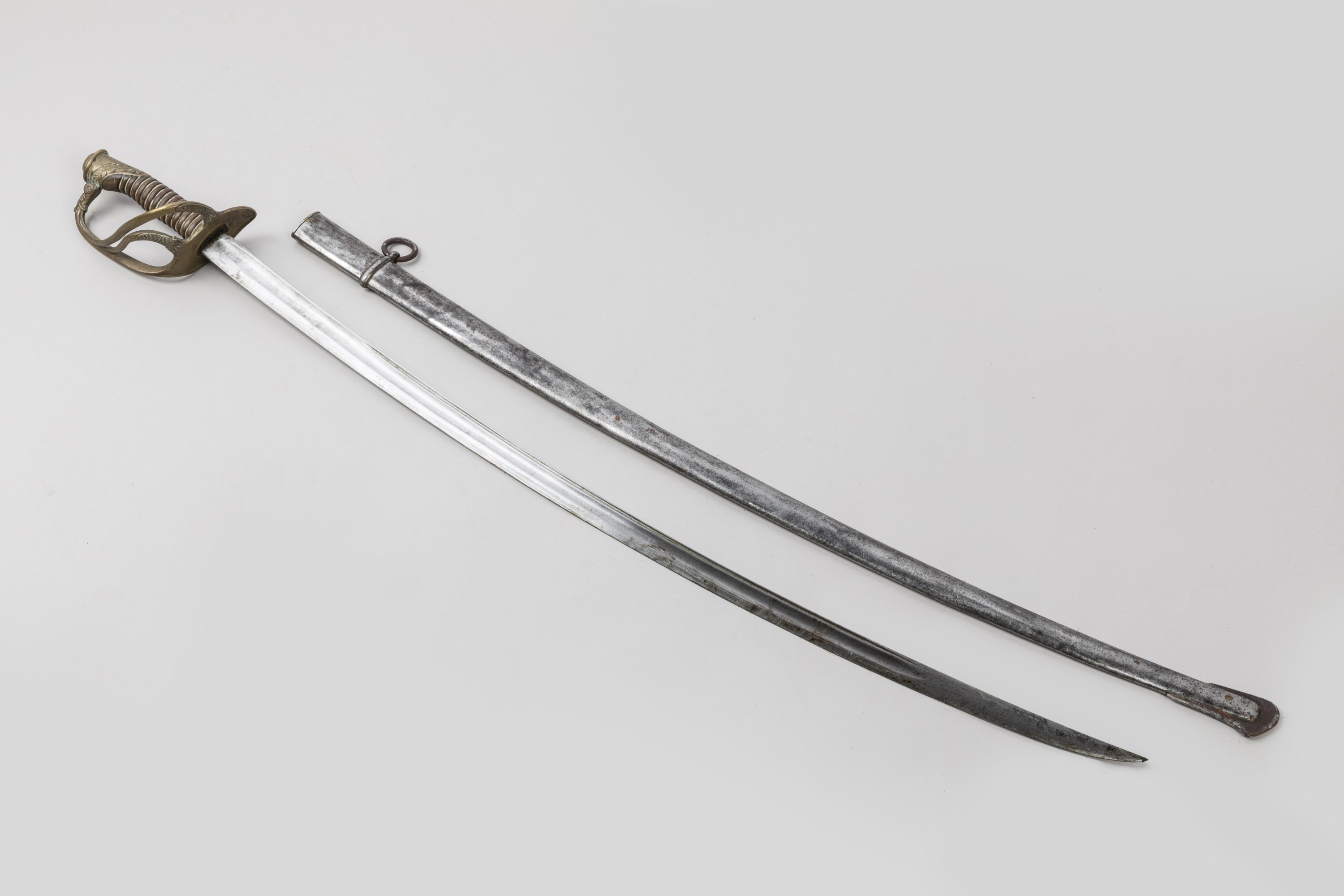 - Sabre de cavalerie modèle 1822-83. Poignée recouverte de cuir avec filigrane. Monture en laiton, garde à trois branches. Lame droite à dos plat et pans creux. Fourreau en tôle de fer.