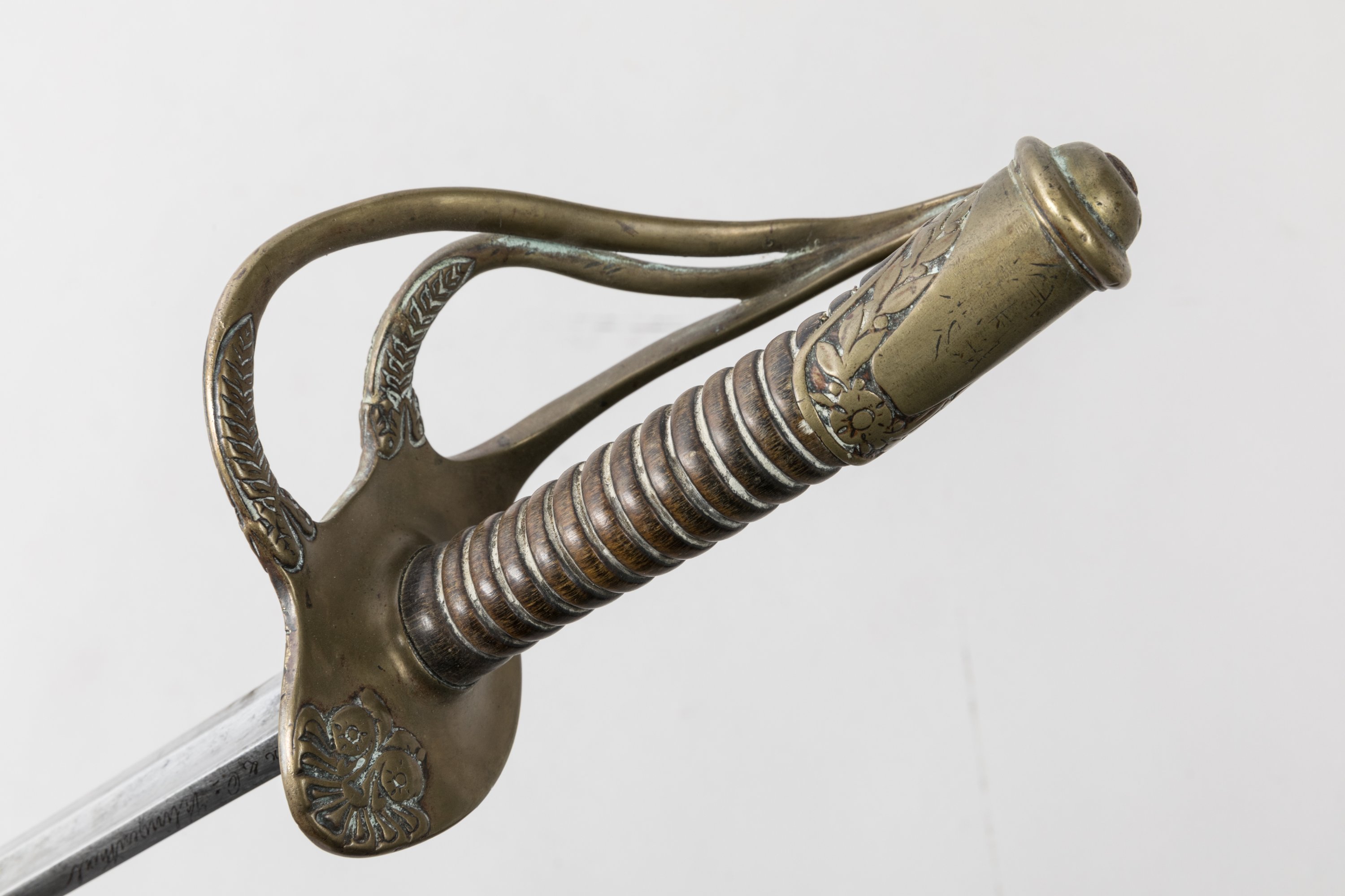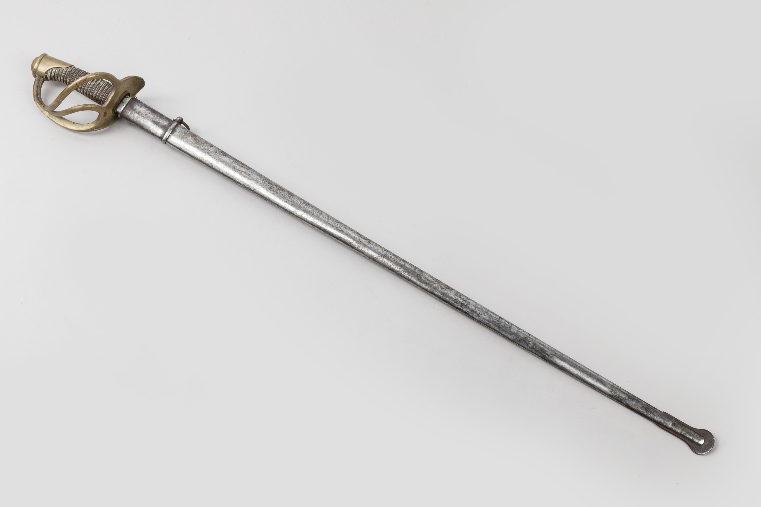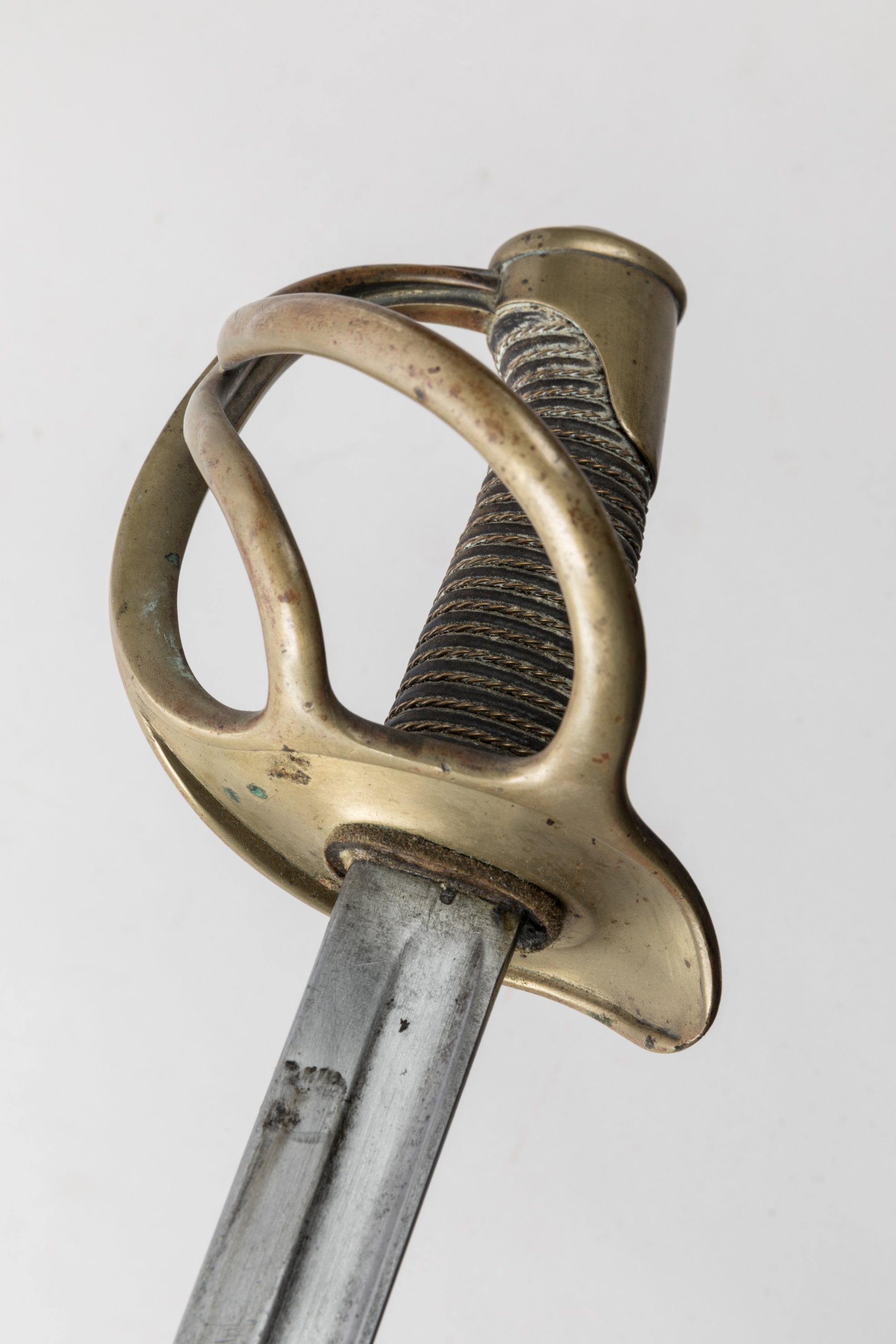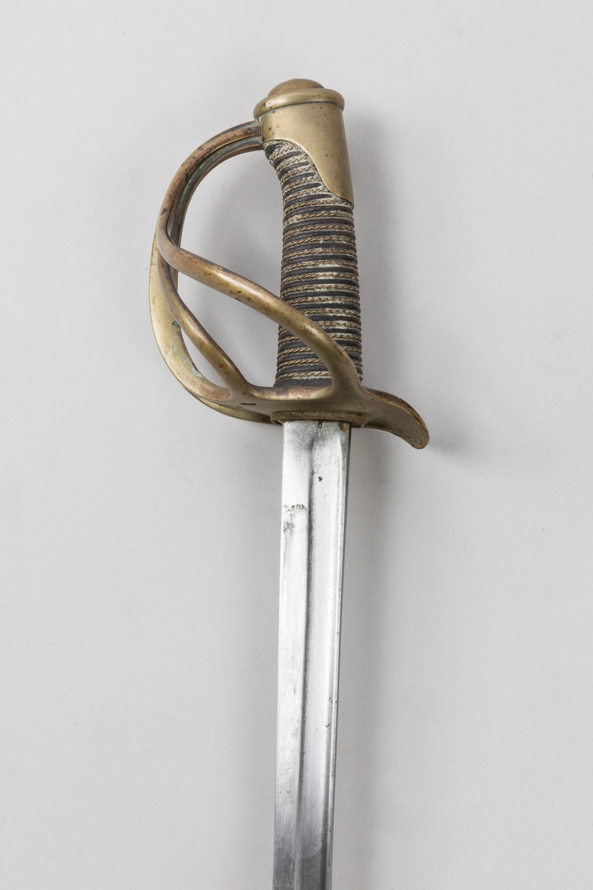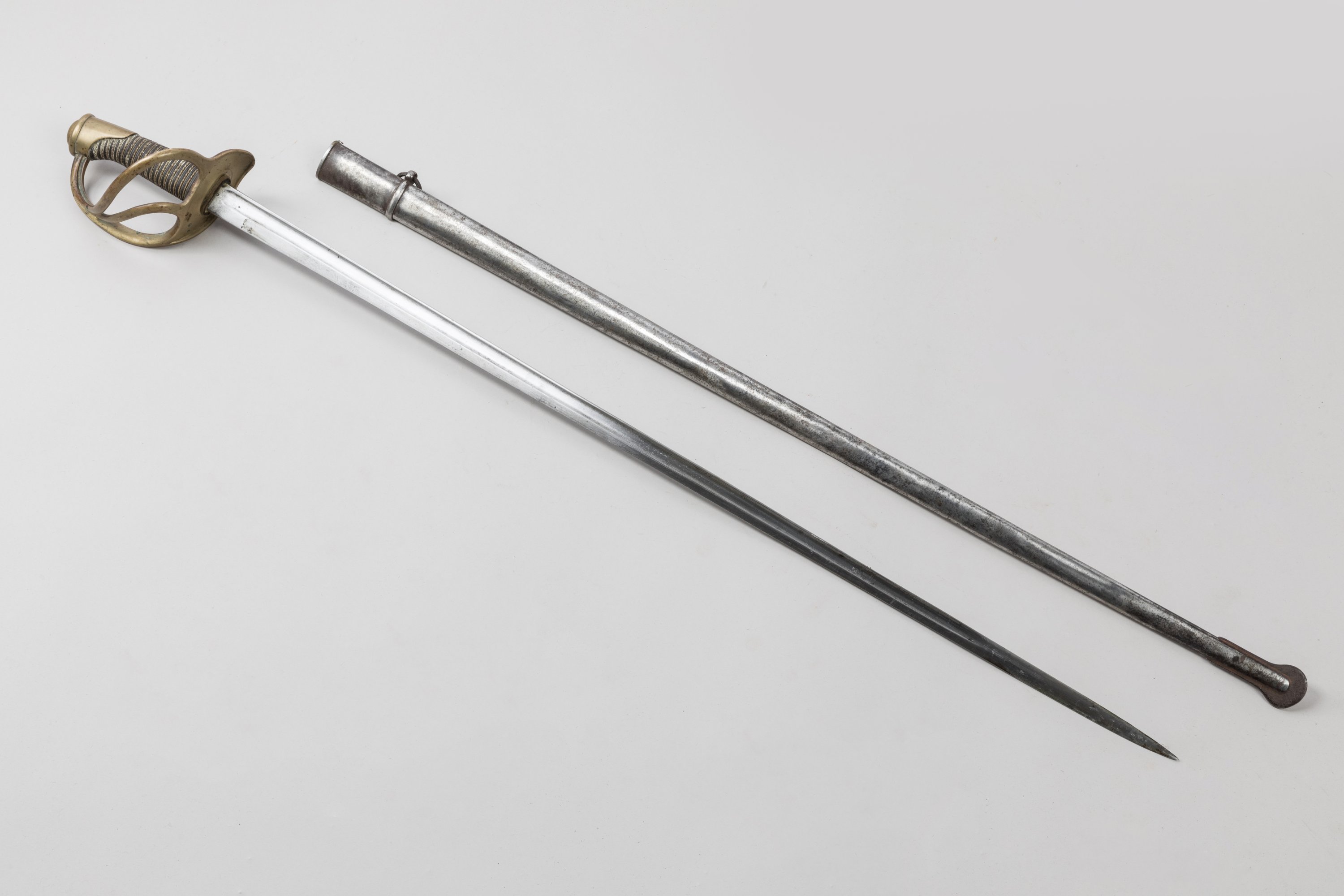 - Sabre de cavalerie modèle 1822-83. Poignée recouverte de cuir avec filigrane. Monture en laiton, garde à trois branches. Lame droite à dos plat et pans creux. Fourreau en tôle de fer.