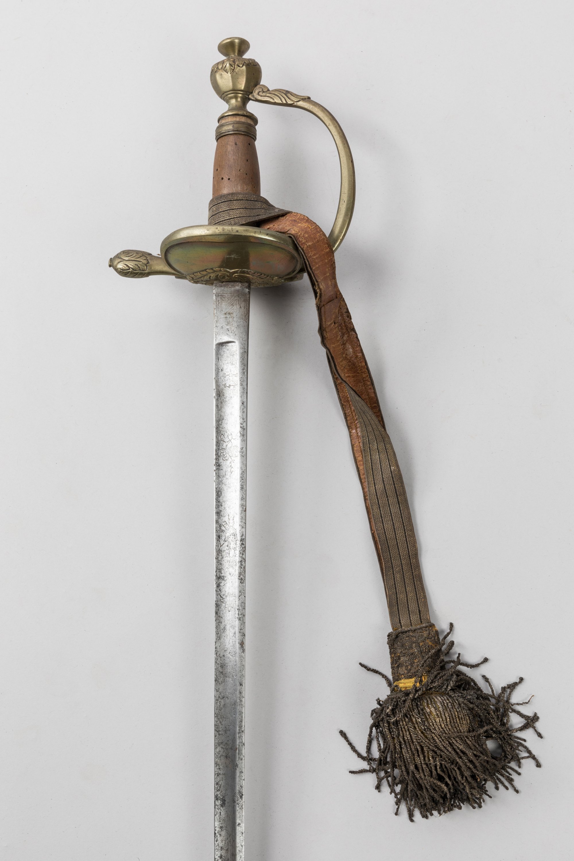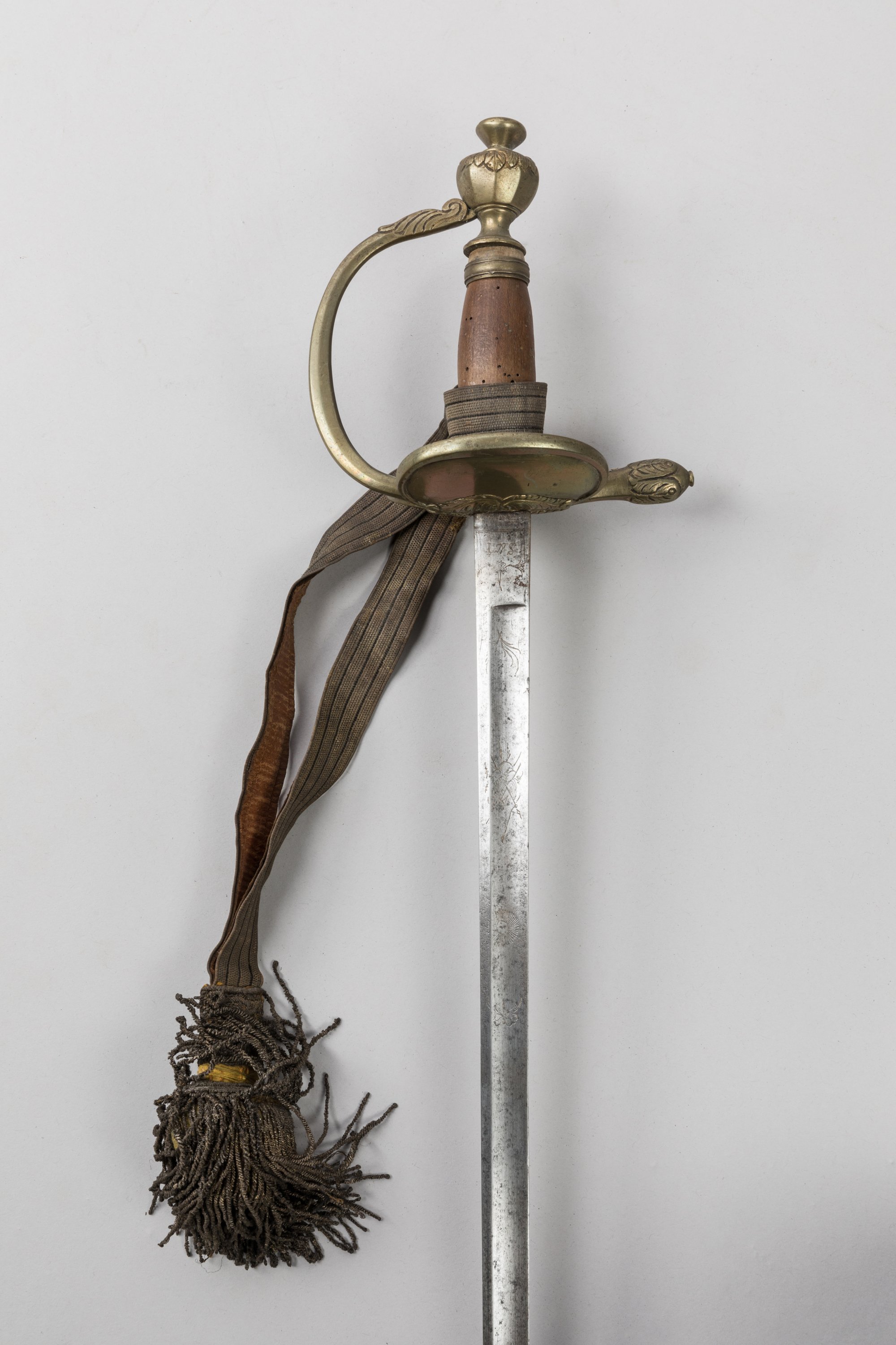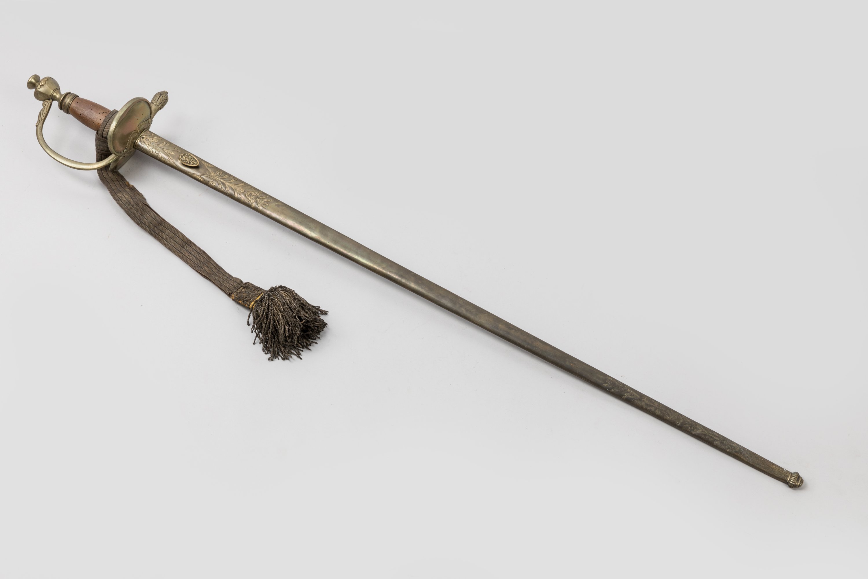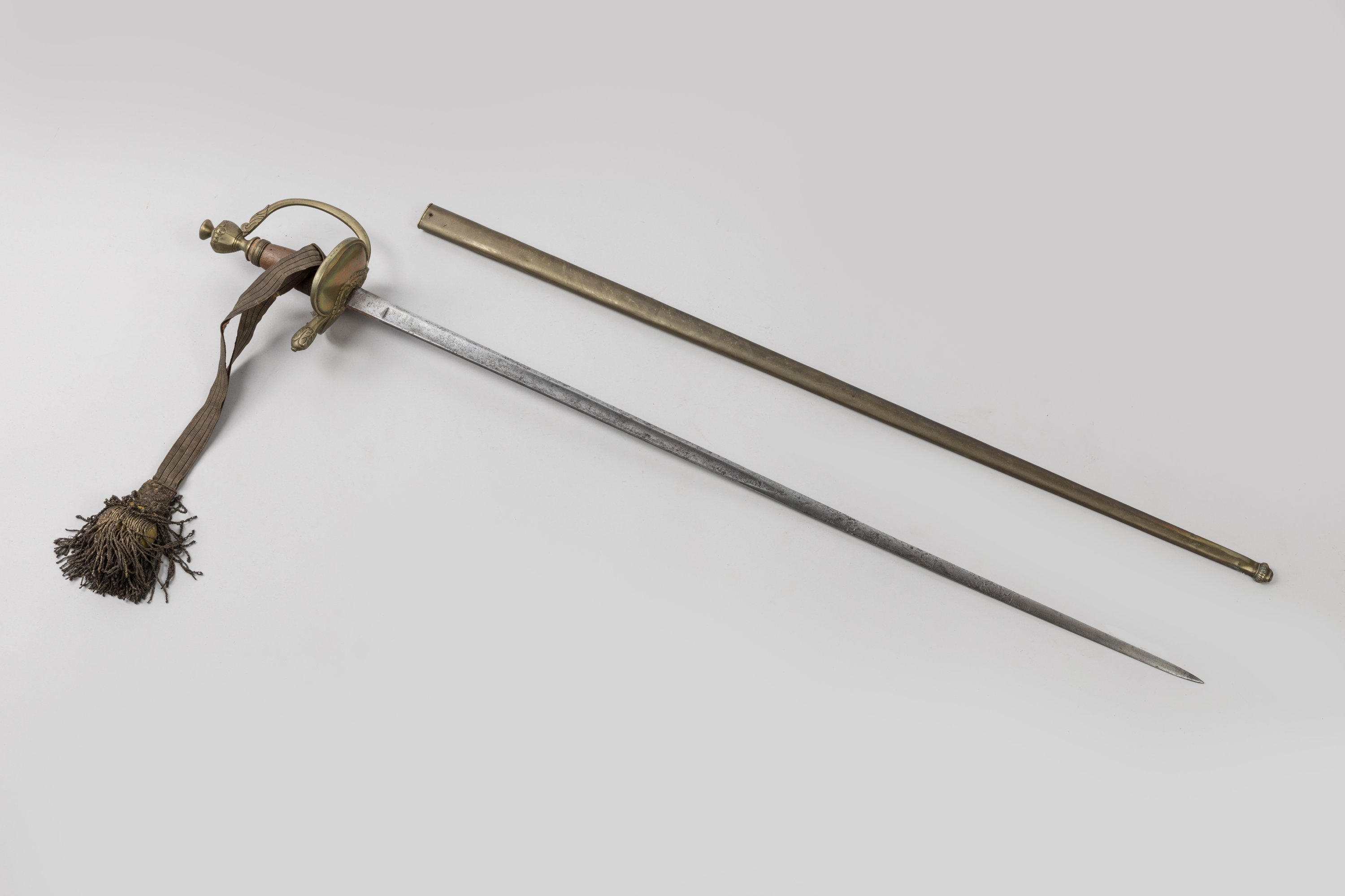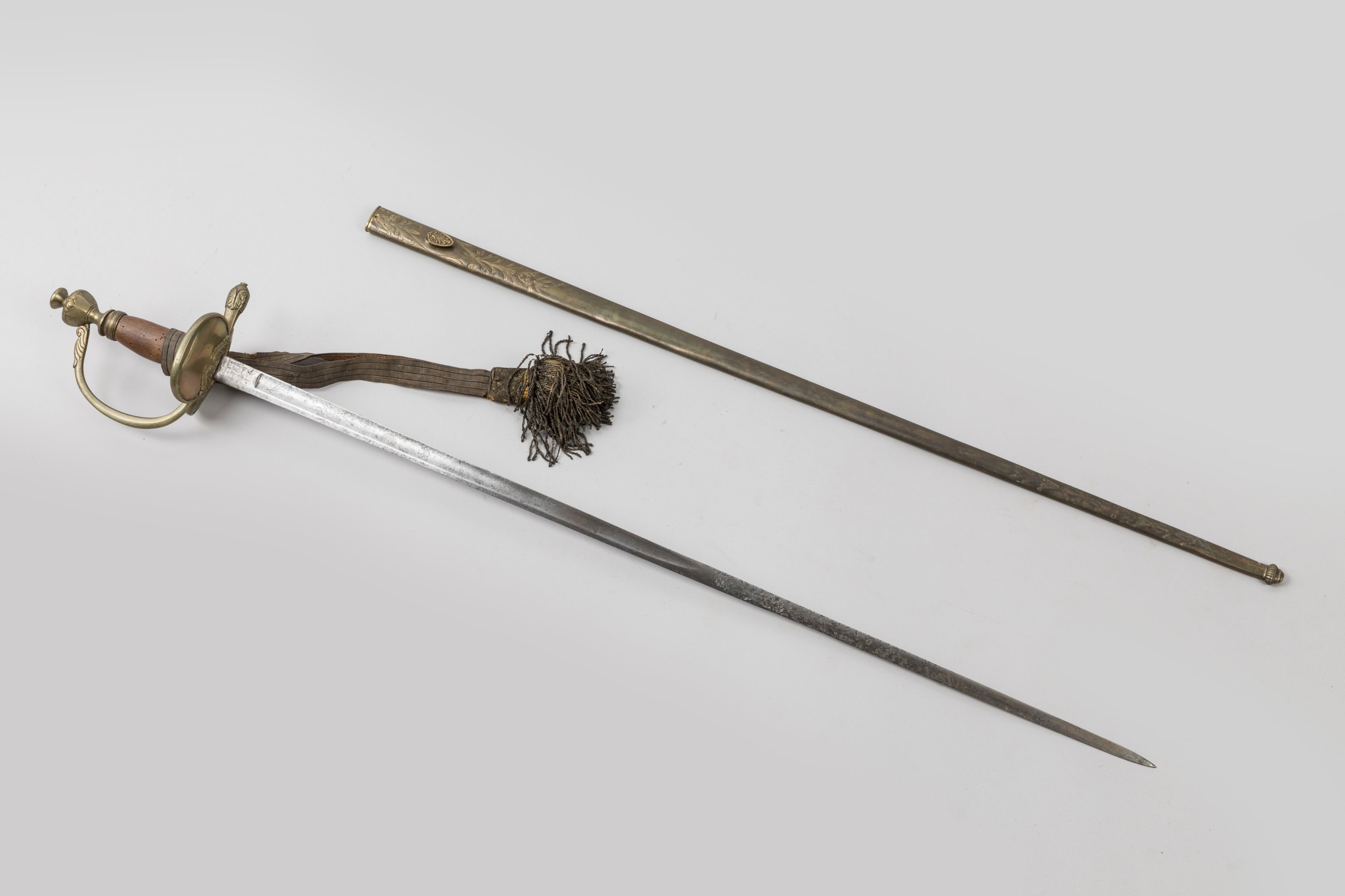 Fusée en bois (manque le filigrane). Monture en laiton, garde à une branche et deux coquilles et quillon. Lame droite de Solingen gravée (fortes piqûres à l’extrémité). Avec un fourreau dépareillé en laiton gravé de rinceaux.