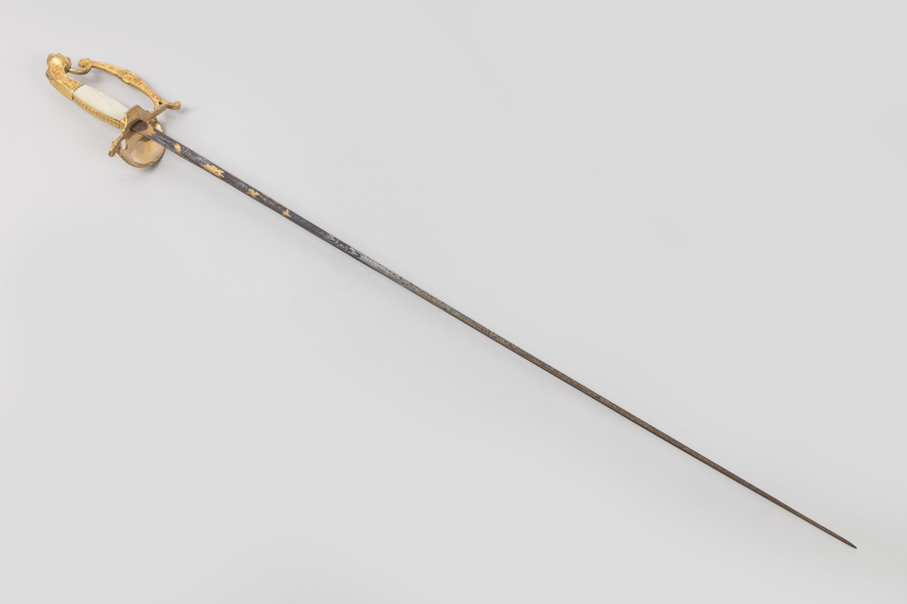 Fusée à plaquettes de nacre rainurées. Monture en laiton doré, garde à une branche, clavier aux pioches entrecroisées, casques à l’antique et feuilles de chêne. Lame triangulaire de Solingen gravée dorée et bleuie au tiers.