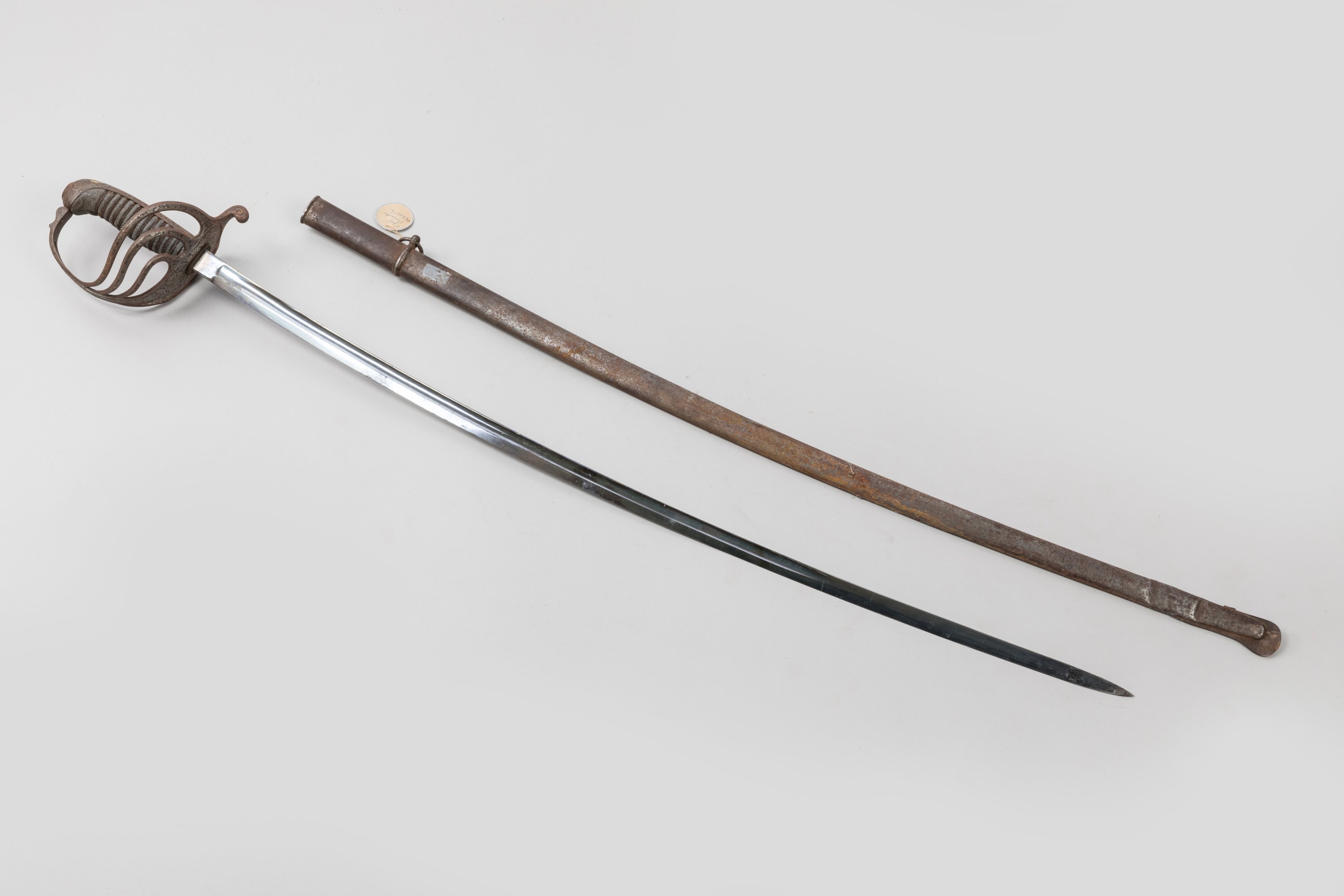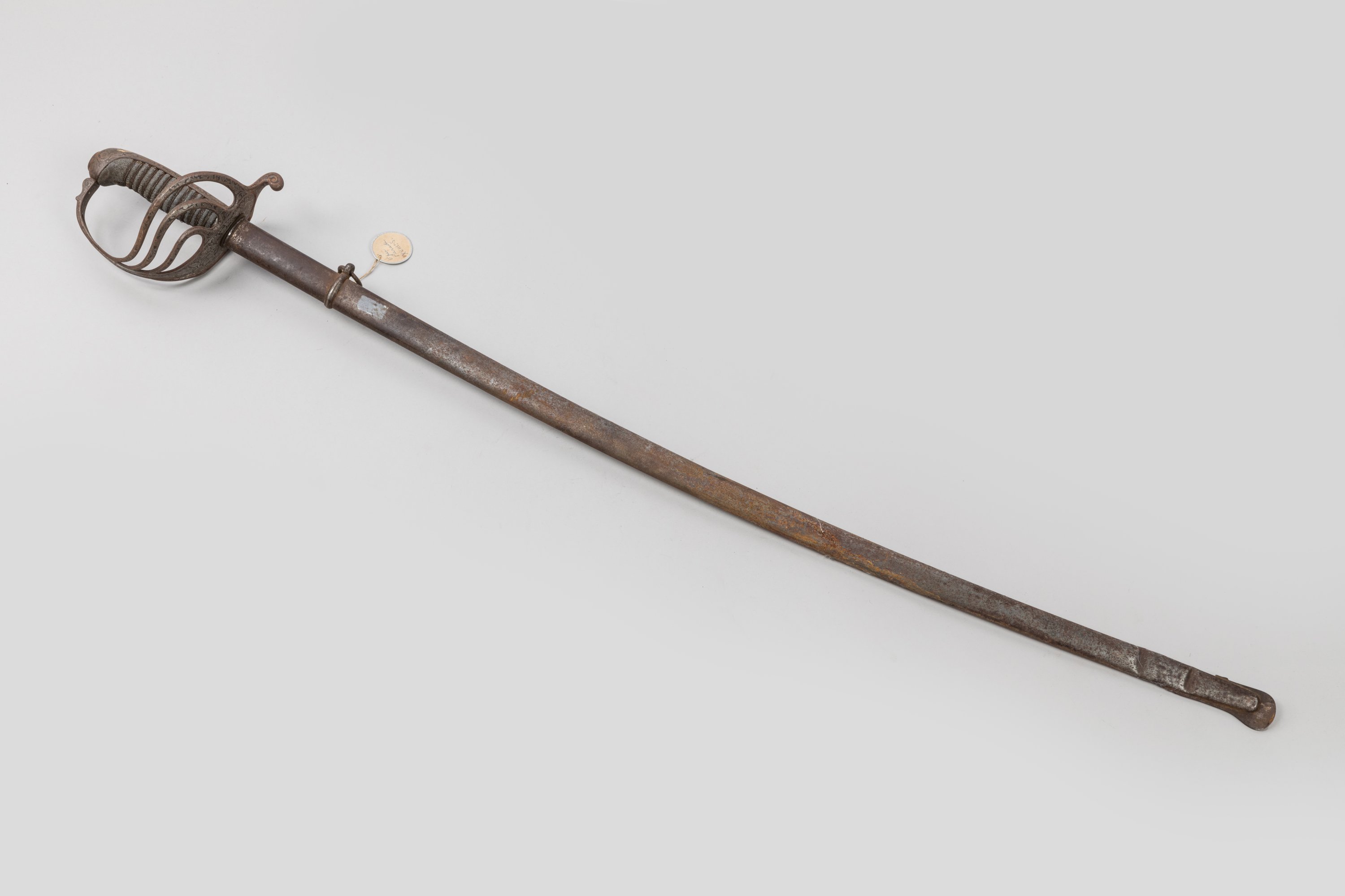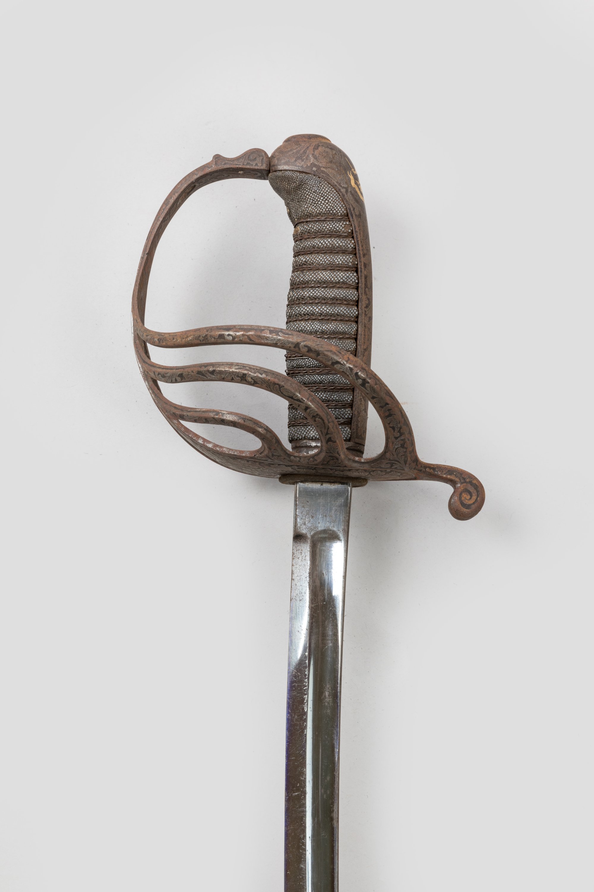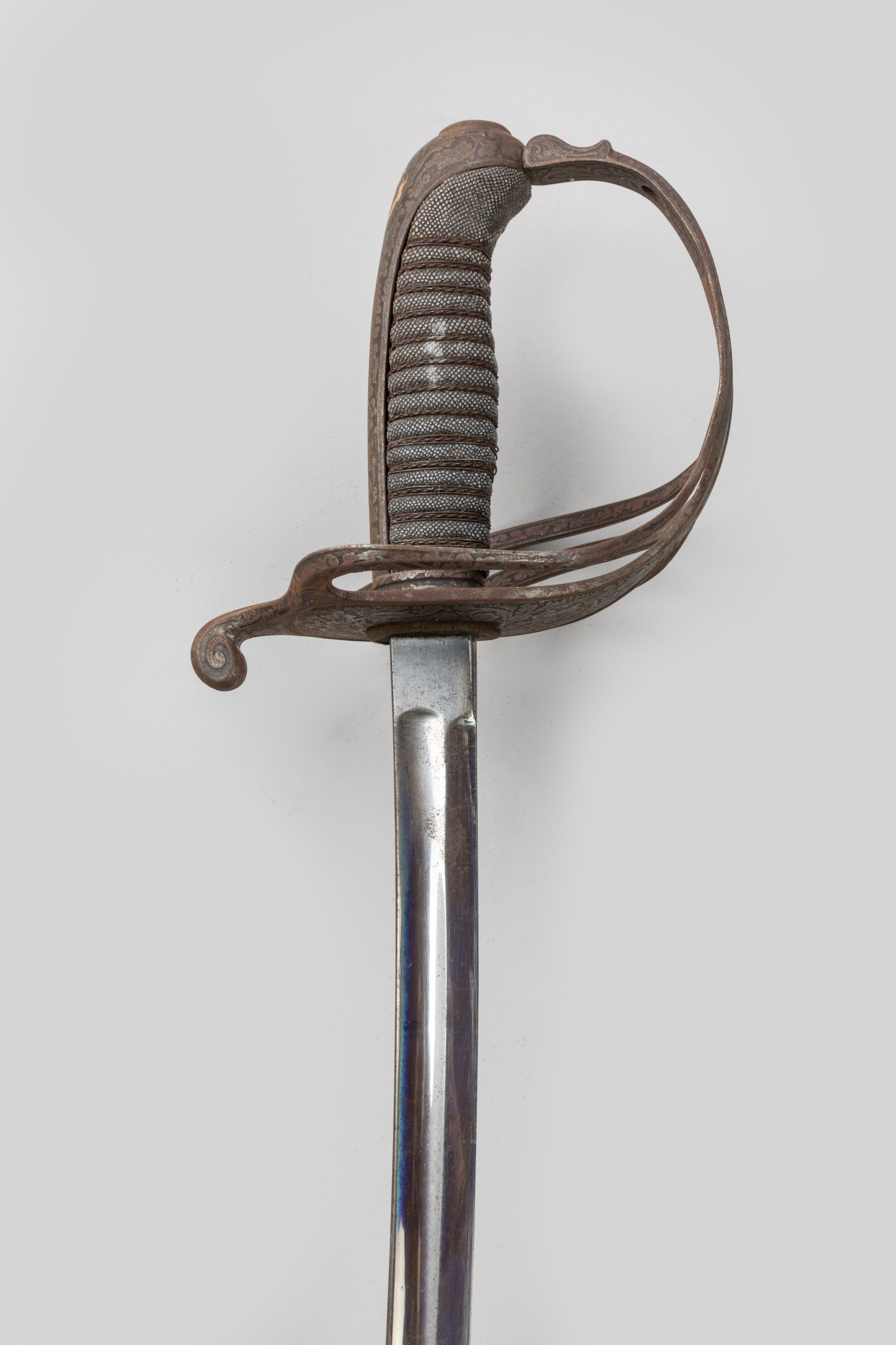 Poignée recouverte de galuchat avec filigrane. Monture en fer entièrement ciselée de rinceaux feuillagés, garde à quatre branches. Calotte décorée à l’or de la devise « DEO DUCE FERRO COMITE ». Lame courbe à pans creux. Fourreau en tôle de fer à un bracelet.