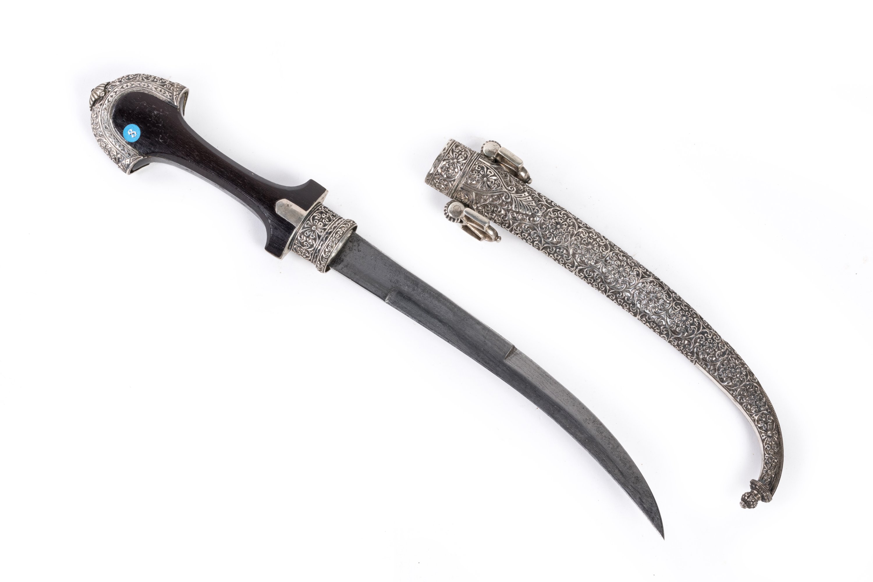 Poignée en bois verni. Monture et fourreau en métal argenté à décor de rinceaux.
