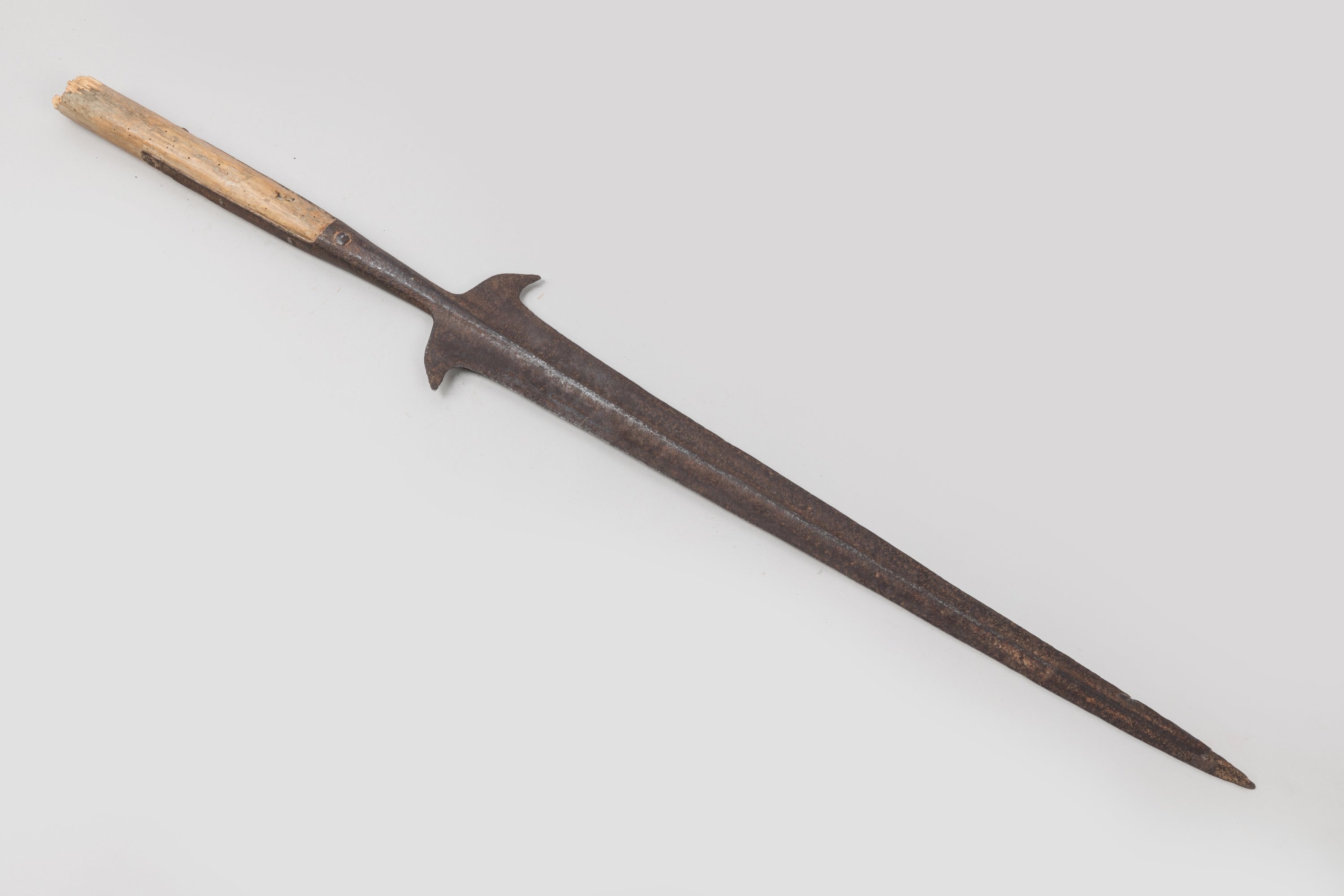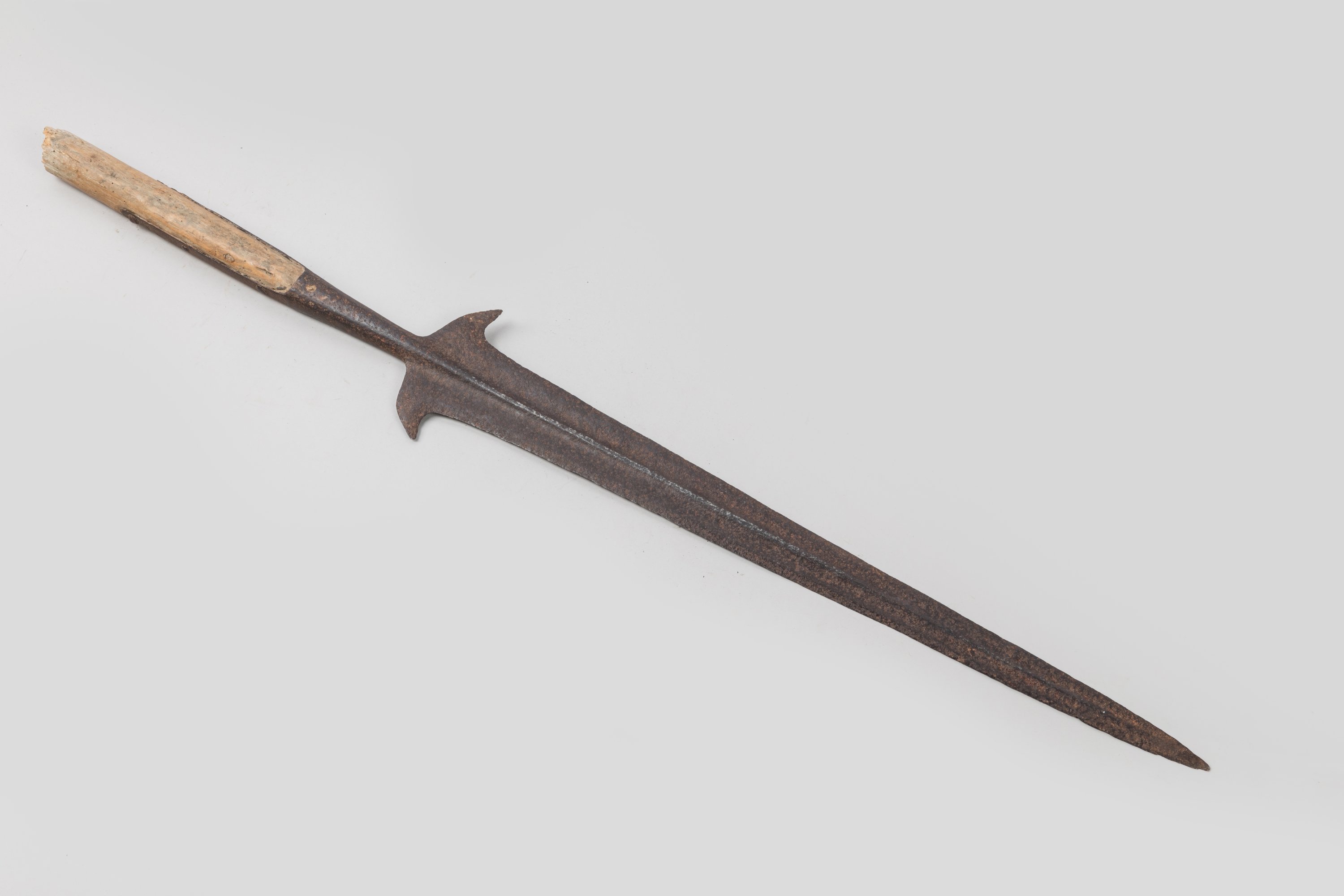 Fer à arête médiane, deux crocs au talon. Douille ronde à deux attelles. Reste de hampe.
