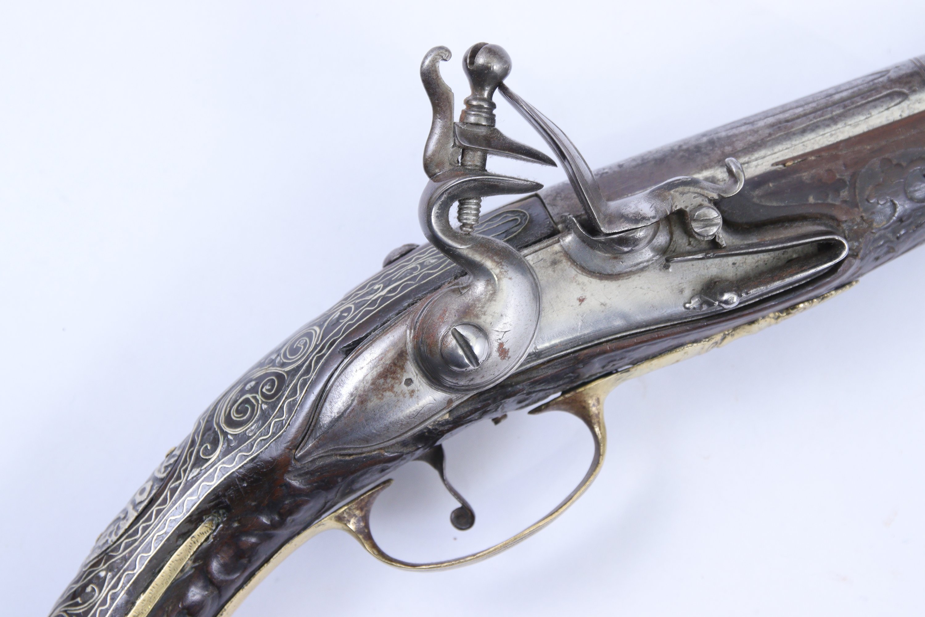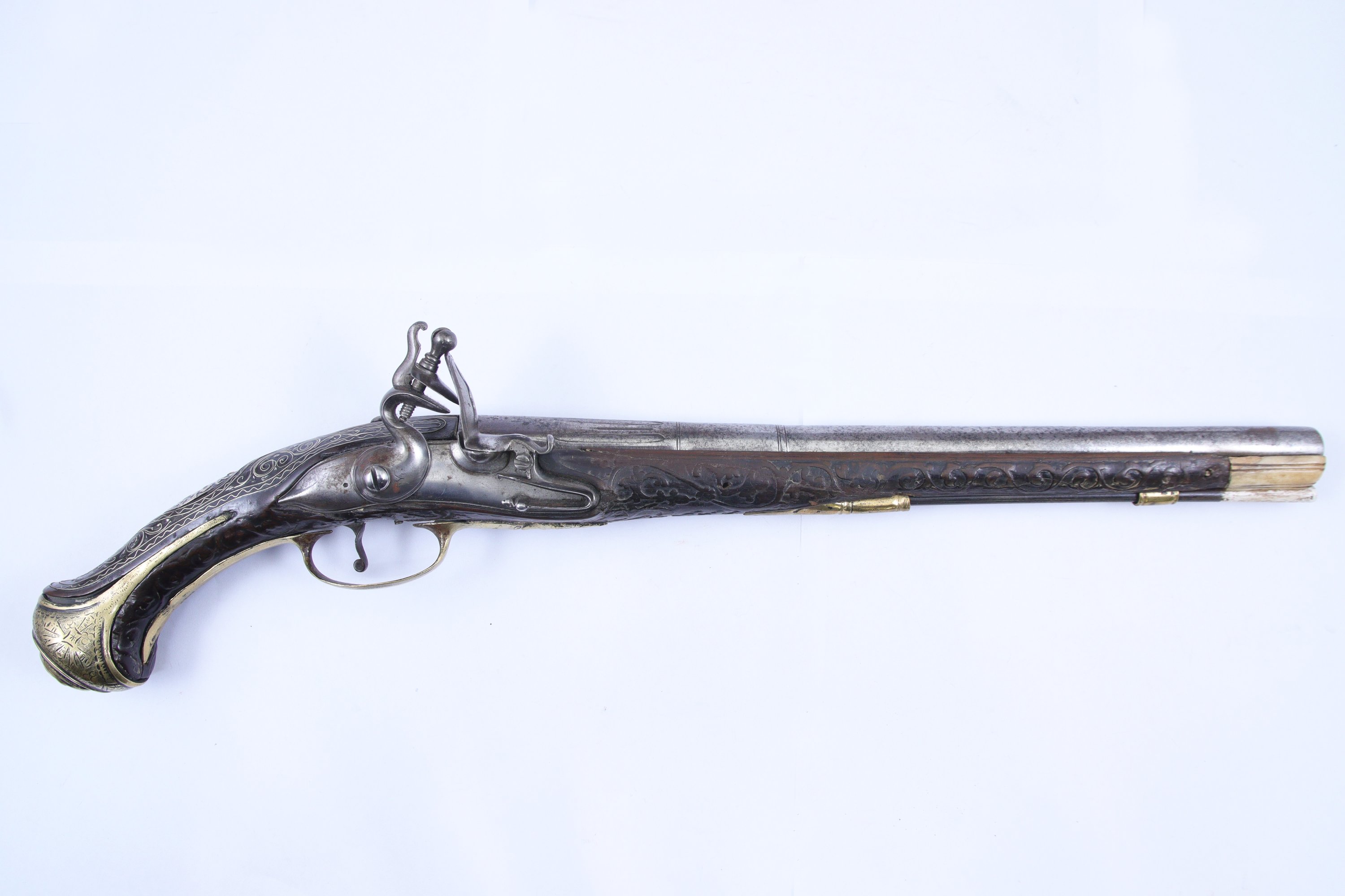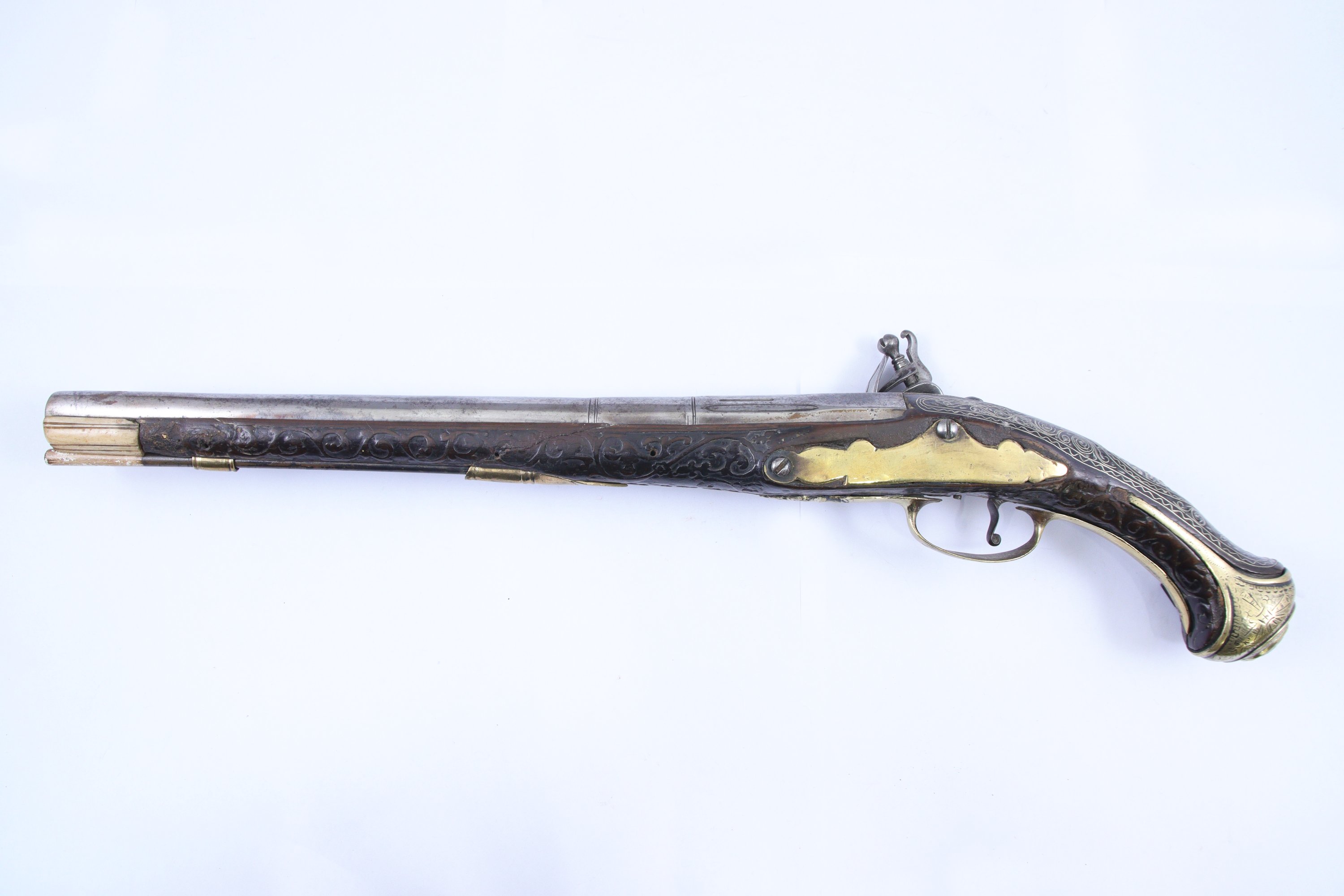 Canon rond, cannelé au tonnerre. Platine et chien col de cygne à corps rond, bassinet pare étincelle. Garnitures en laiton, calotte à longues oreilles, gravées.