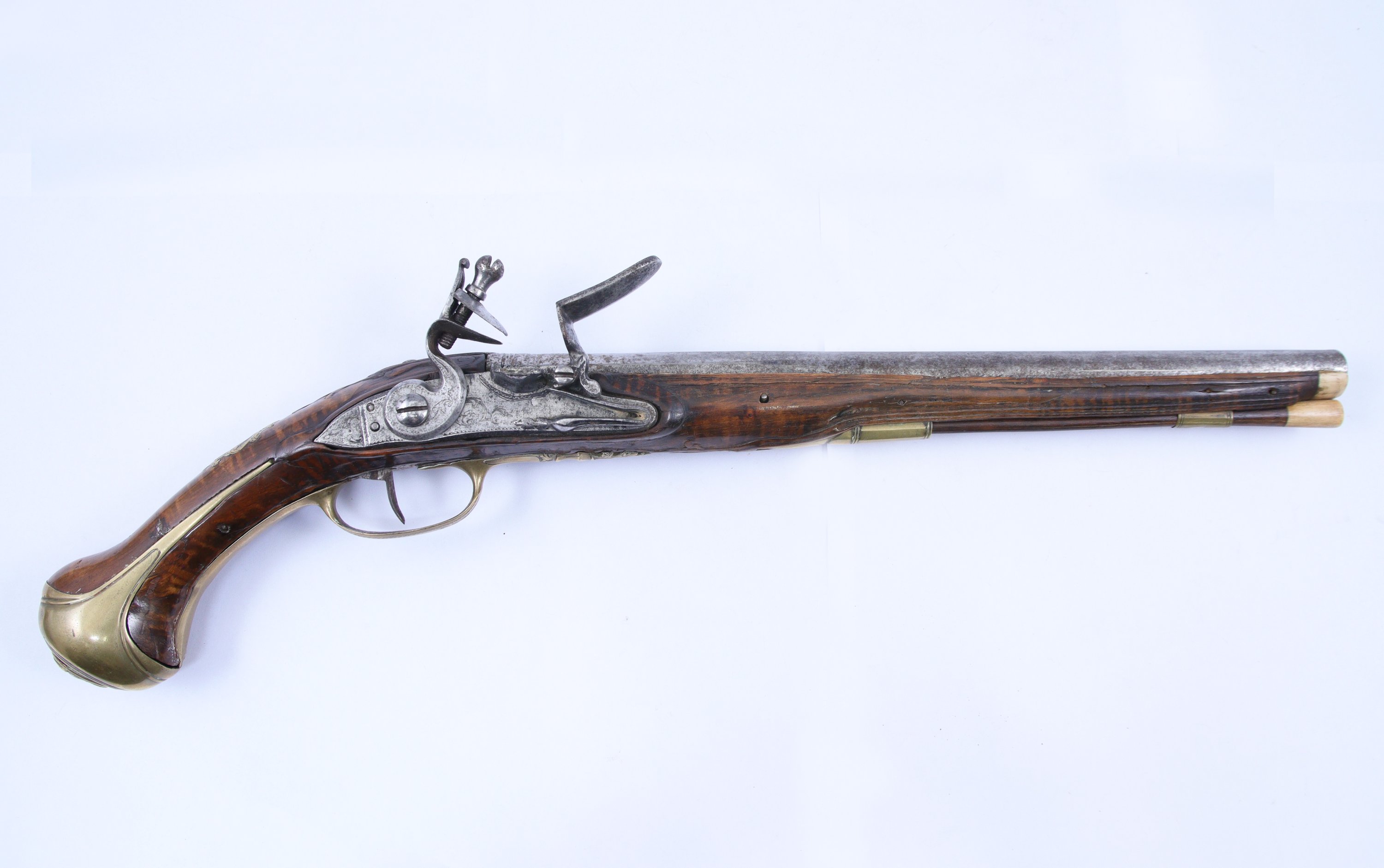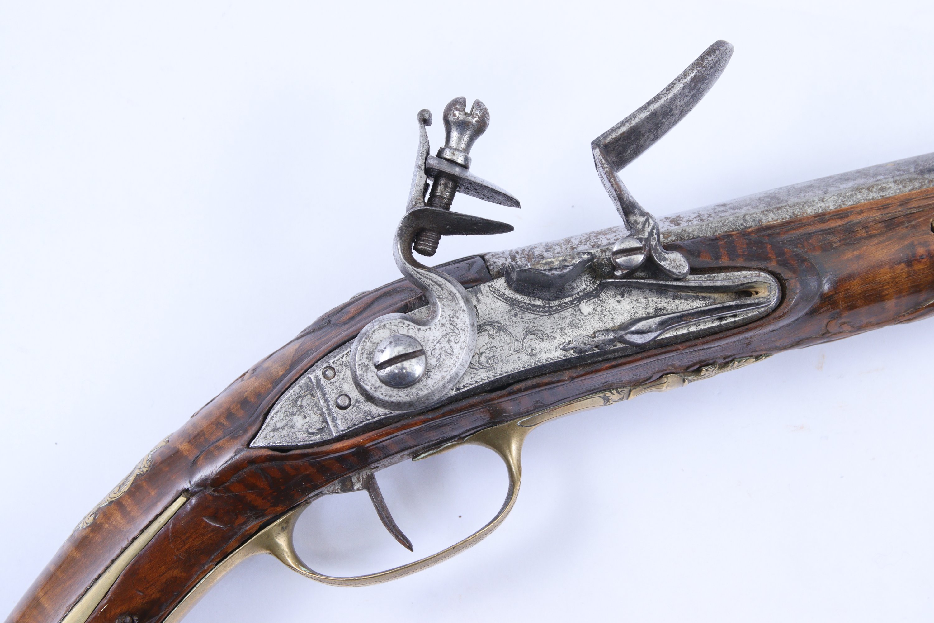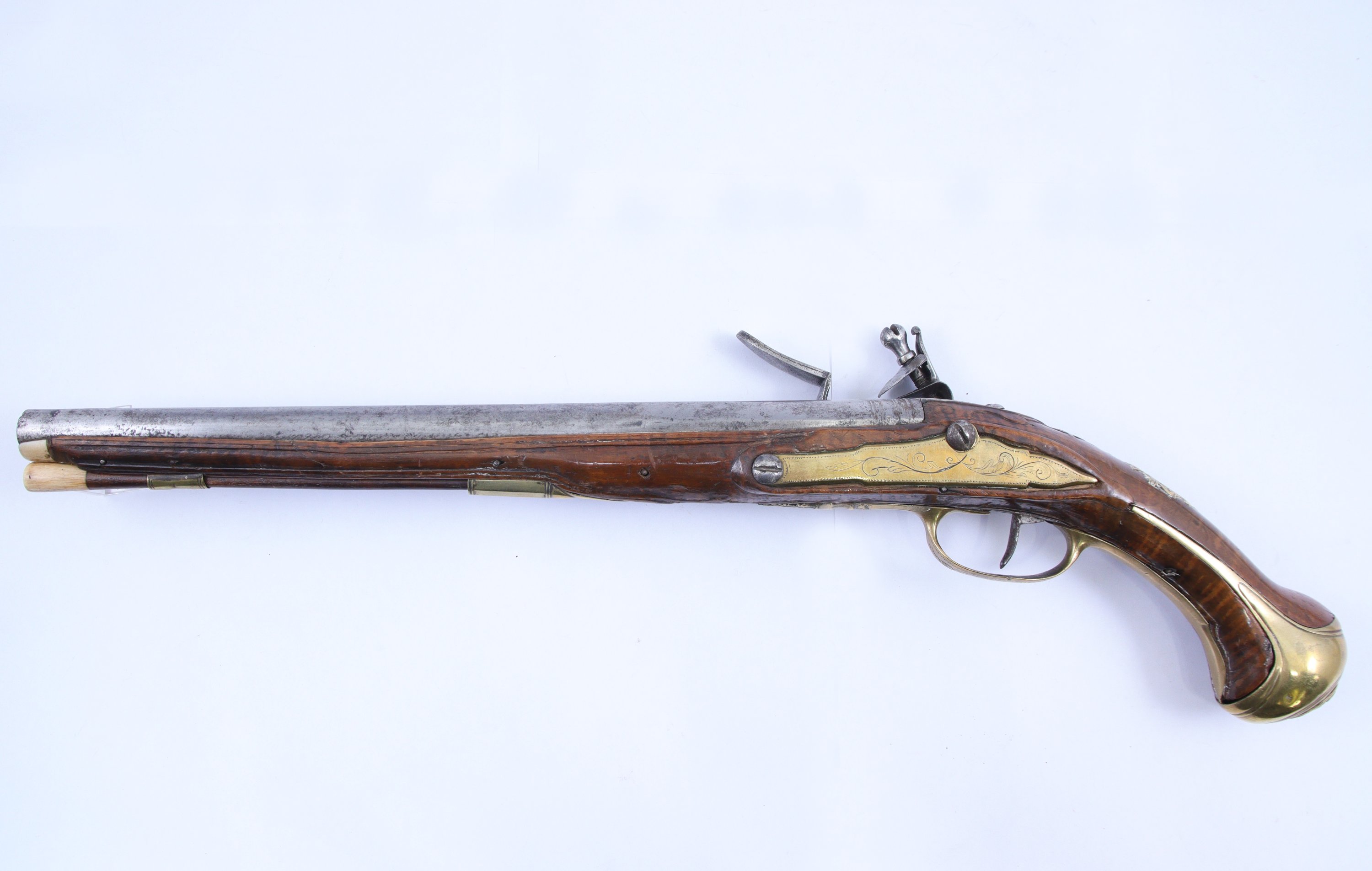 Canon rond à méplats au tonnerre. Platine et chien col de cygne à corps plats, gravés de rinceaux feuillagés. Garnitures et pièce de pouce en laiton découpé et gravé, calotte à longues oreilles.