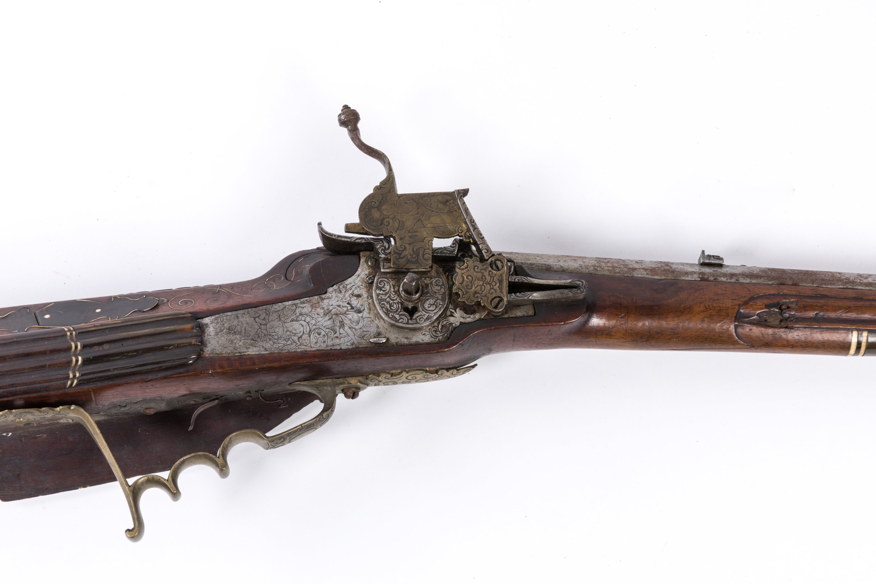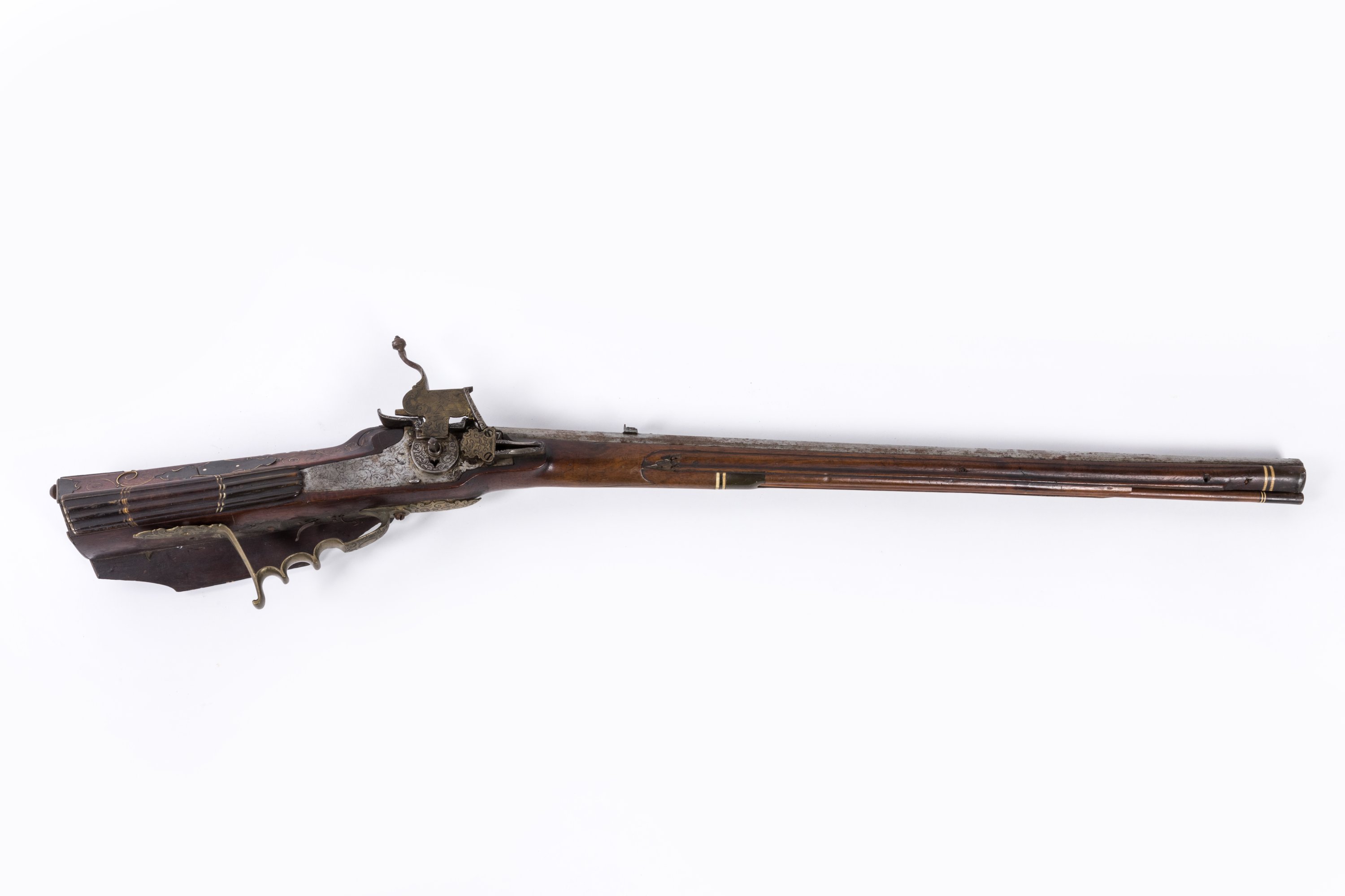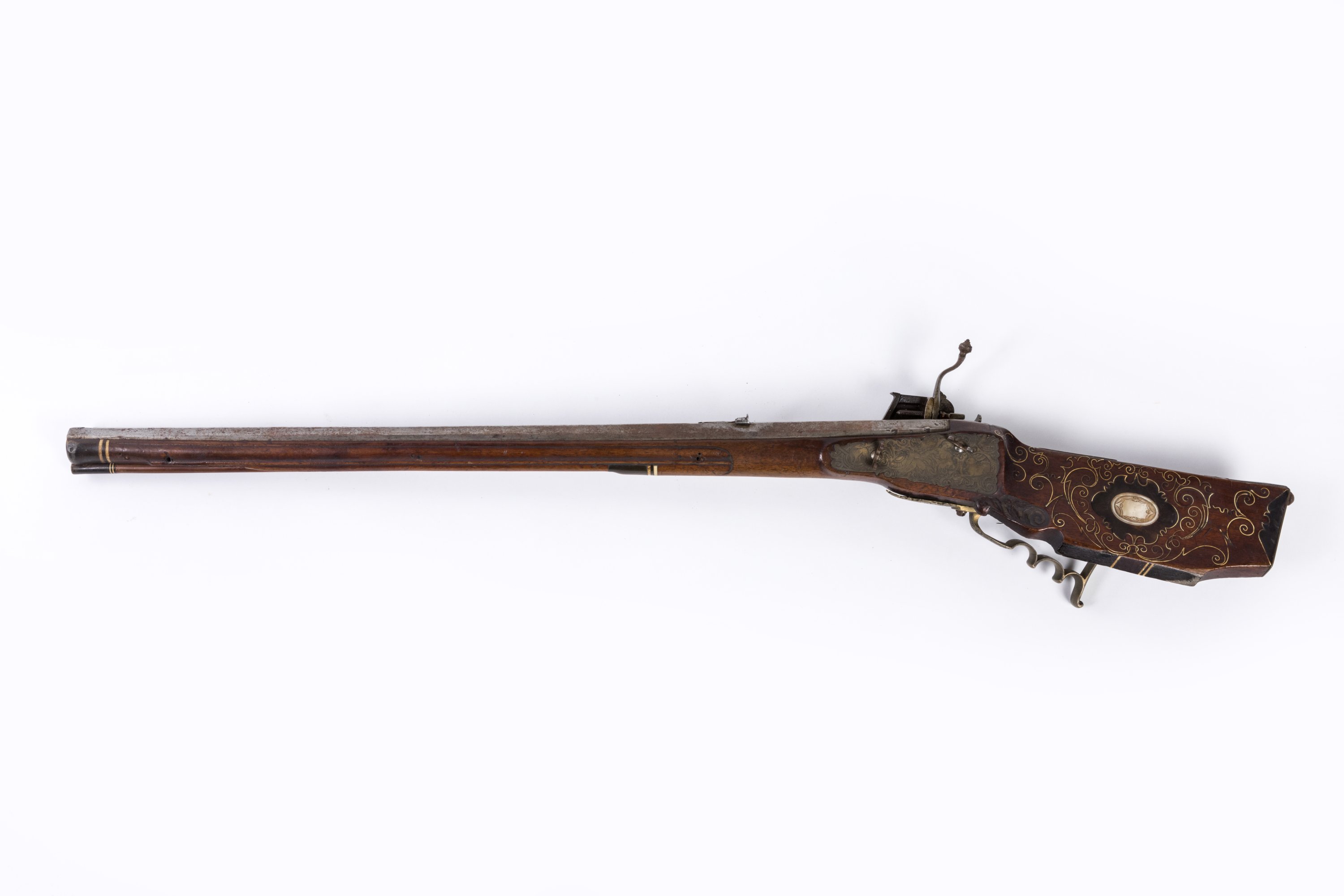 Canon à pans, rayé, avec hausse à feuillets, traces de signature au pointillé. Entures à la queue de platine. Platine à rouet, démontable à la main, gravée d’une divinité sur son char et de rinceaux feuillagés. Chien recouvert d’une plaque de laiton gravé d’une allégorie de la Justice. Fût à embout en corne et fils d’os. Contre-platine en laiton gravé d’une femme alanguie, angelot et chiens dans un encadrement de rinceaux. Double détente (une tordue). Pontet en laiton (manque une vis). Crosse à pans, décor d’incrustations de fils de laiton, tiroir de crosse en corne.
