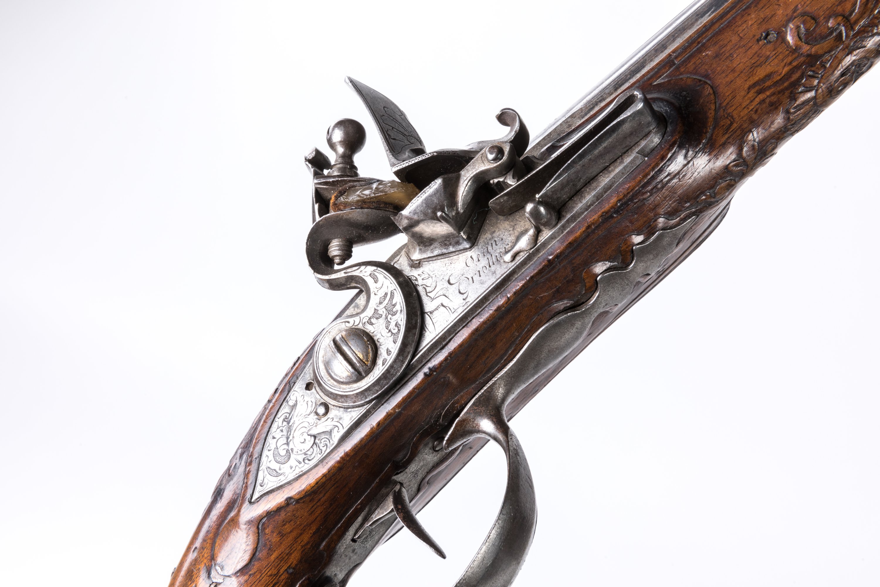 Canons ronds à méplats sur les dessus. Platines signées « JEAN GRIOTTIER » et chiens col de cygne à corps plat, gravés de rinceaux. Garnitures en fer ciselé (une contre platine anciennement changée). Pièces de pouce en argent, sous couronne de marquis (vierge). Montures en noyer (enture à l’avant de l’un des fûts).