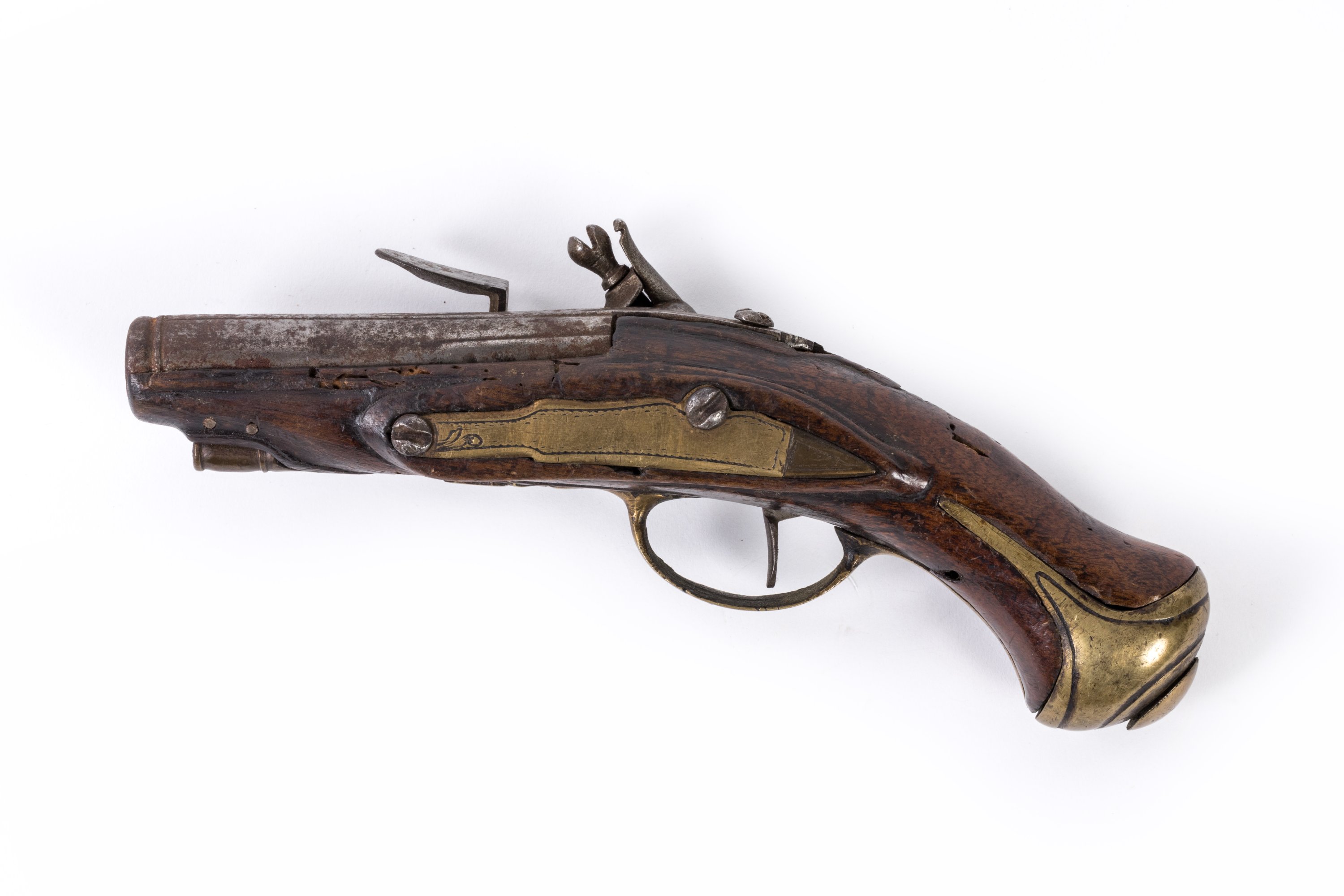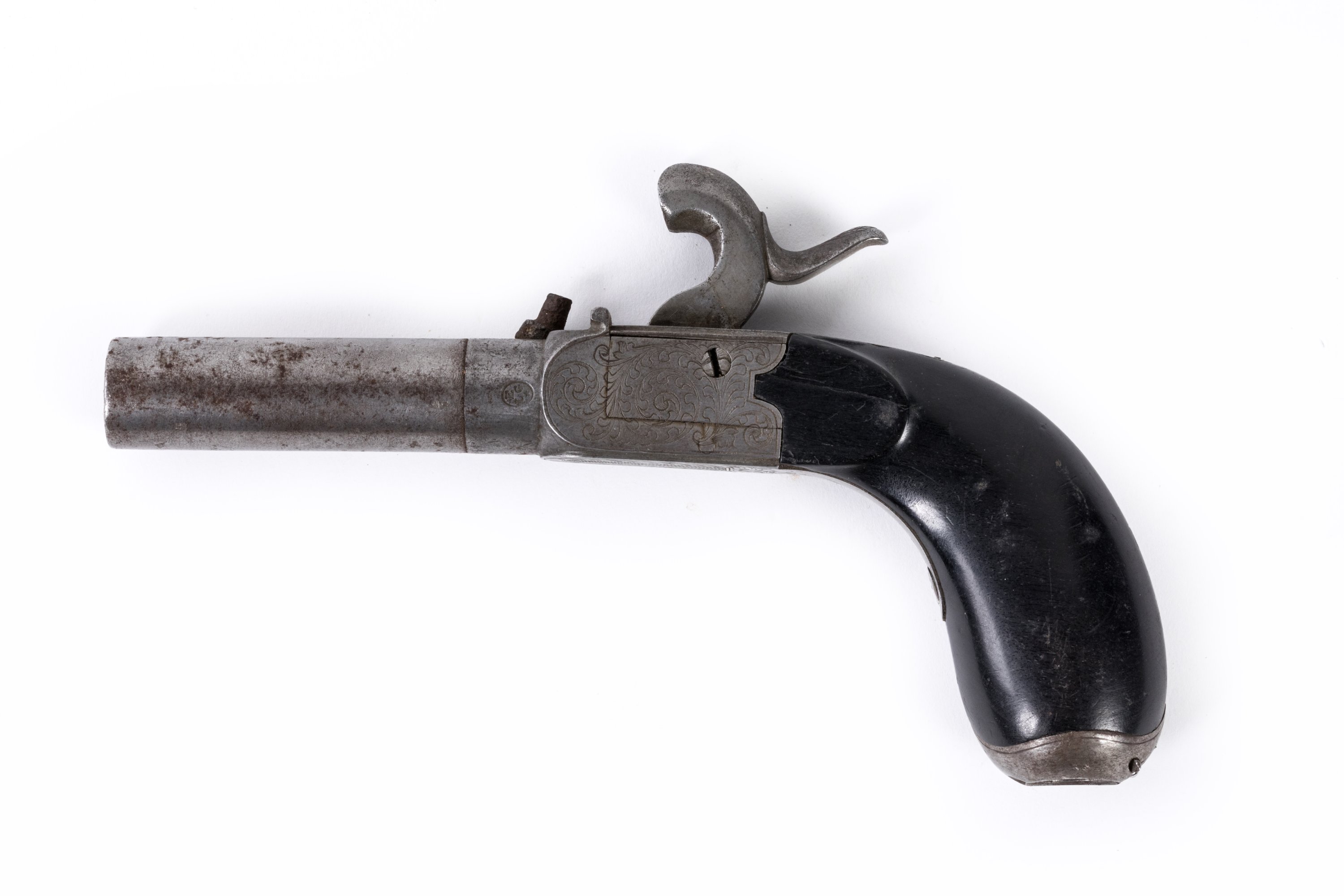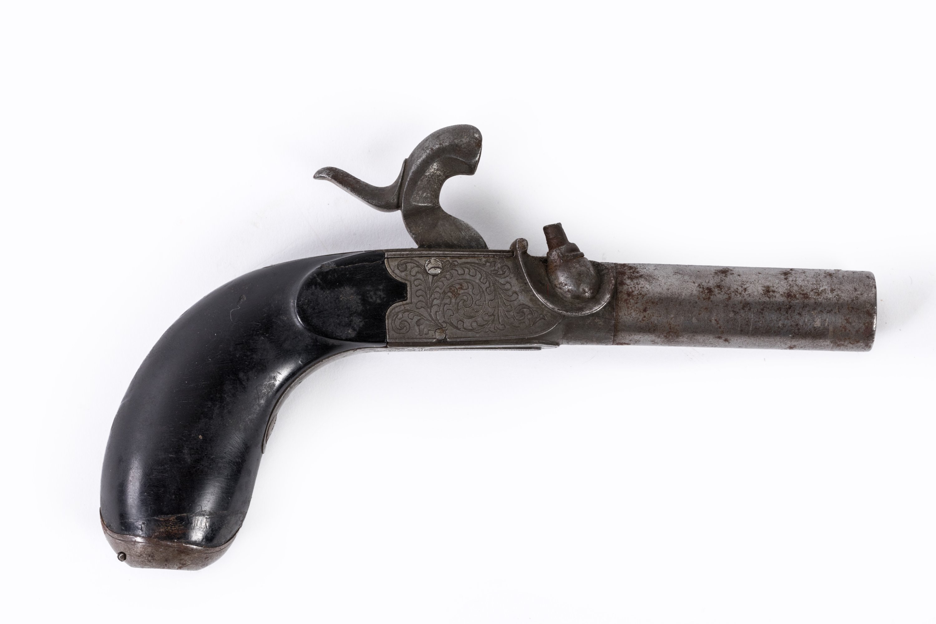 Joint: un pistolet à coffre à percussion. Crosse en ébène. Vers 1840 (en l’état, accident mécanique, manque la portière).