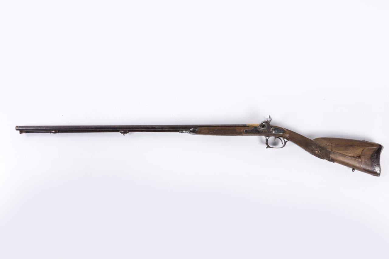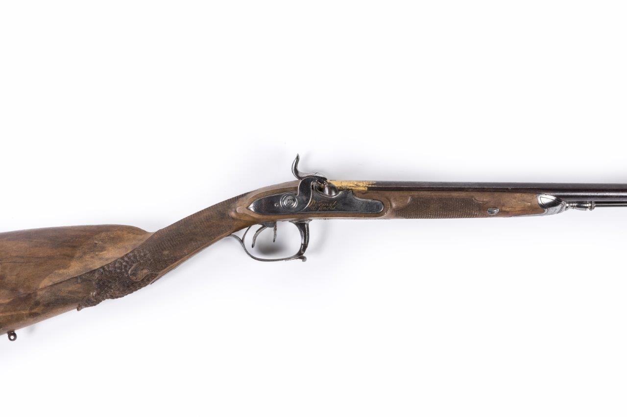 Pontet en fer ciselé d’une coquille, devant de pontet gravé d’une urne fleurie. Crosse à joue sculptée d’une hure de sanglier et en partie quadrillé. Baguette en fanon à embout laiton.
