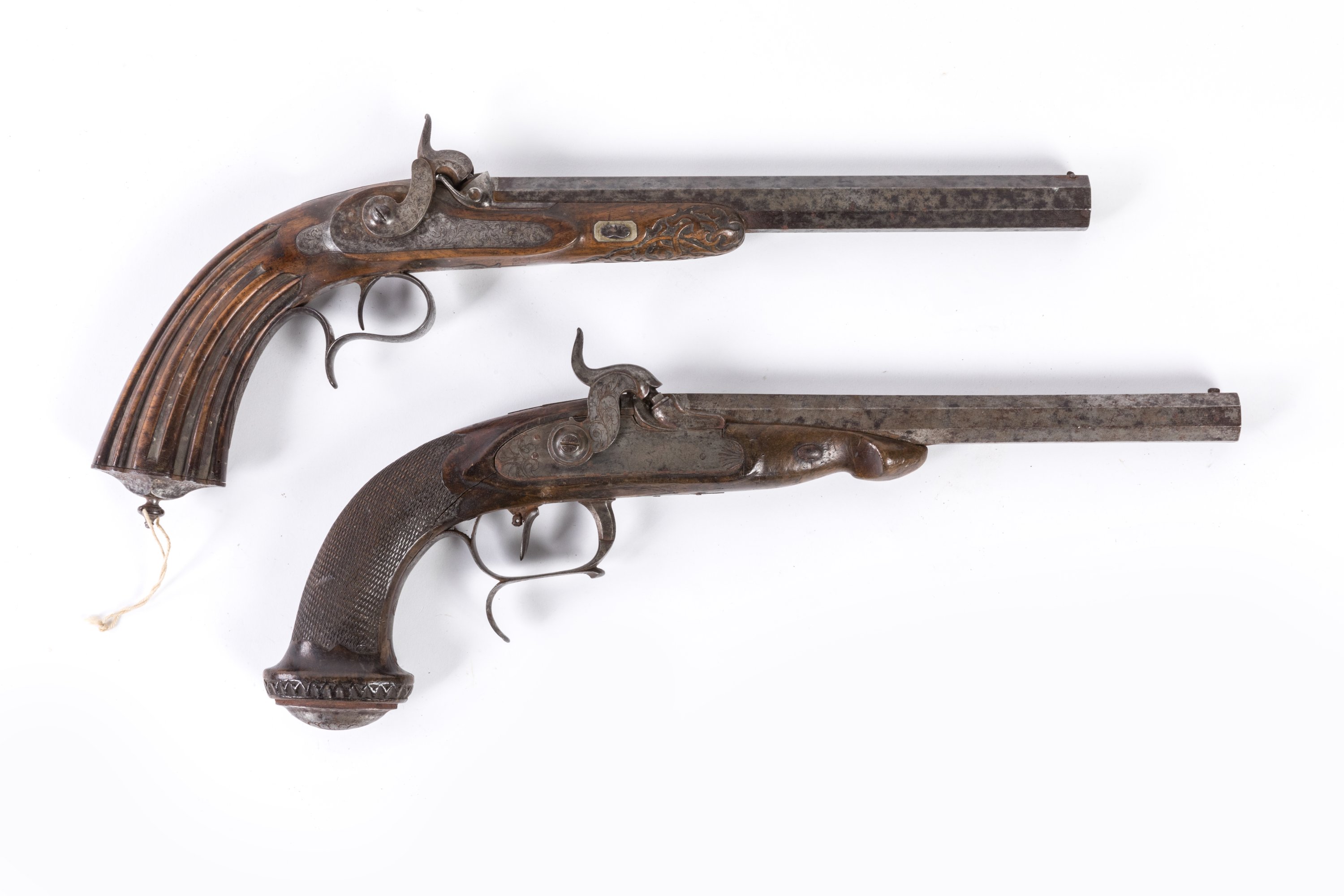 - Pistolet de duel. Canon à pans, rayé, numéroté 2 à l’or au tonnerre. Platine et chien et garnitures gravées de rinceaux. Crosse en noyer sculpté.