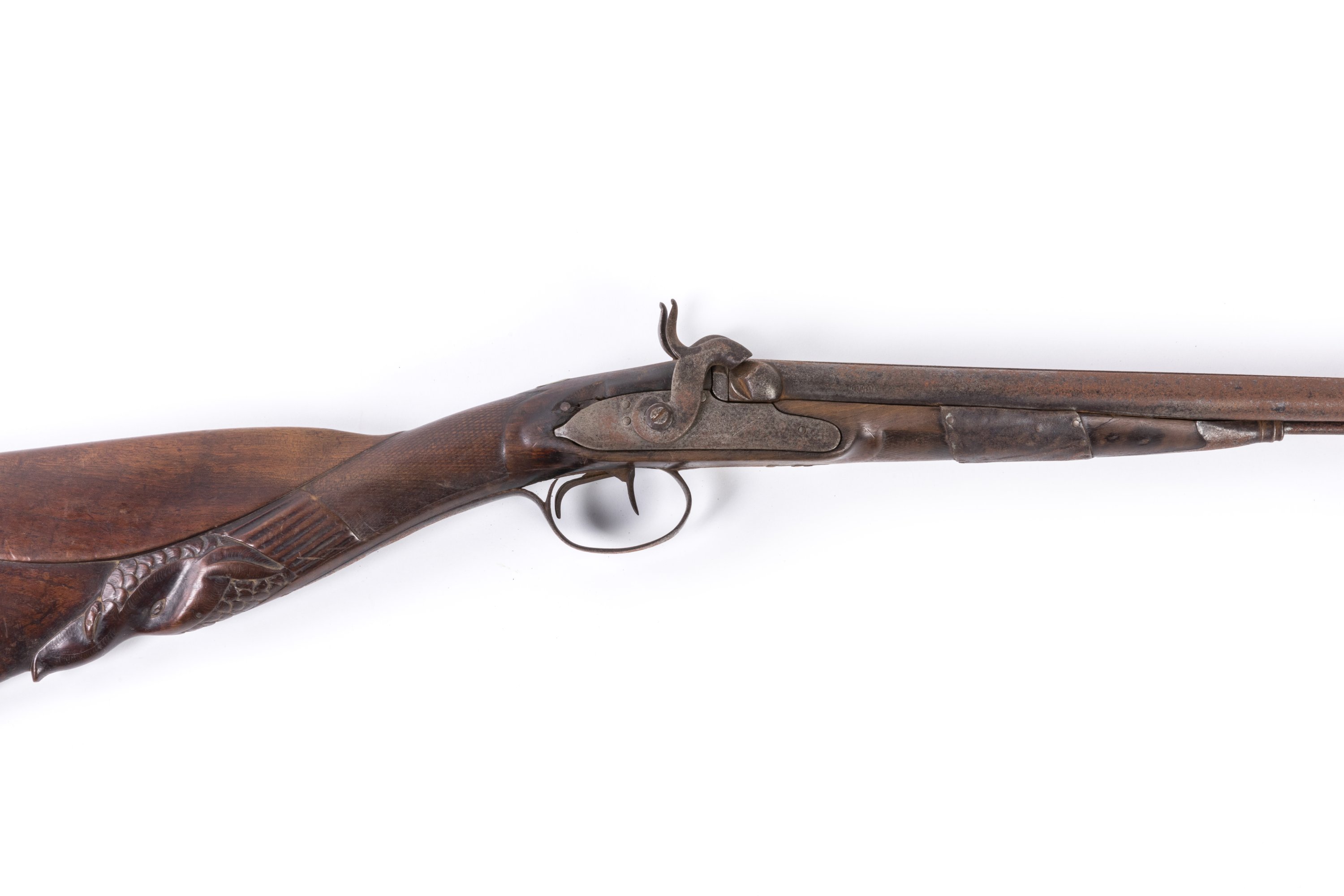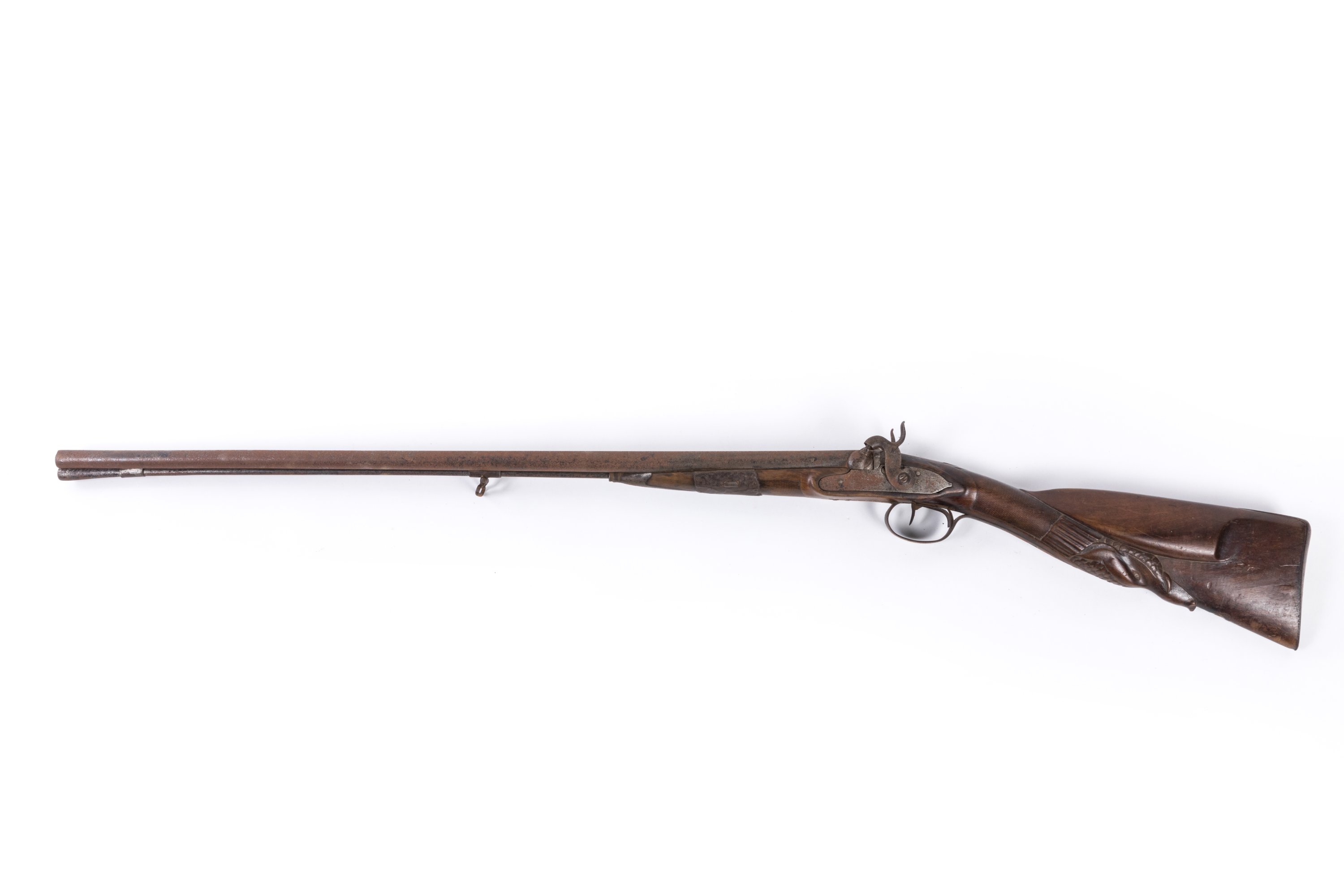 Garnitures en fer. Crosse sculptée d’une hure de sanglier (réparation à l’avant du fût). Baguette en fer.