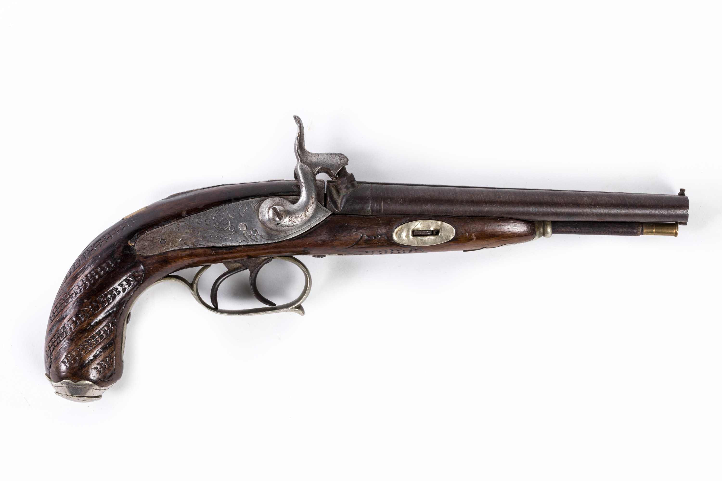 Canons en table. Garnitures en métal blanc. Platine avec restes de signature « RIO DE JANEIRO ». Crosse en noyer avec pastille aux armes brésiliennes.