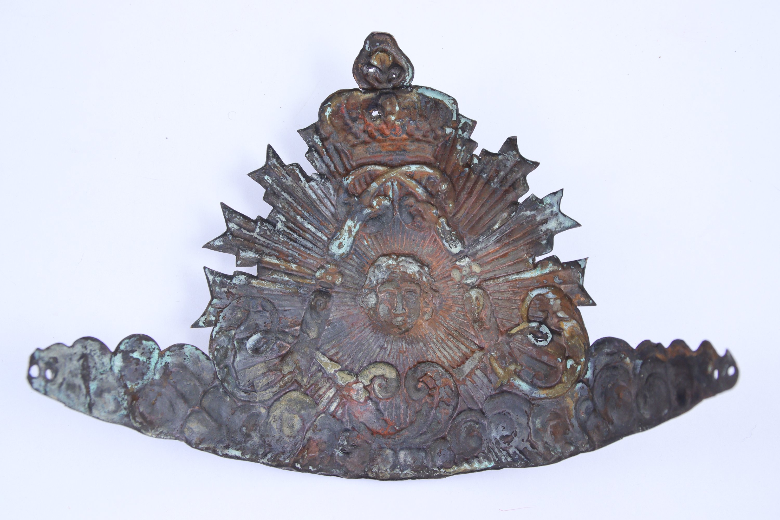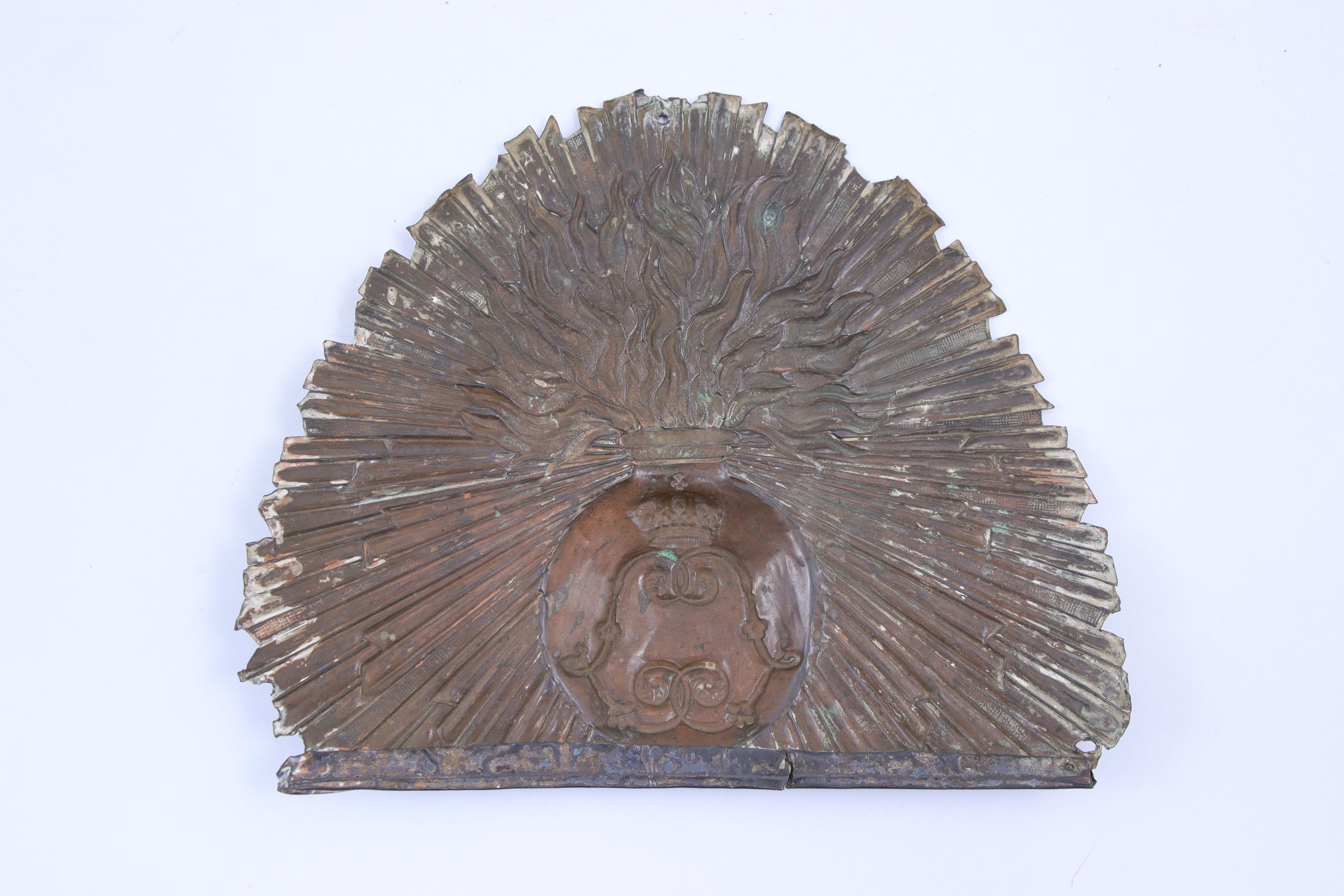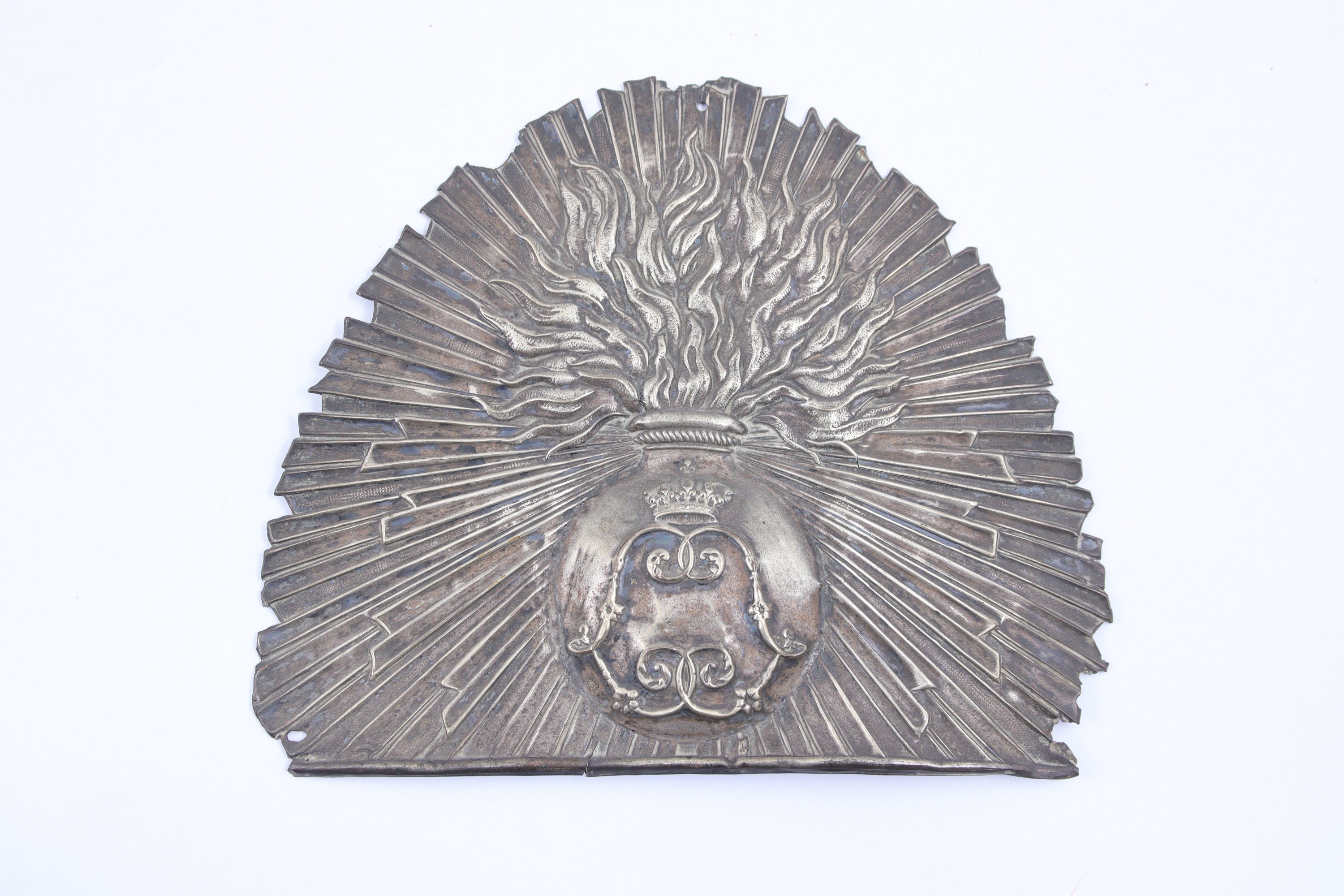 - Plaque de bonnet à poil de sous-officier de la Garde nationale, en cuivre estampé argenté. Règne du Roi Louis XVIII - Epoque Restauration. A.B.E (petit manque en partie droite).