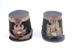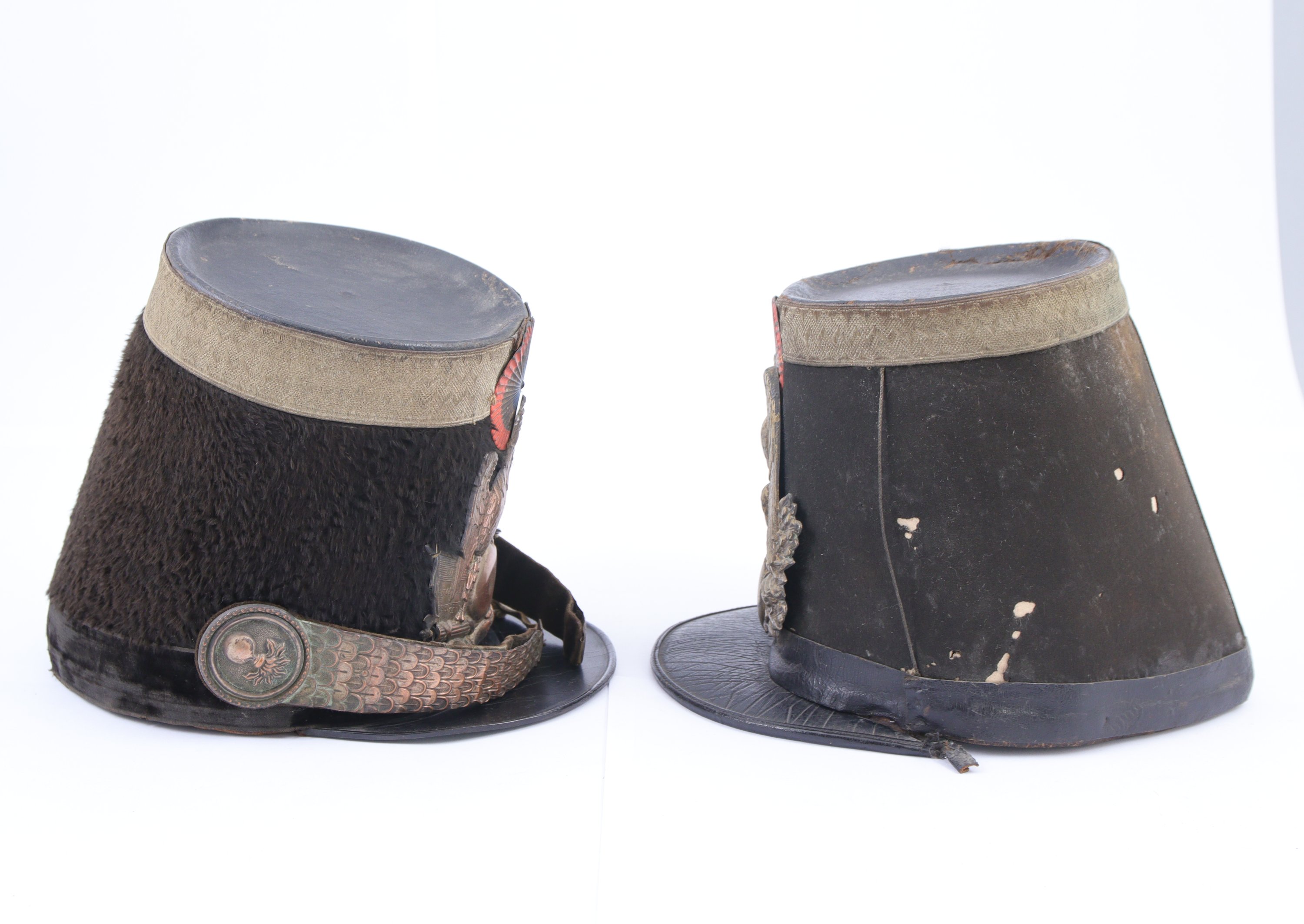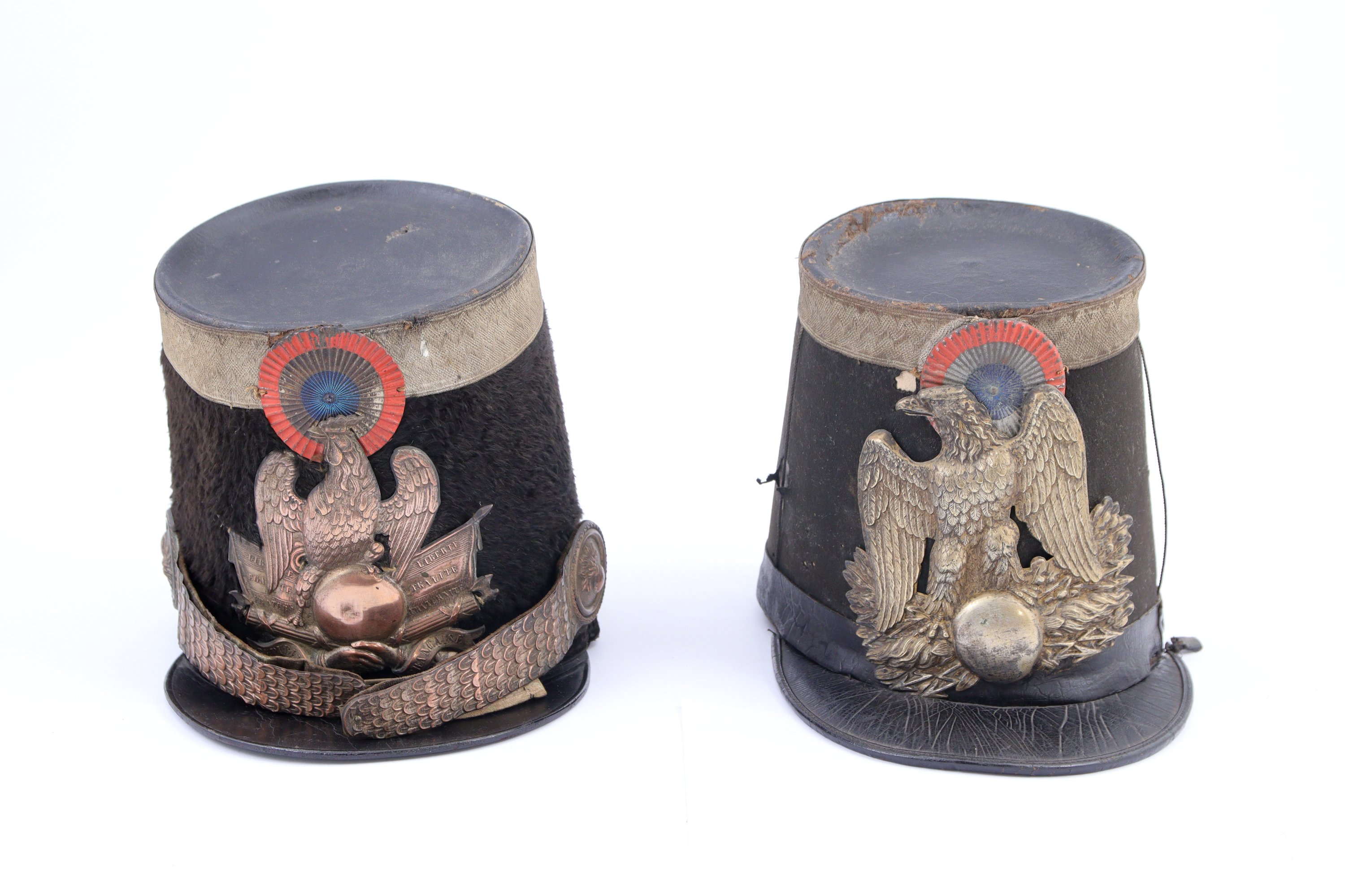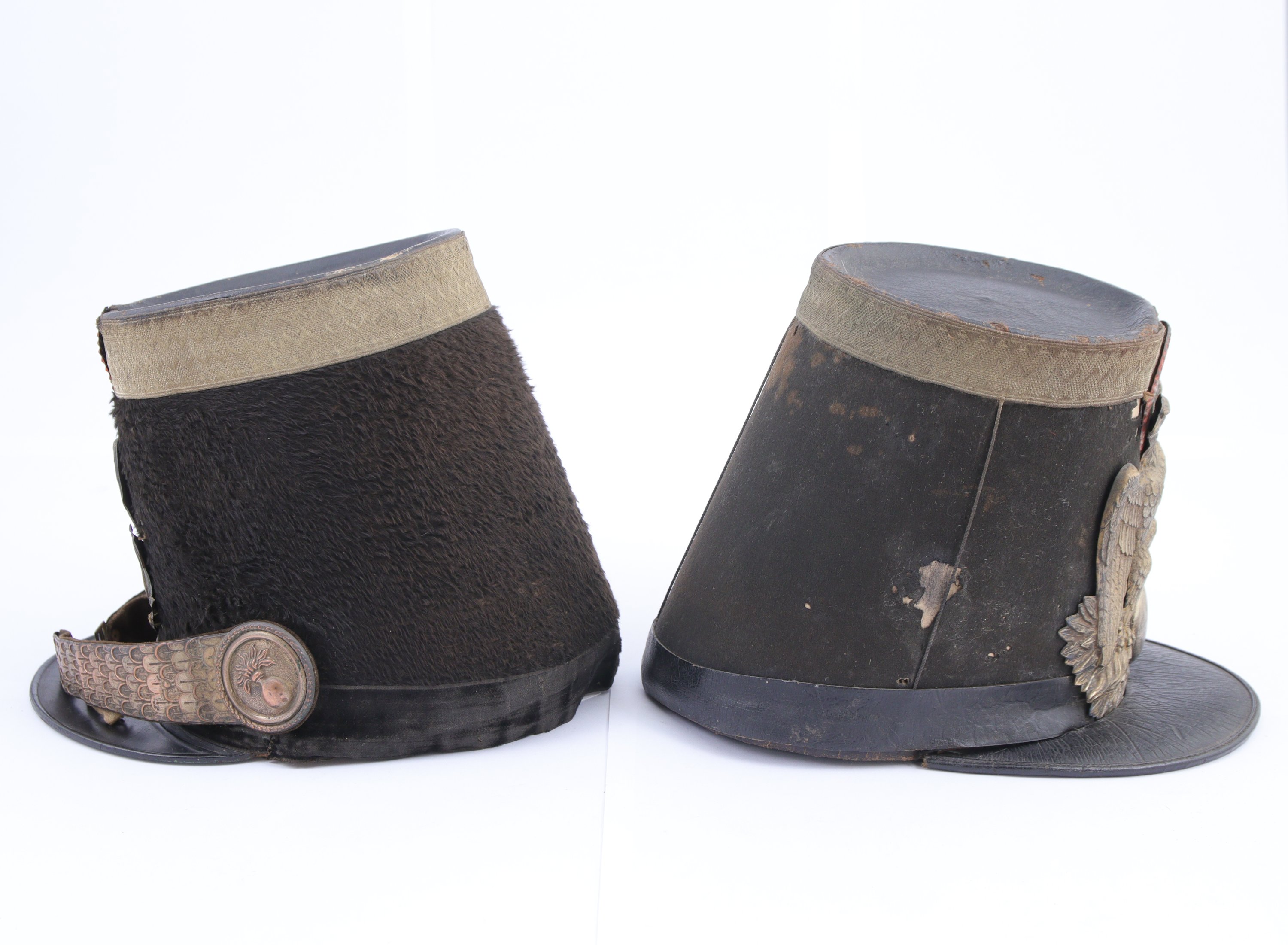 - D’officier. Fut recouvert de feutre, à galon « lézarde » en passementerie argent. Plaque et jugulaires à fausses écailles, argentées. Coiffe intérieure. Epoque Monarchie de Juillet. A.B.E. (petits accidents). Cocardes métalliques tricolores.
