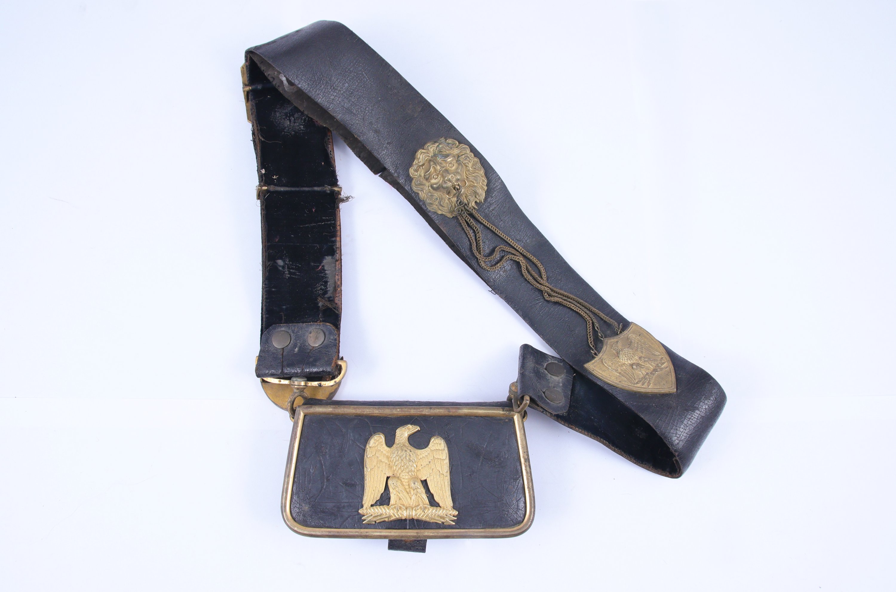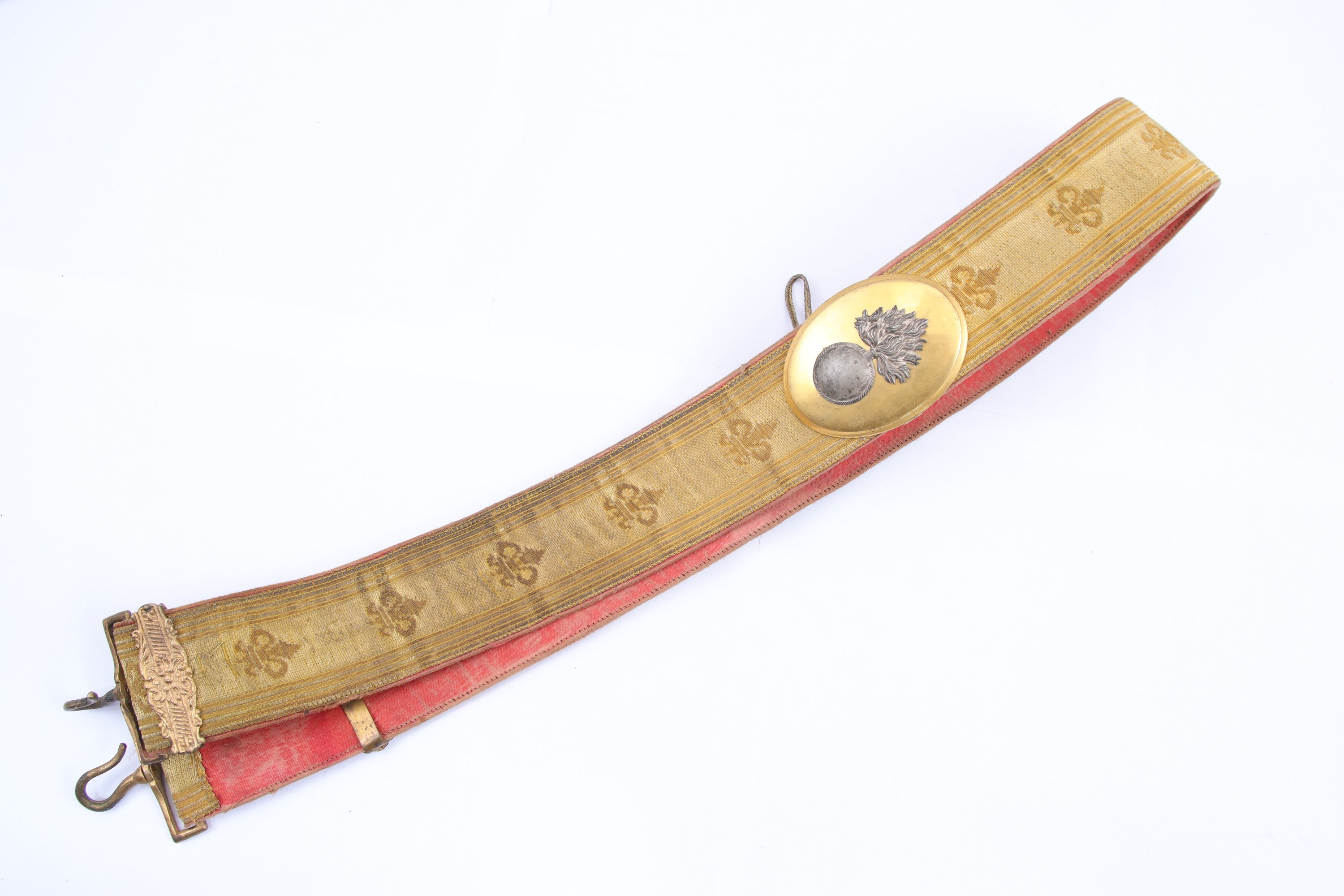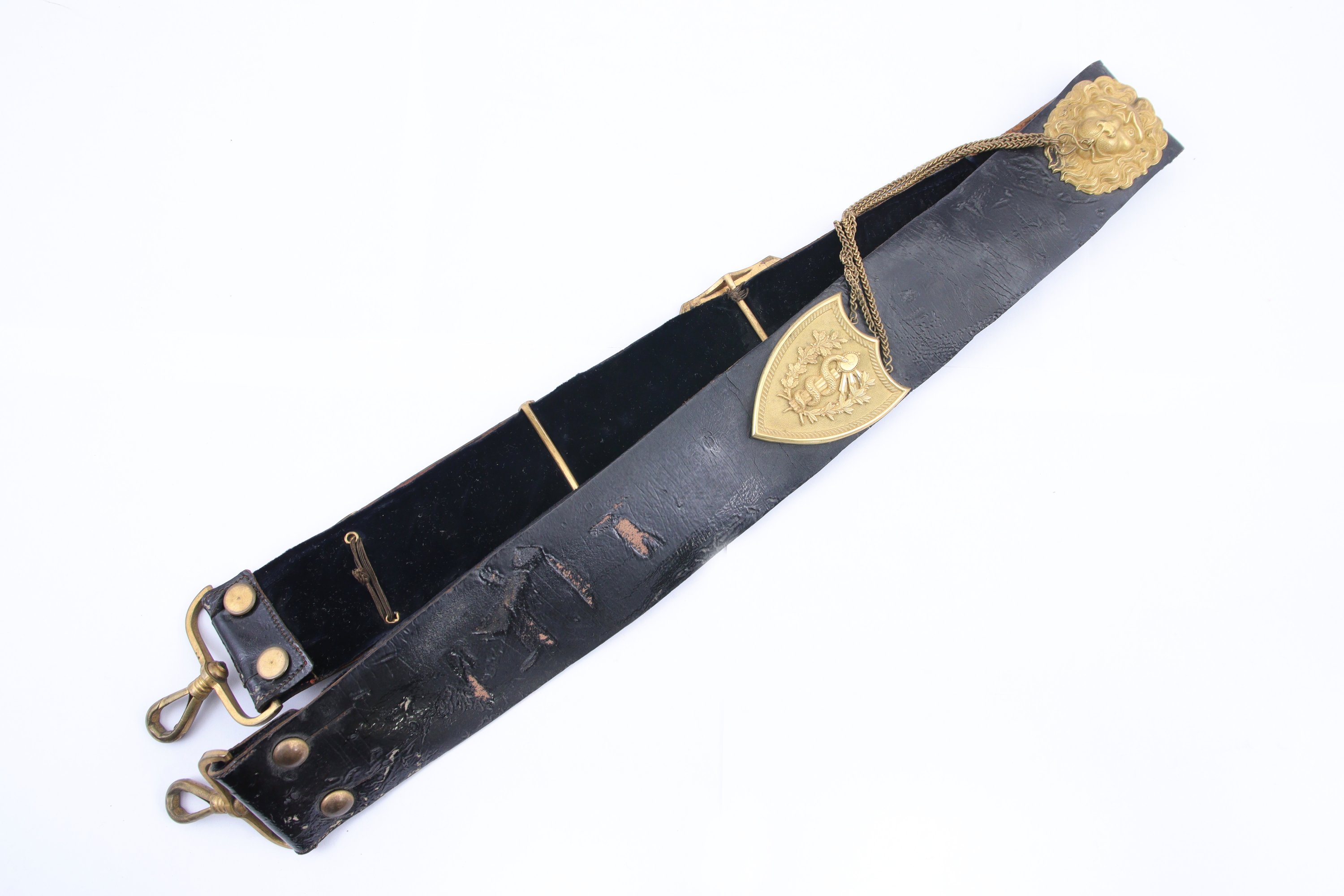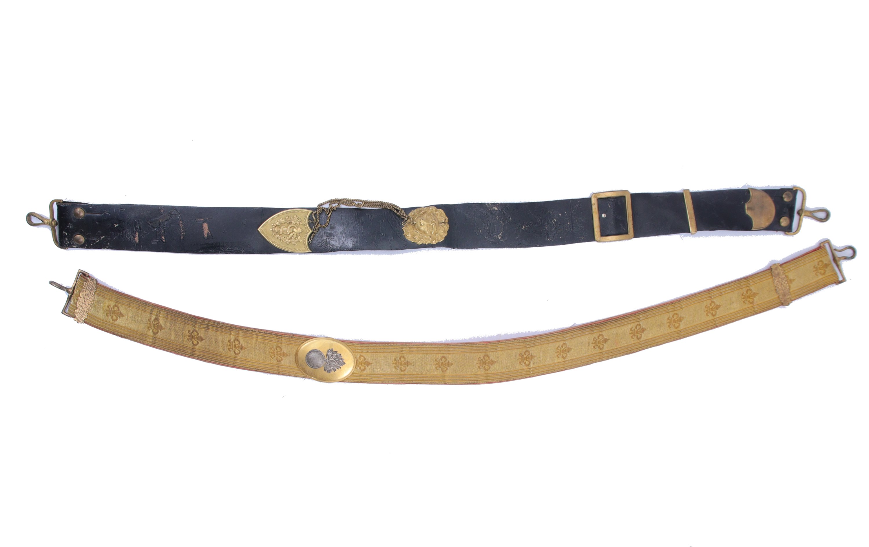 Joints: Deux banderoles. L'une d’officier de service de santé, en cuir noir à motifs en laiton doré, IIIe République ; l'autre d’officier espagnol, recouverte de galon doré à motif de fleurs de lys, doublée de soie rosée, garnitures en laiton à motif de grenade argentée. Fin du XIXe siècle.