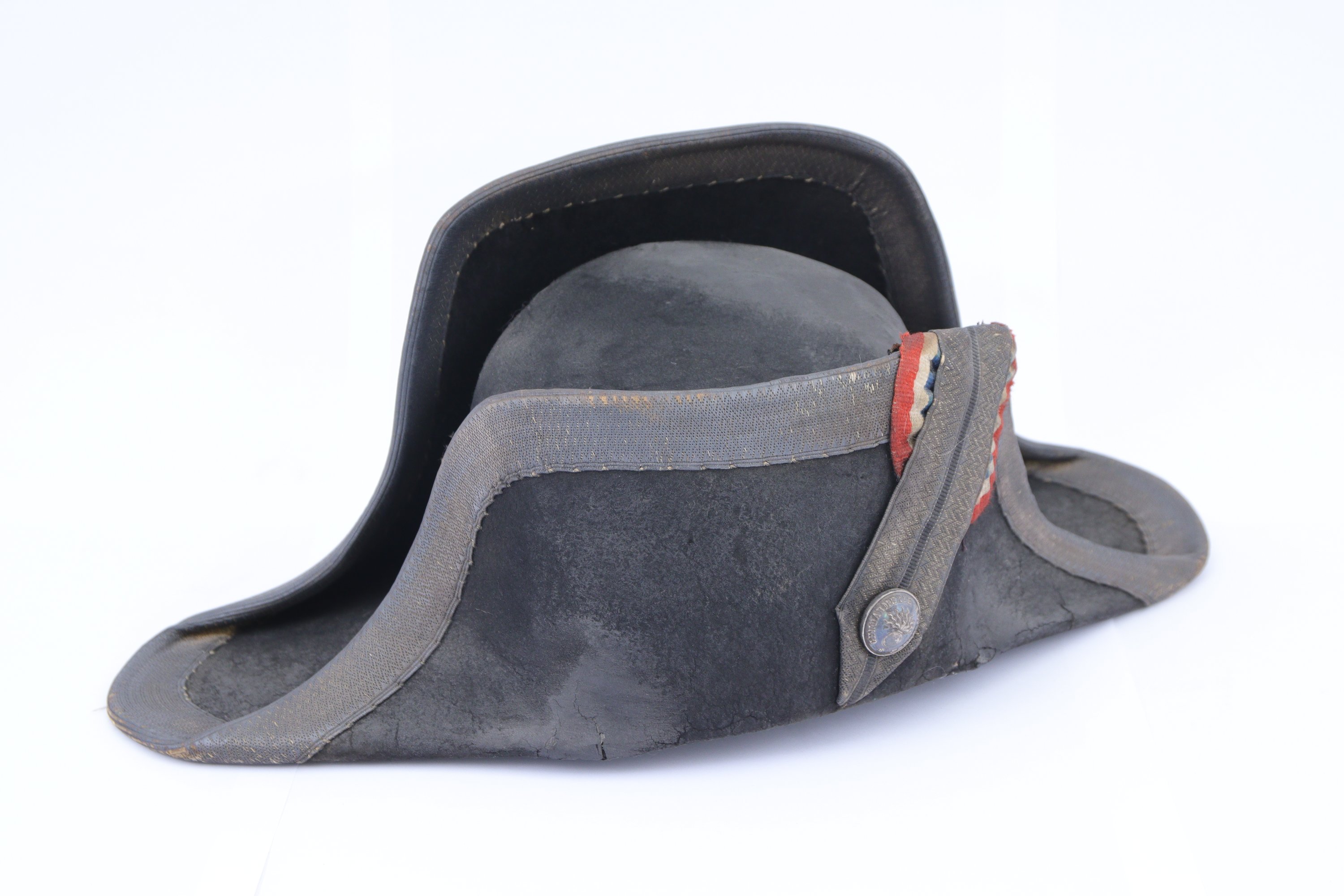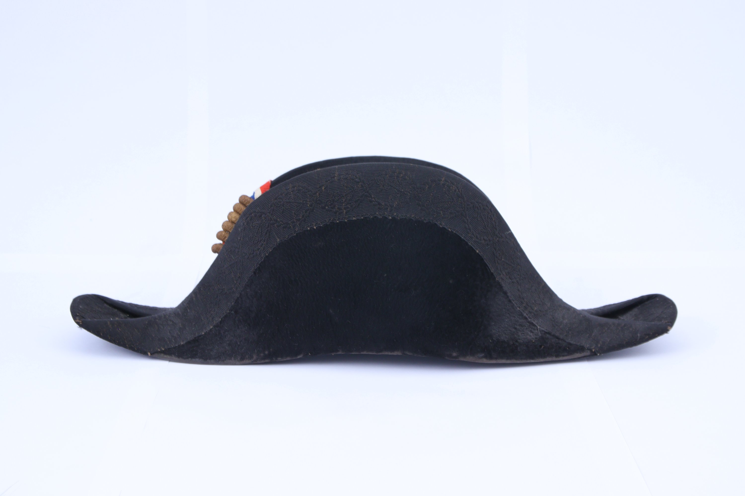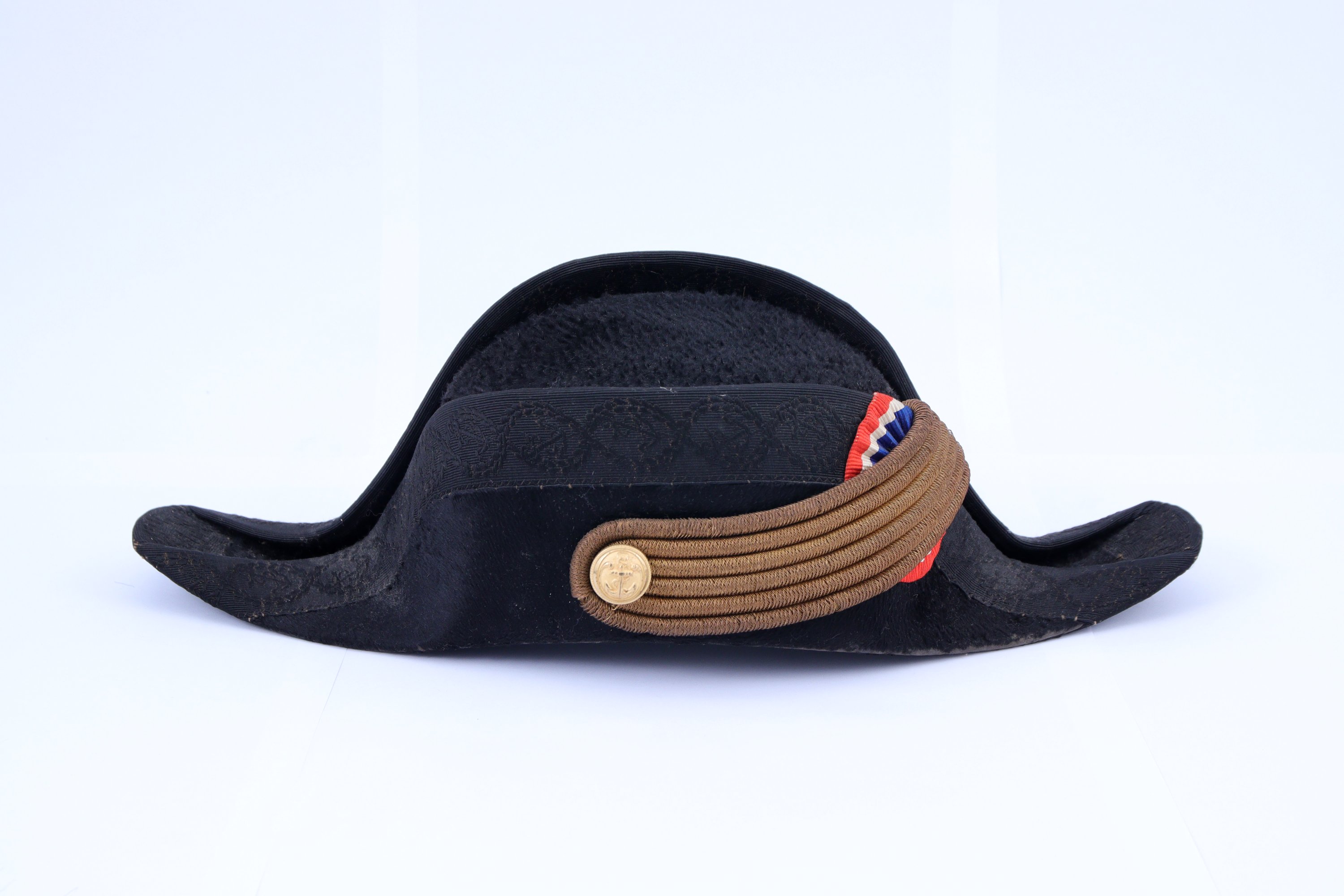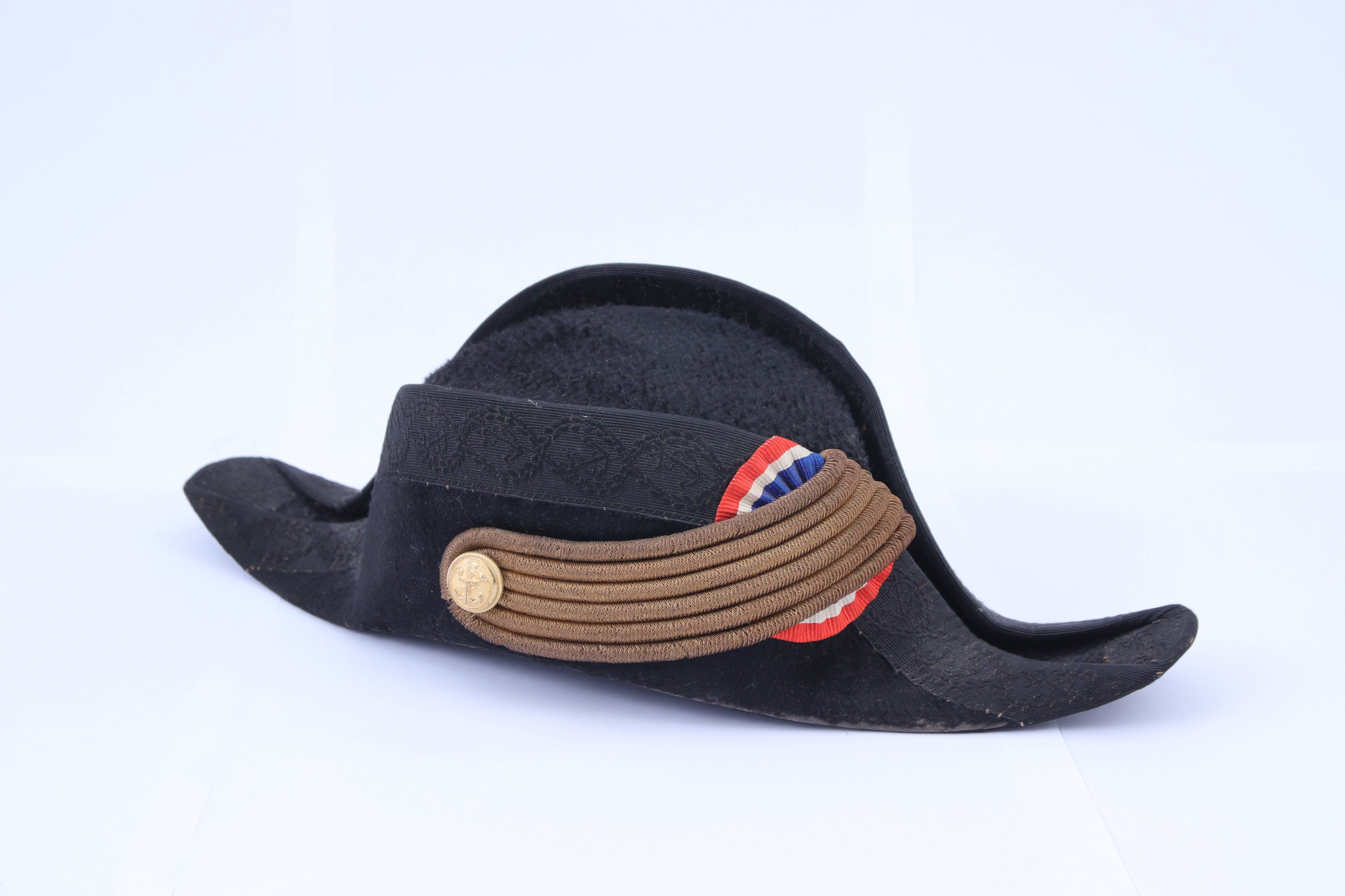 - Bicorne d’officier de marine. En feutre taupé. Ganse en passementerie et bouton à l’ancre, dorés. Galon en passementerie noire à décor d’ancre. Coiffe intérieure en satinette bleue, à motifs en laiton doré « AB » et bandeau en cuir. IIIe République. A.B.E.