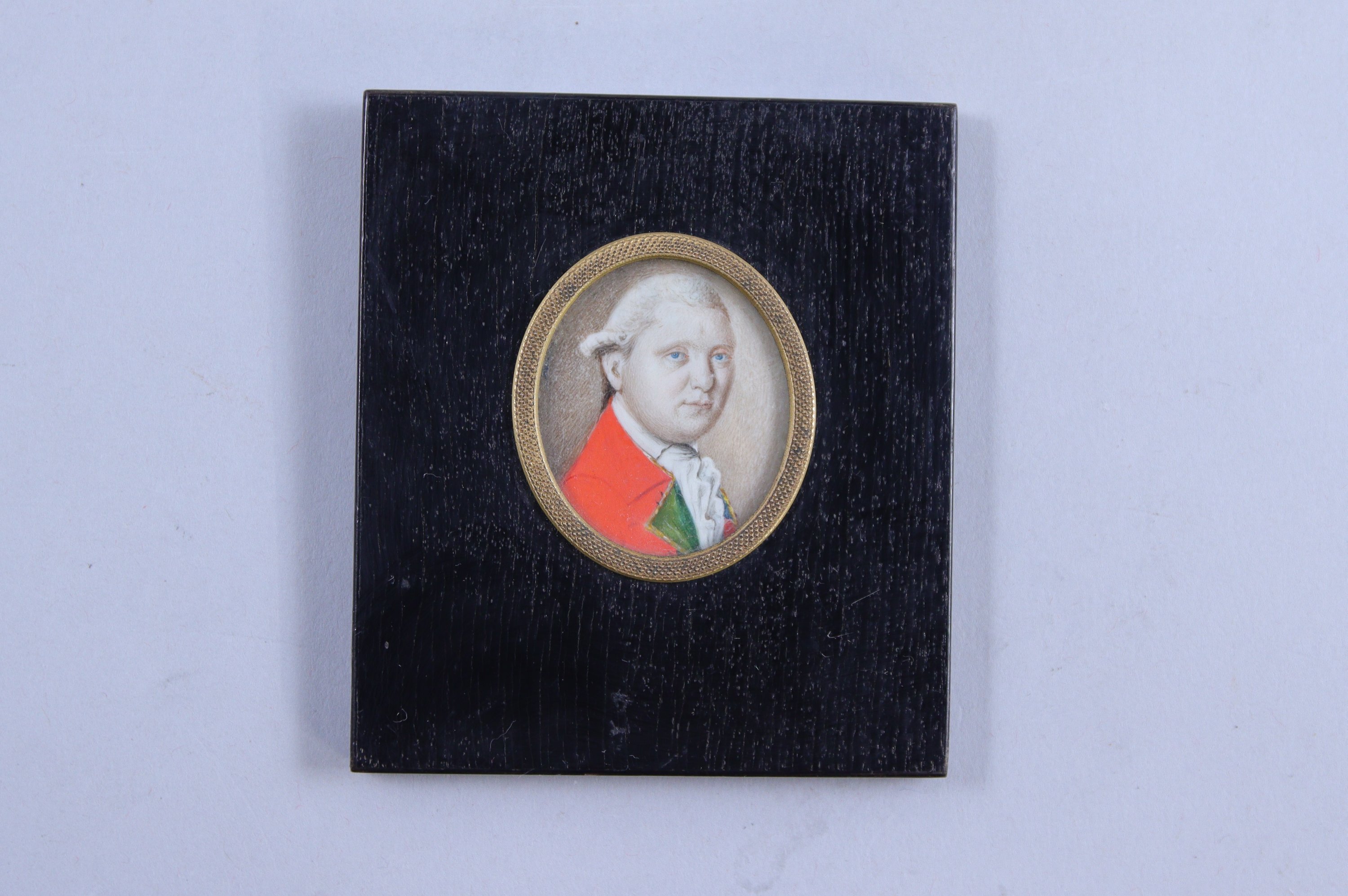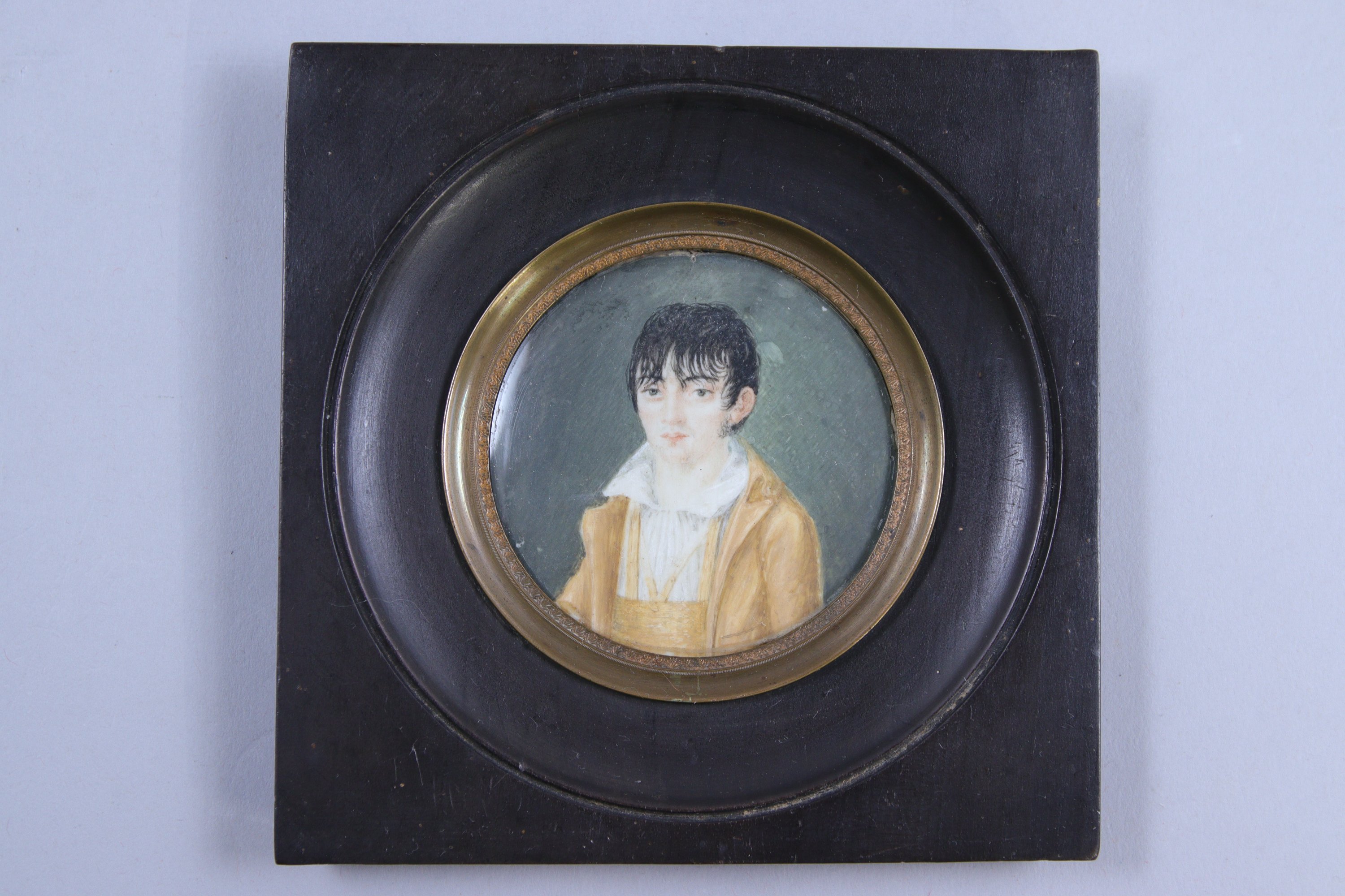 Joint: Ecole française du XIXe siècle, Portrait d'homme à la veste brune. Miniature. Diam. 6,8 cm. Dans un cadre en bois noirci cerclé de laiton. Haut. 12,5 Larg. 12,5 cm.