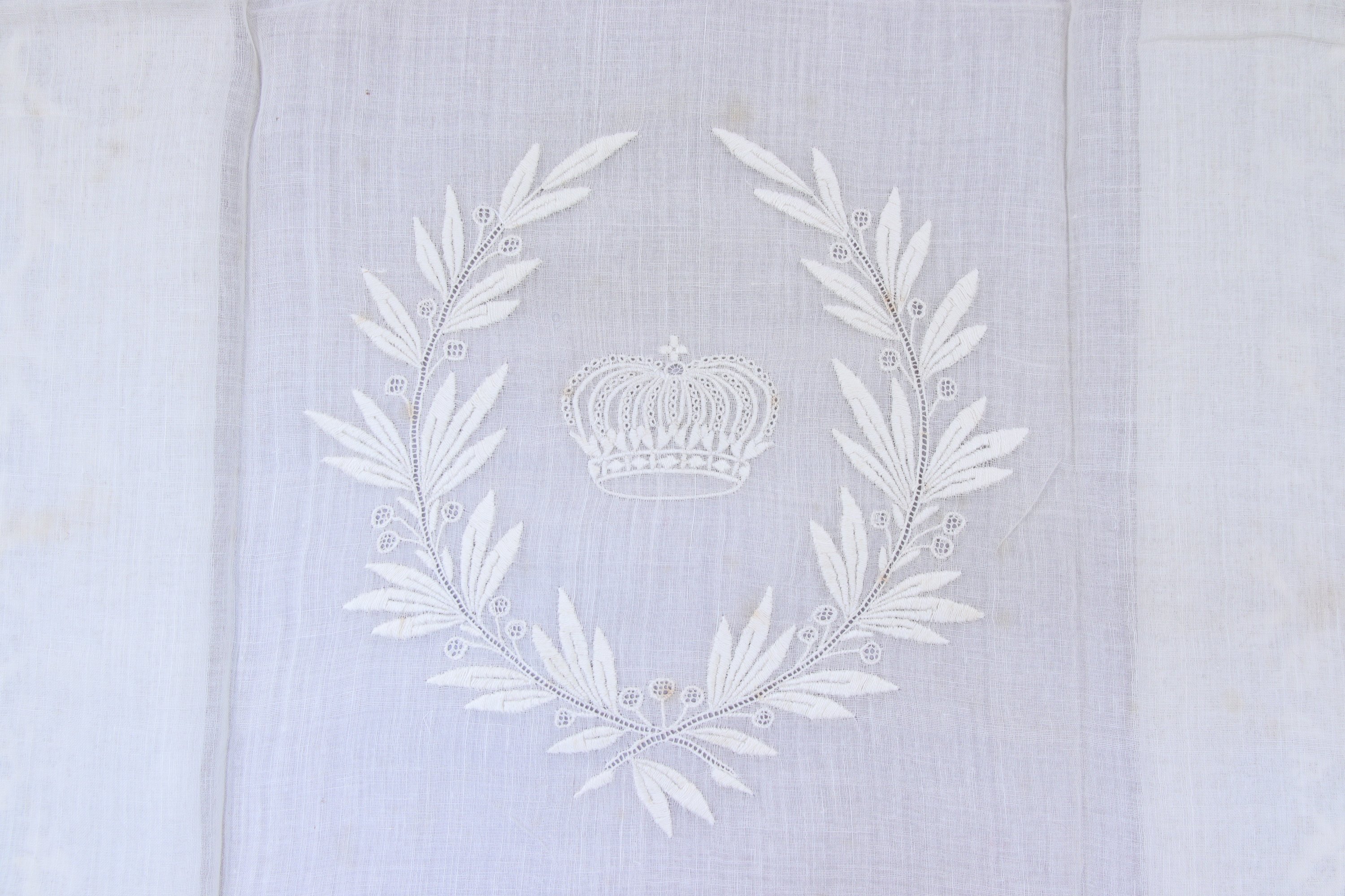 -Un dessus de berceau en batiste, brodé en bordure d’une frise végétale en fil et au centre d’une couronne impériale dans une couronne de lauriers.