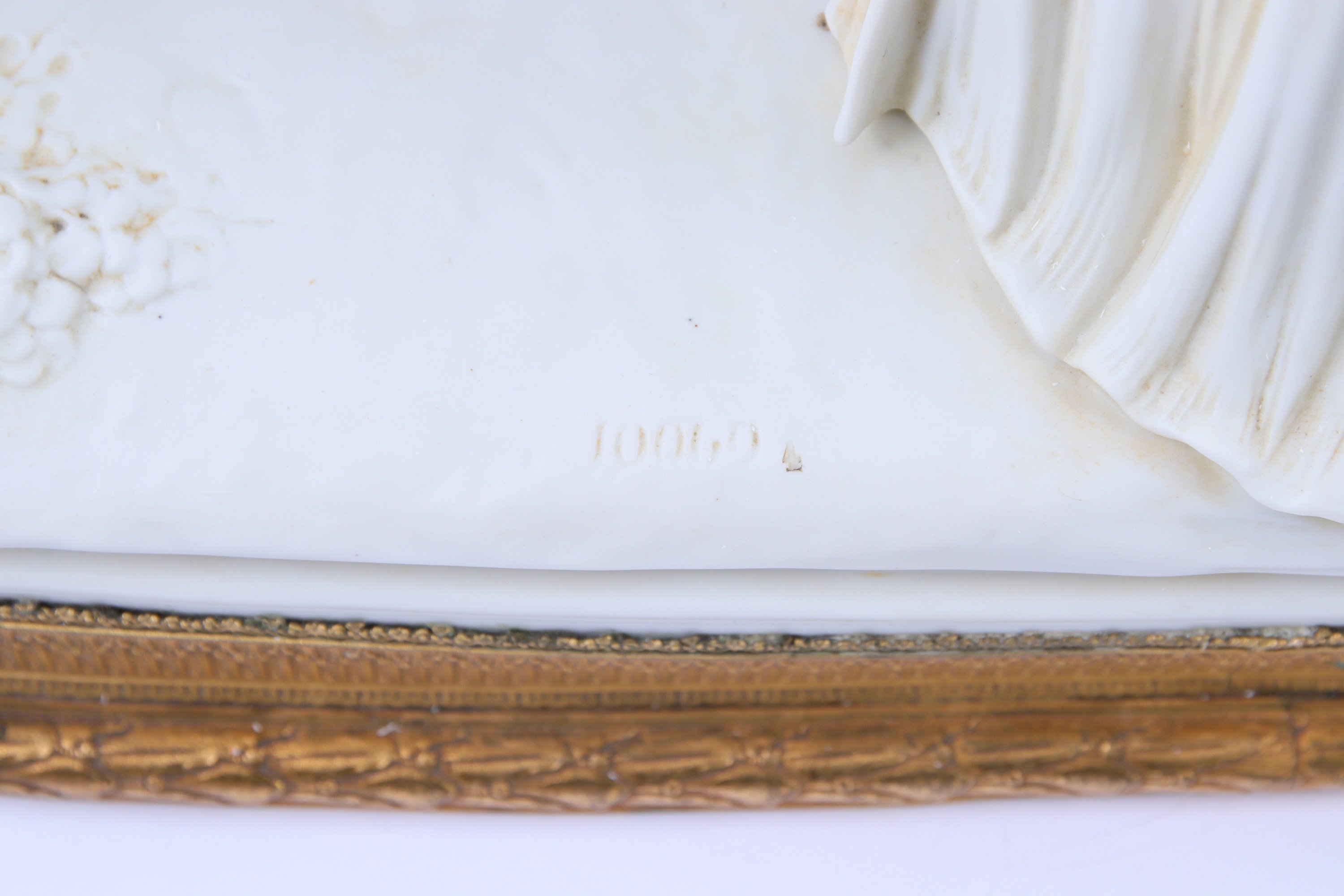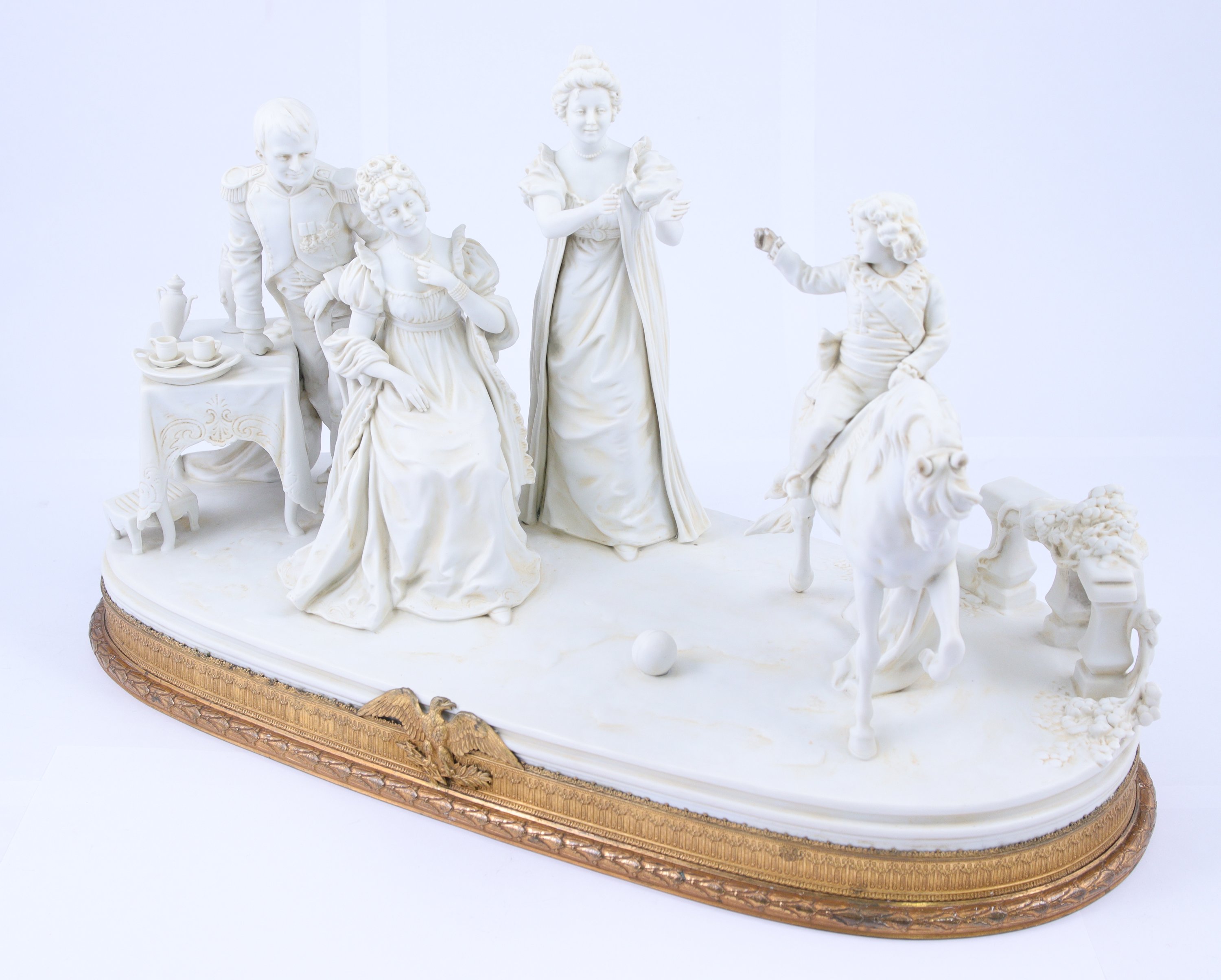 La propagande impériale ne manque pas de vieillir le jeune Roi de Rome à dessein, notamment lors de ses premiers cours d'équitation. Une estampe publiée chez Basset entre 1813 et 1814 (Bnf) figure cet événement. Notre biscuit reprend cette image, mais l'inscrit dans un environnement familier, où l'Aiglon est entouré de son père et sa mère ainsi que de sa gouvernante, Madame de Montesquiou. Ainsi, il s'inscrit dans le courant du "genre historique", développé au milieu du XIXe, où la grande histoire se mêle à la petite.
