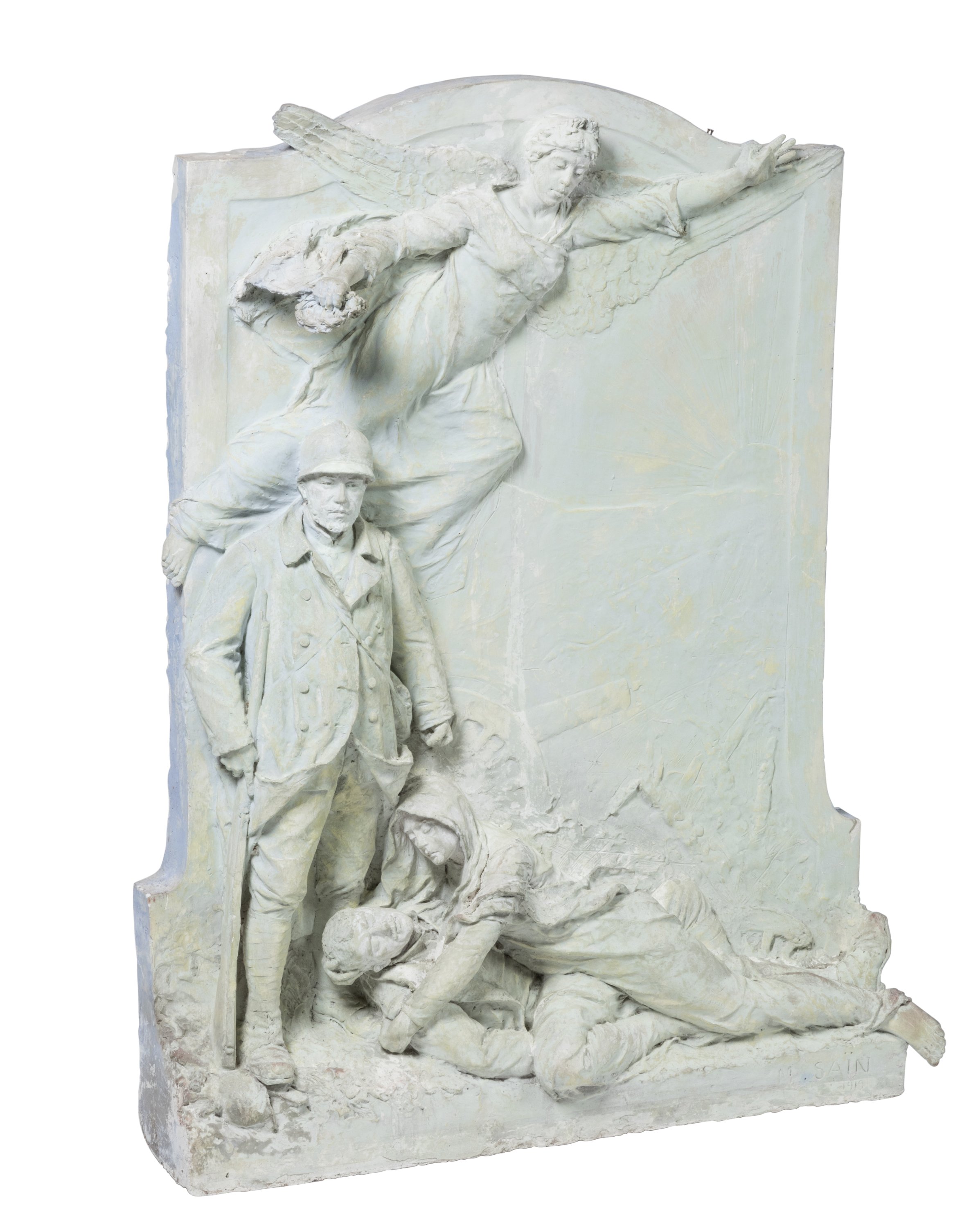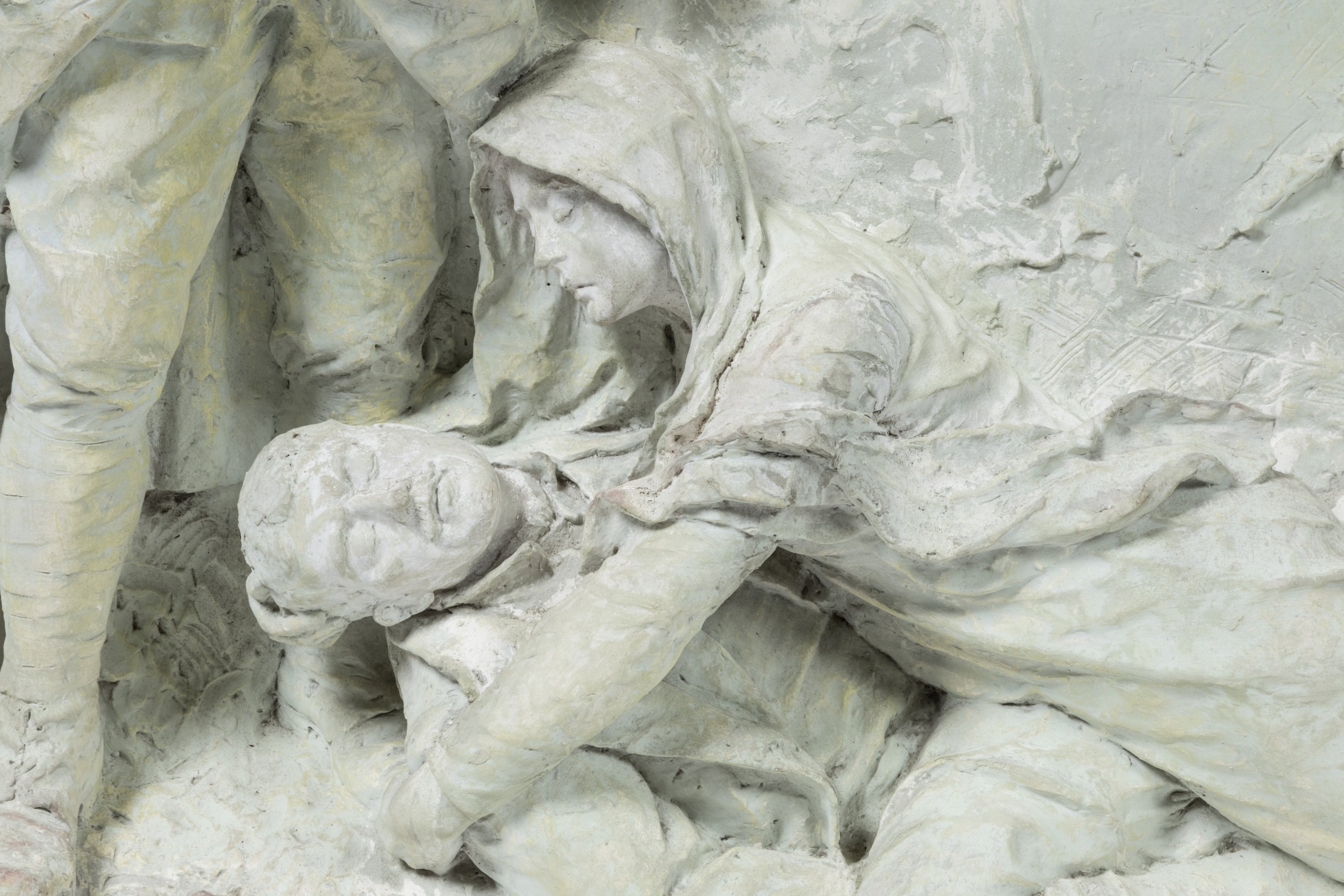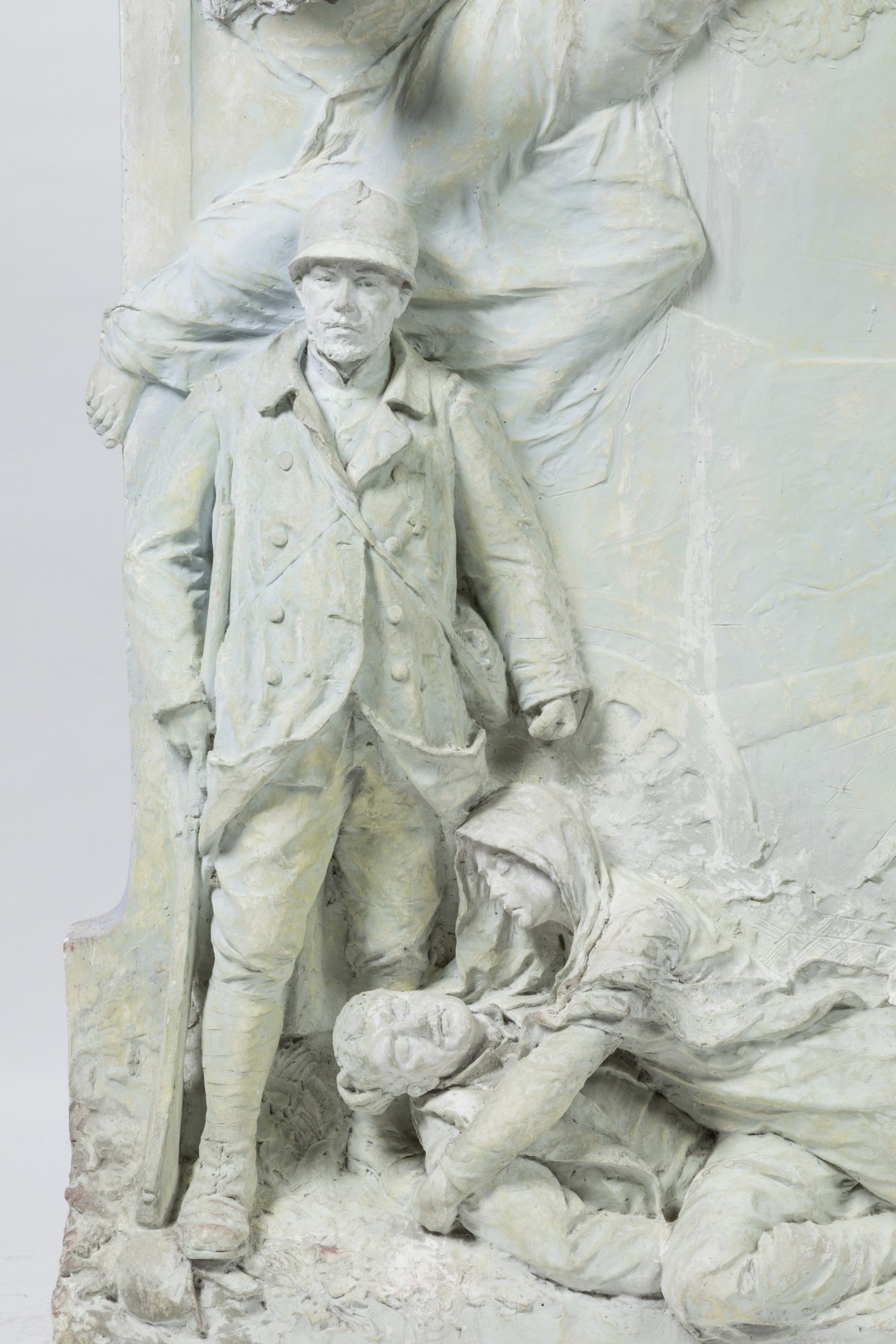 Dans notre projet pour le monument de Montfavet, la Victoire ailée couronne de lauriers un poilu décoré de la Croix de guerre, le poing serré, qui foule au pied un casque à pointe allemand. A ses pieds, une femme éplorée tient dans ses bras un soldat gisant au sol, formant une Pietà laïque. Sur la partie droite de la composition, un soleil radieux se lève sur les décombres du champs de bataille. On retrouve les noms des 62 soldats de Montfavet morts au front. Le monument fut inauguré le 1er août 1920.