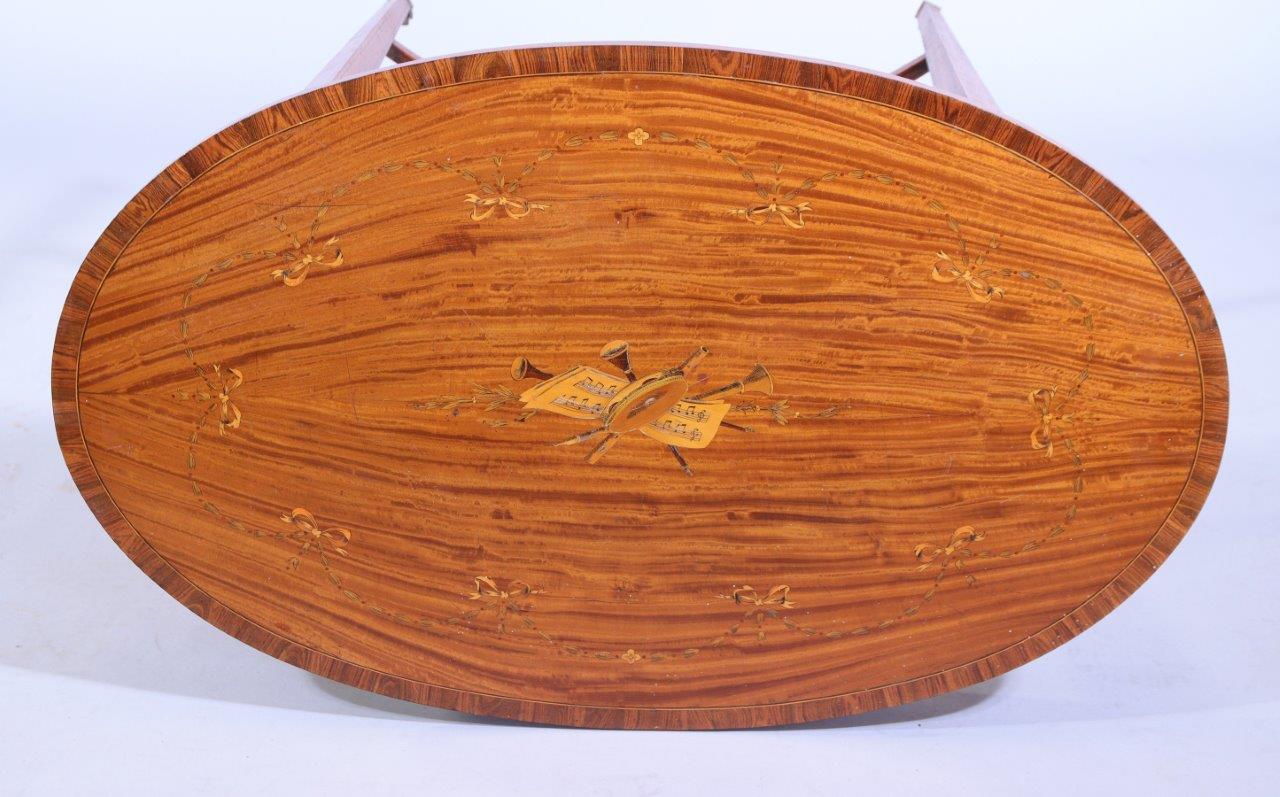 en placage de satiné et palissandre. Le plateau, à décor d'une marqueterie d’instruments et partitions de musique entourée d'une guirlande végétale et noeuds, est souligné par des filets de bois clair et teinté en noir. Elle repose sur quatre pieds gaines terminés par des roulettes et réunis par une entretoise en X ornée en son centre d'une toupie.