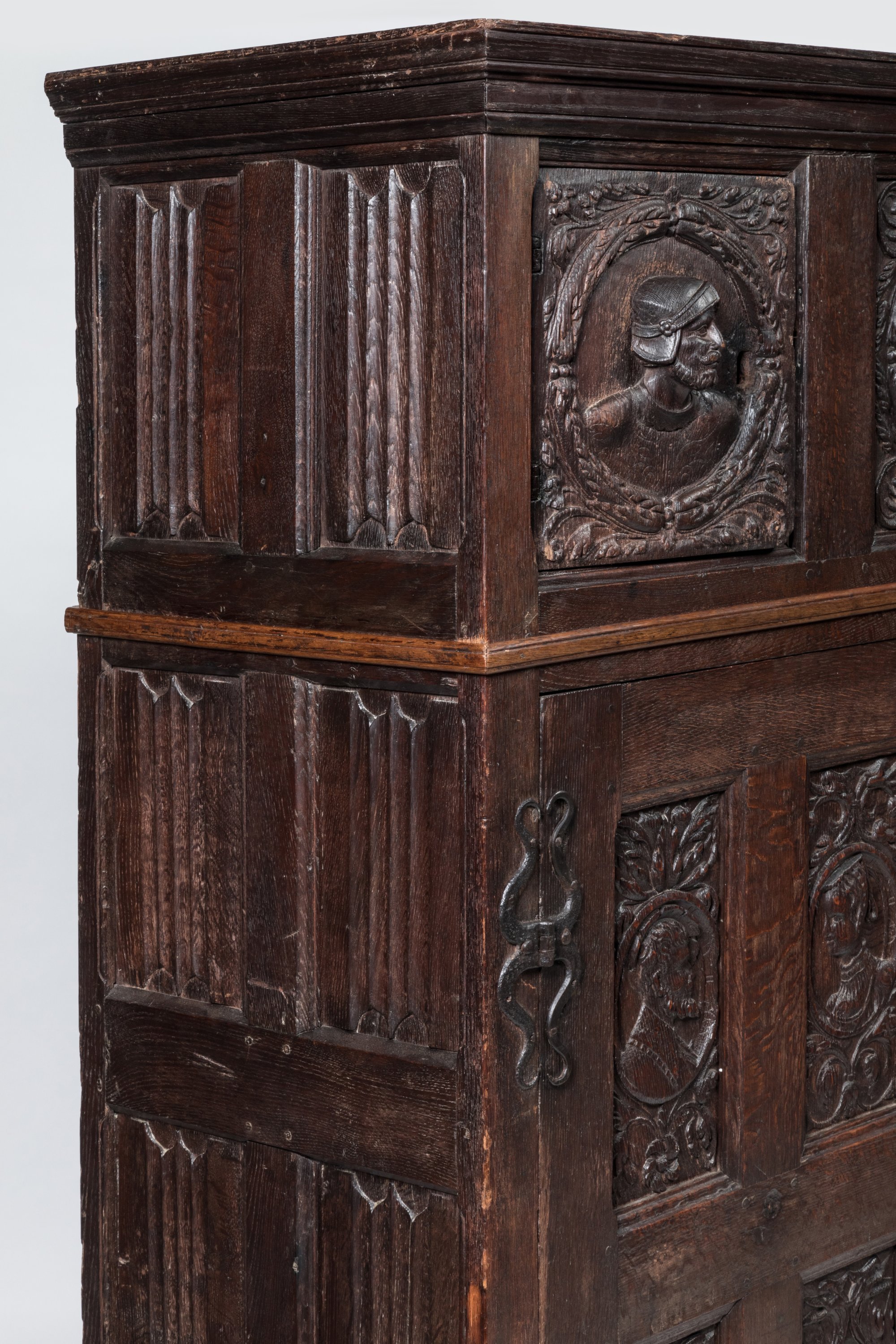 en chêne sculpté ouvrant à quatre vantaux, deux au corps supérieur encadrant une partie fixe, deux grands vantaux à quatre panneaux au corps inférieur. Décor de personnages en buste dans des médaillons représentés de face en partie haute et de profil en partie basse, entourage de rinceaux symétriques.
