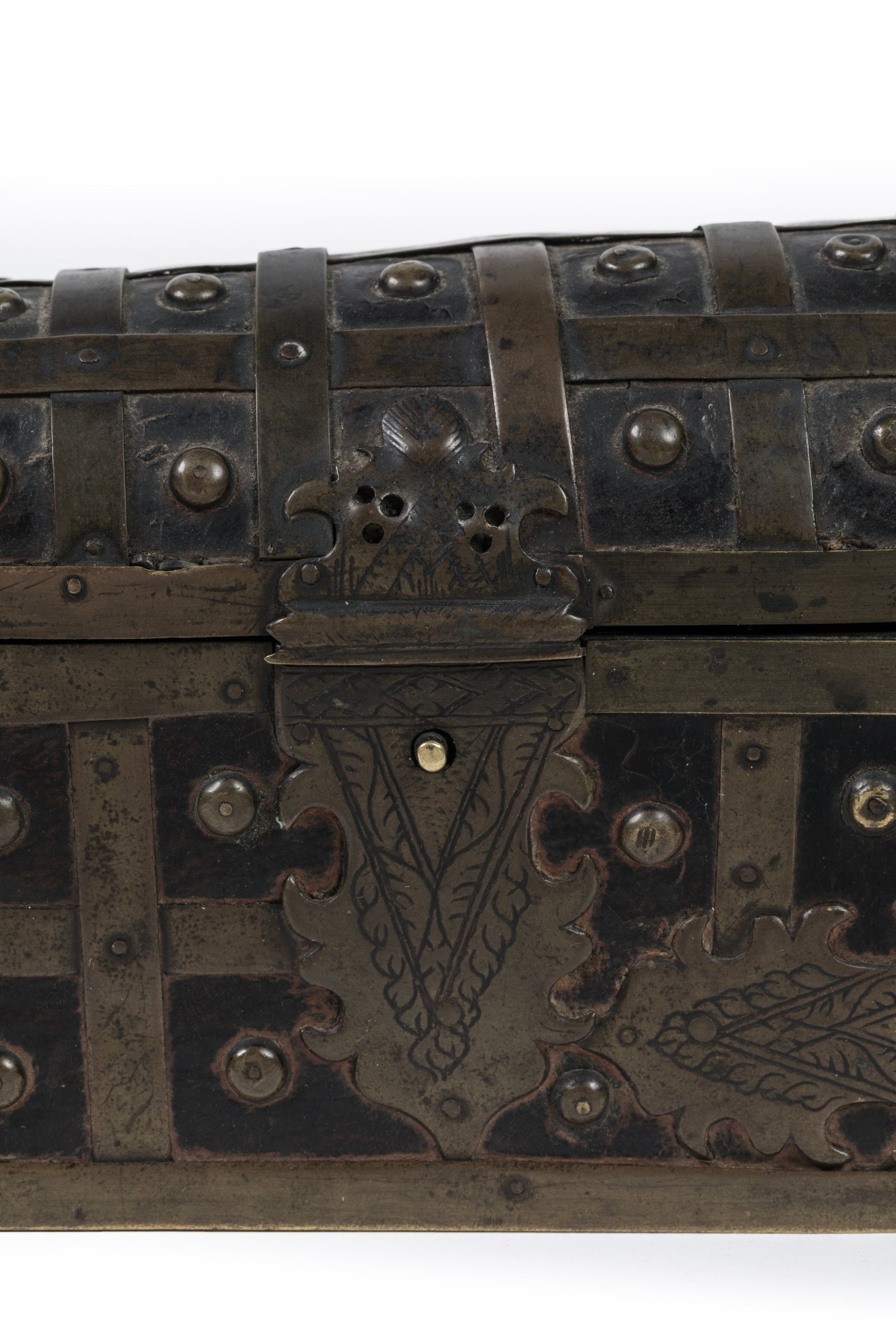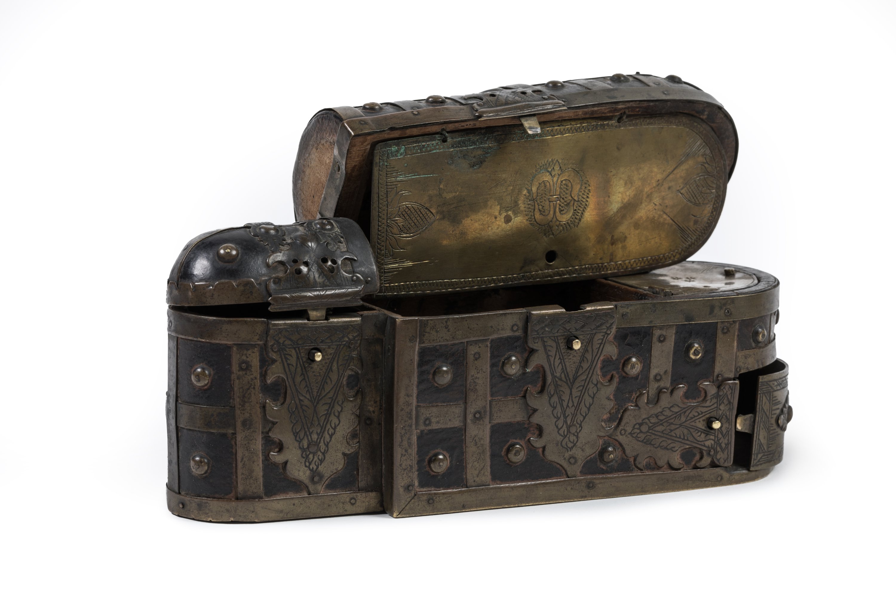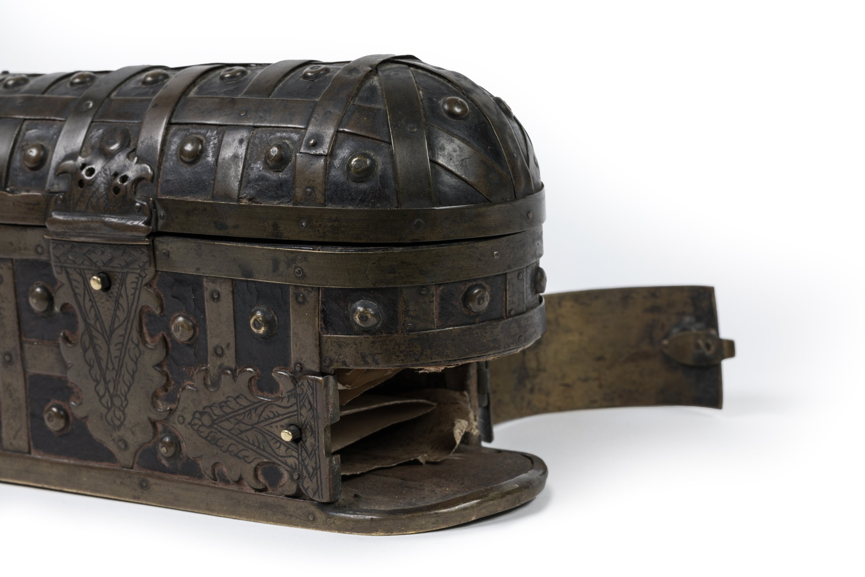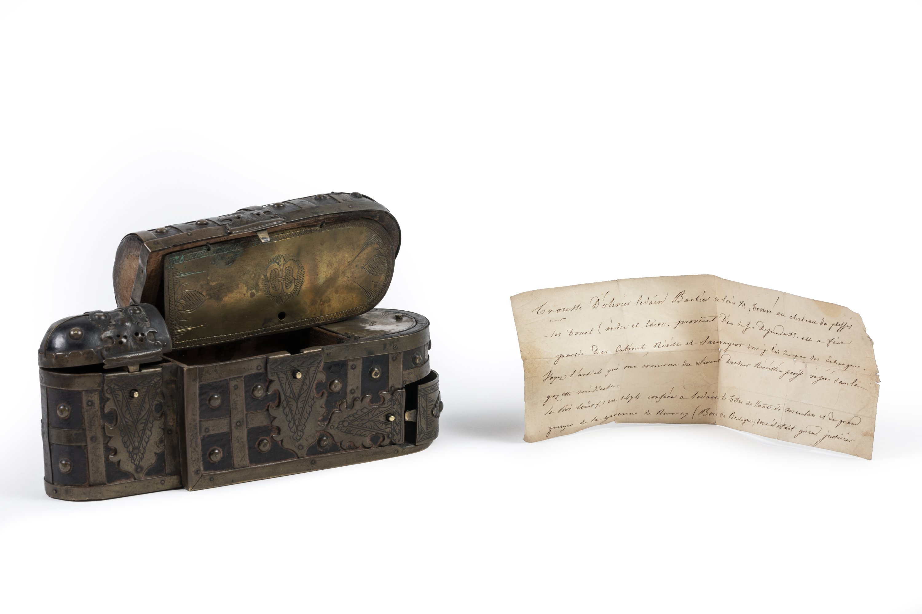 A brass and leather covered wooden box reputed to have belonged to Olivier Le Daim, barber to French King Louis XI. With two handwritten documents, one of them highlighting the provenance of the box.