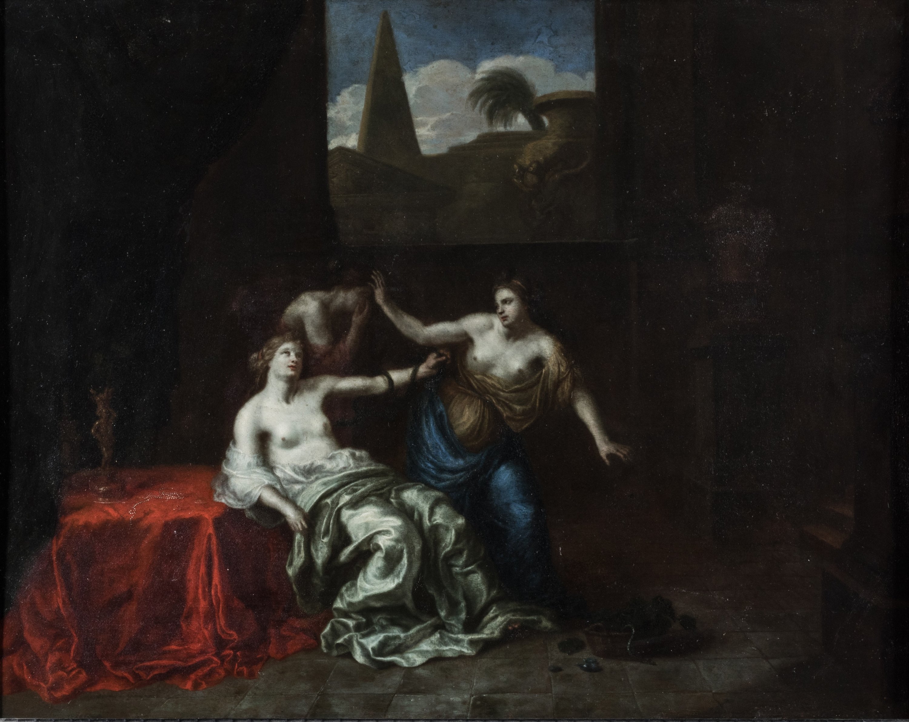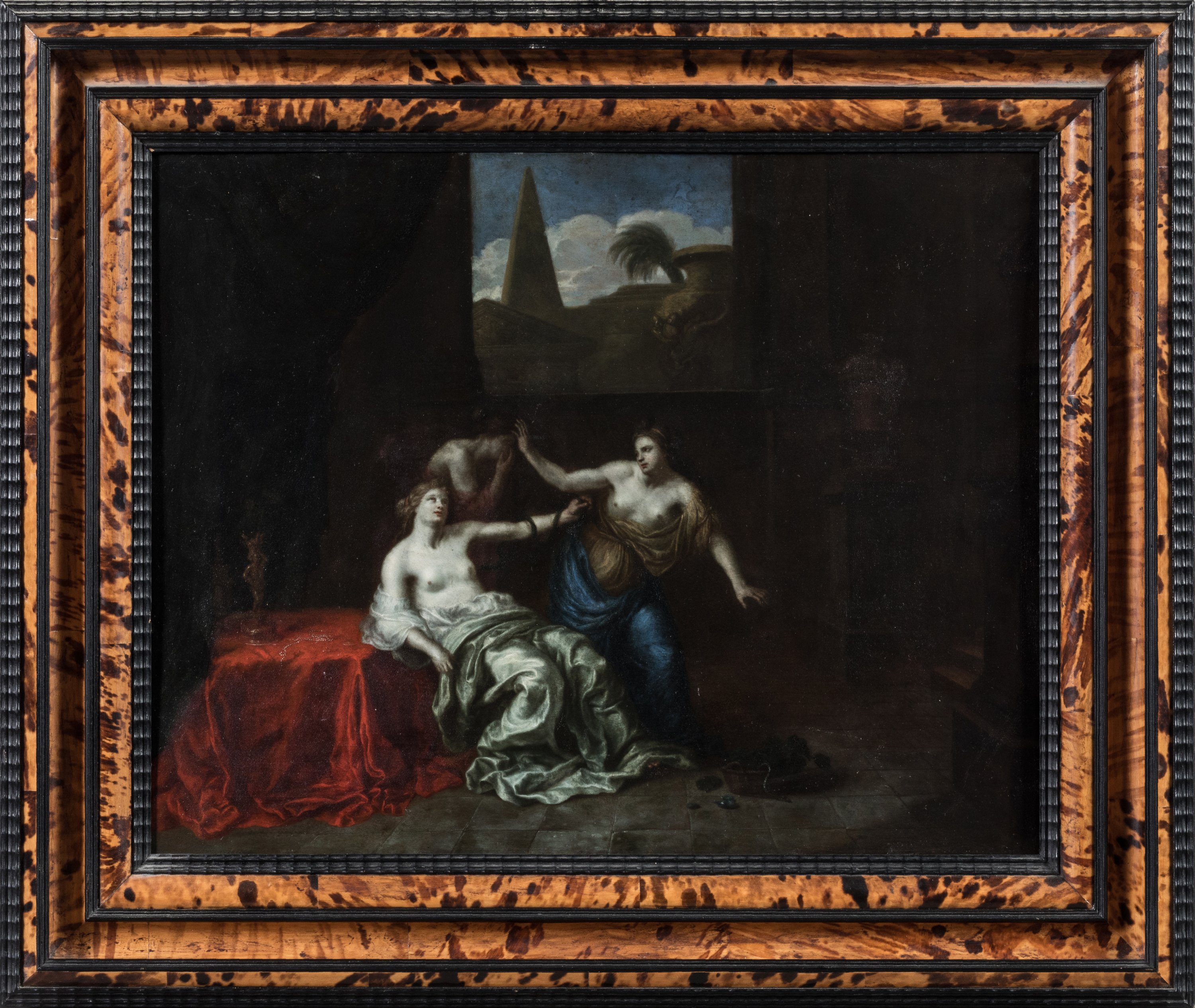 Attributed to Ottmar Elliger II. A painting depicting Cleopatra's death. Oil on copper. In a blackened wood and faux tortoiseshell frame.