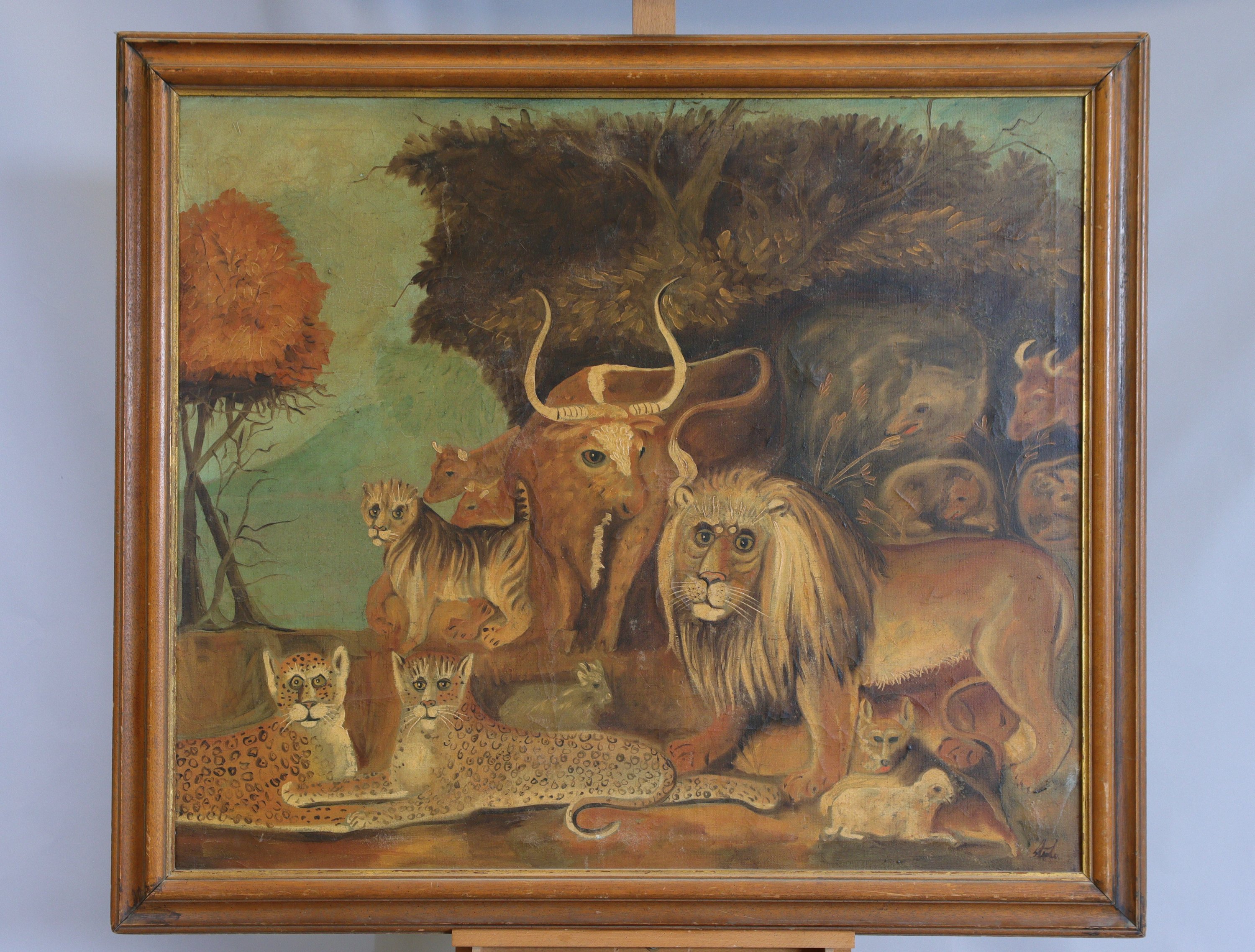 American School, in the manner of Edward Hicks. A painting entitled "Peaceable Kingdom". Signed (Stelo?).