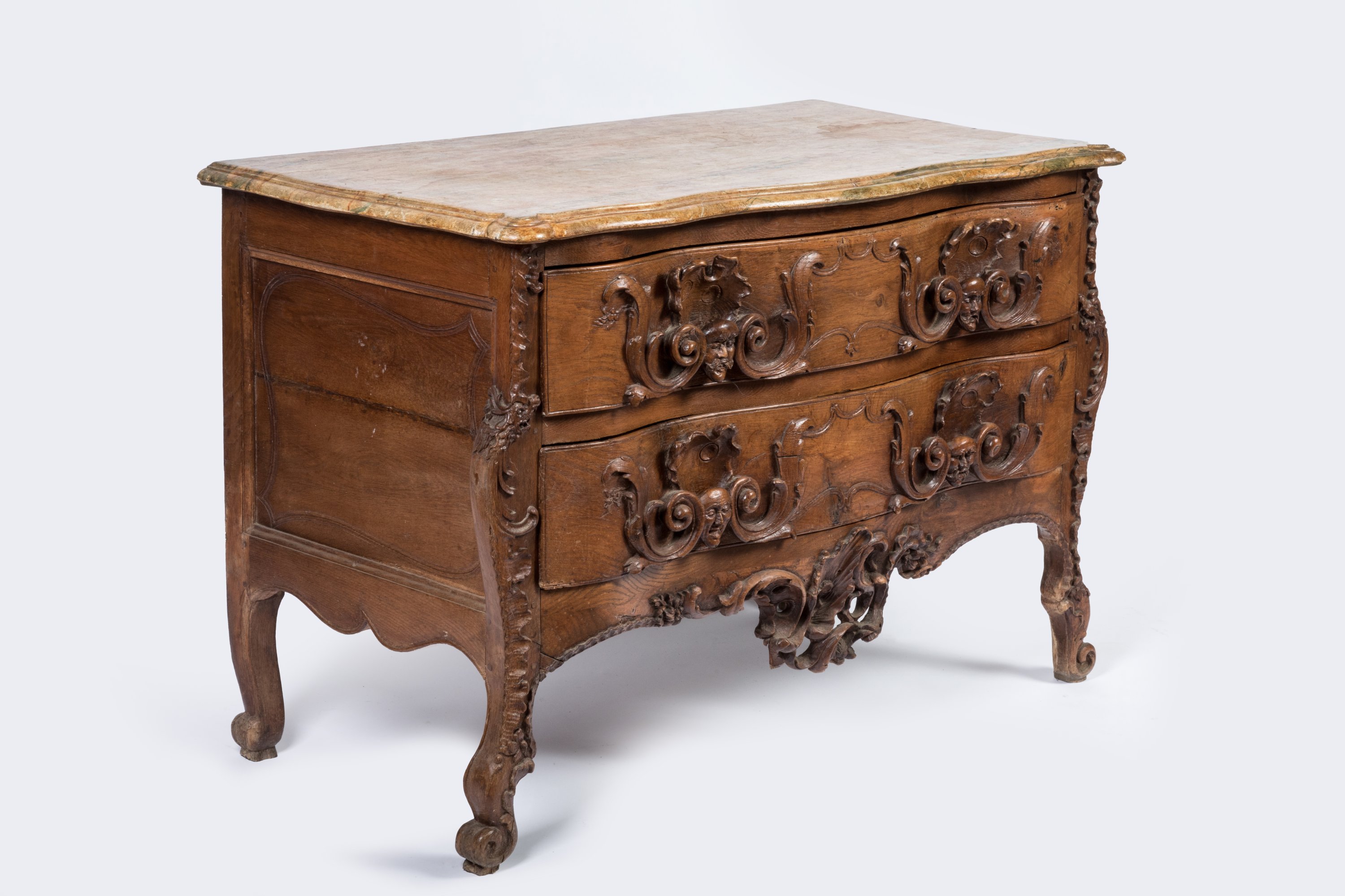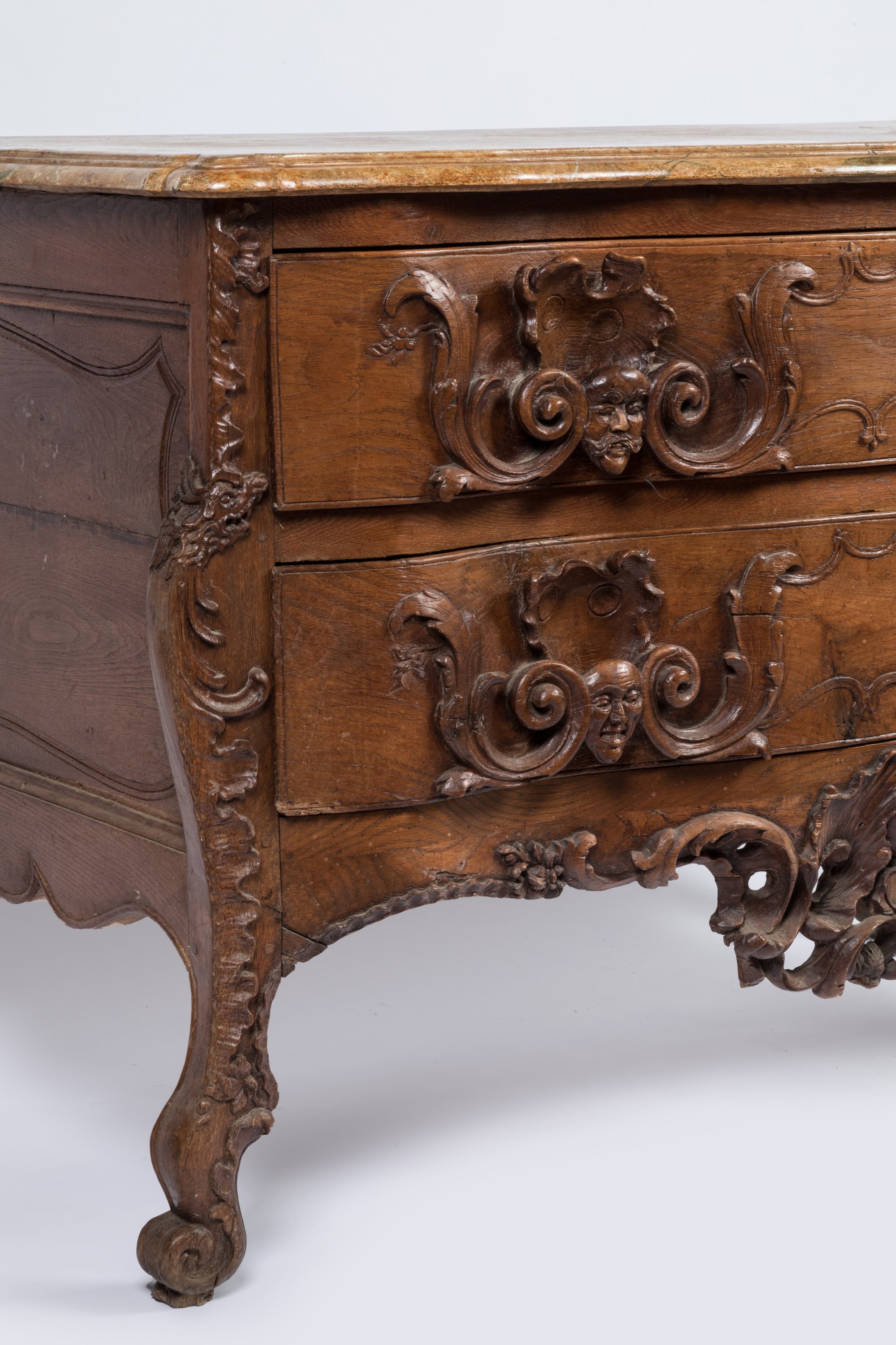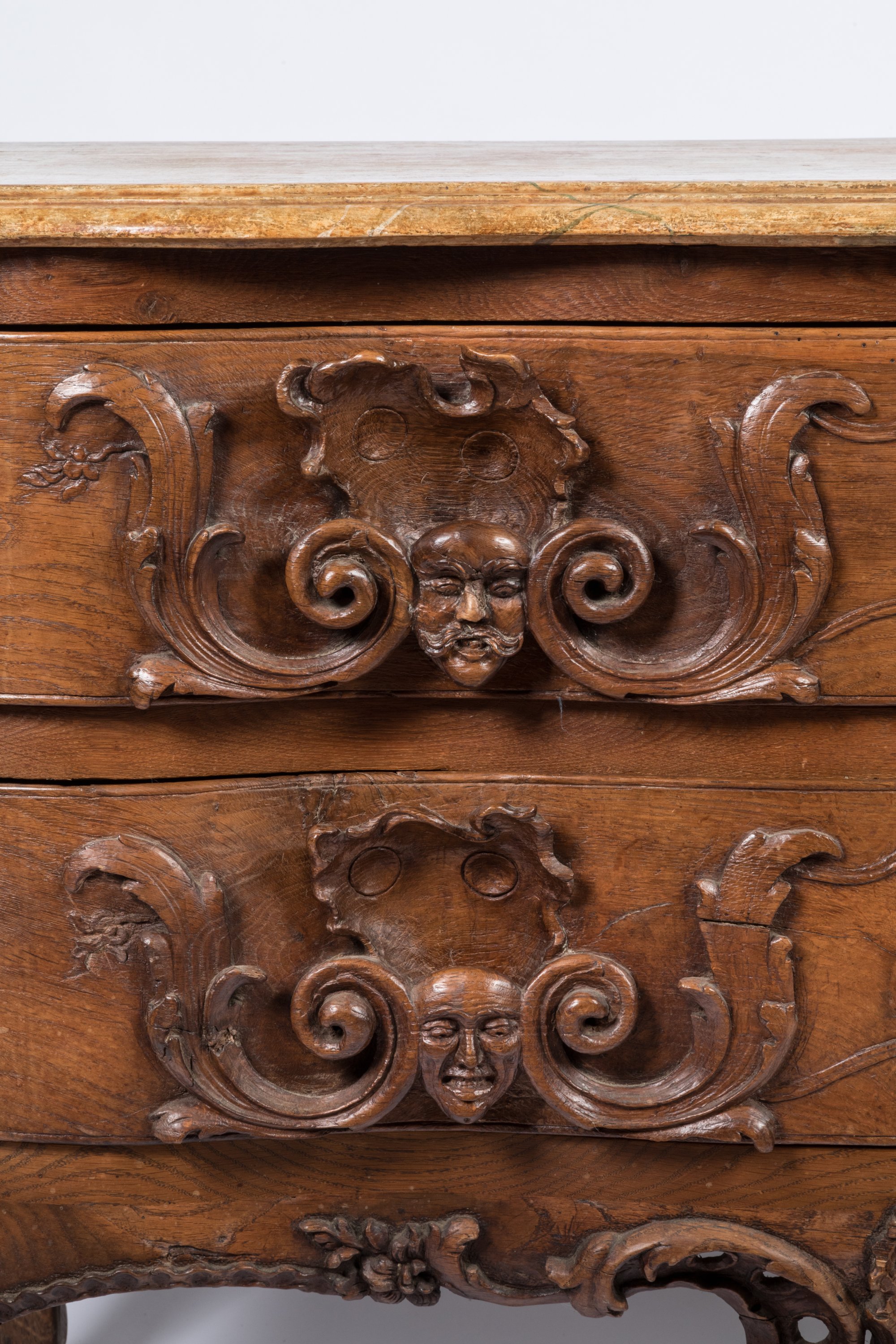 Namur, mid-18th C. A carved oakwood chest of drawers. Faux marble top.