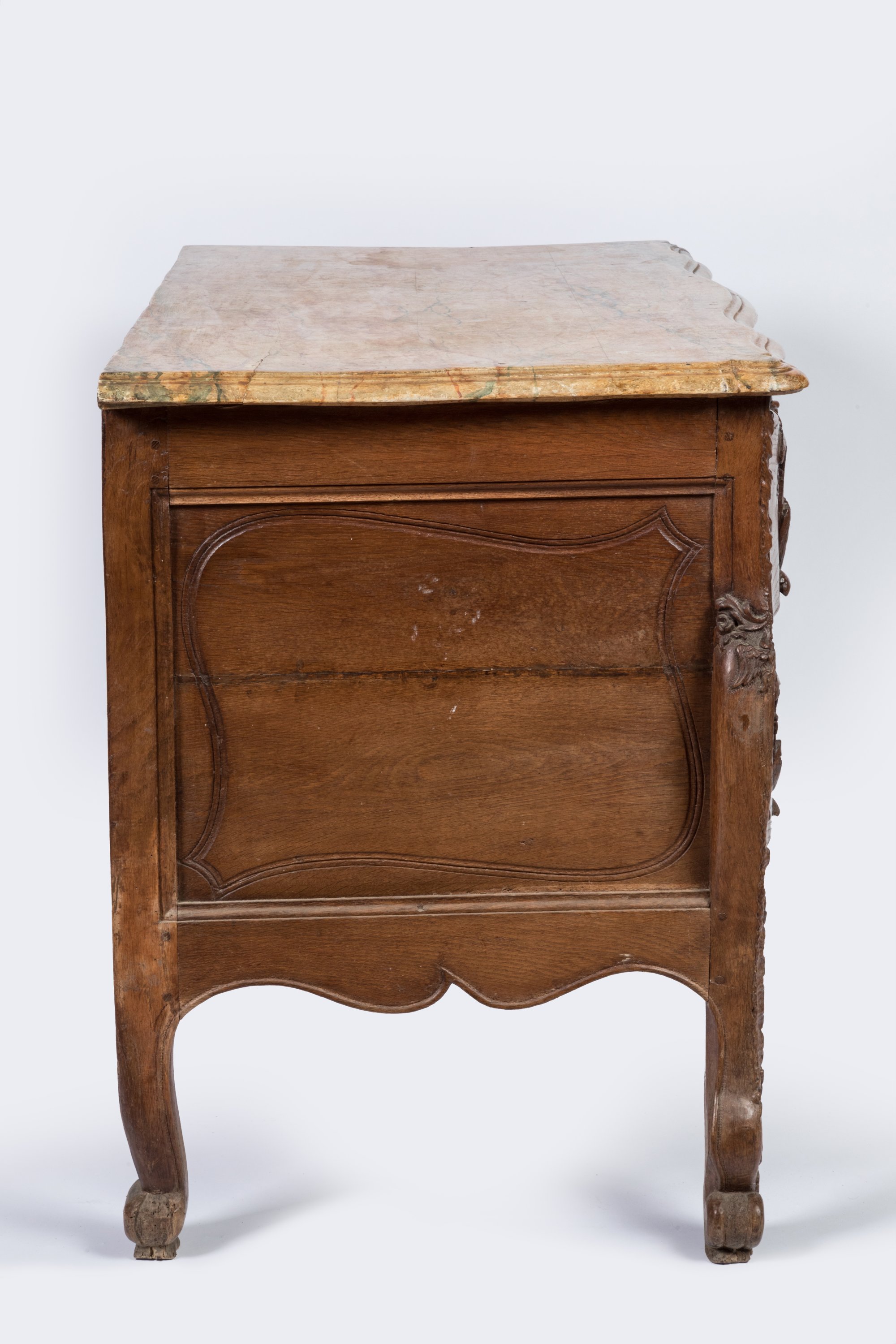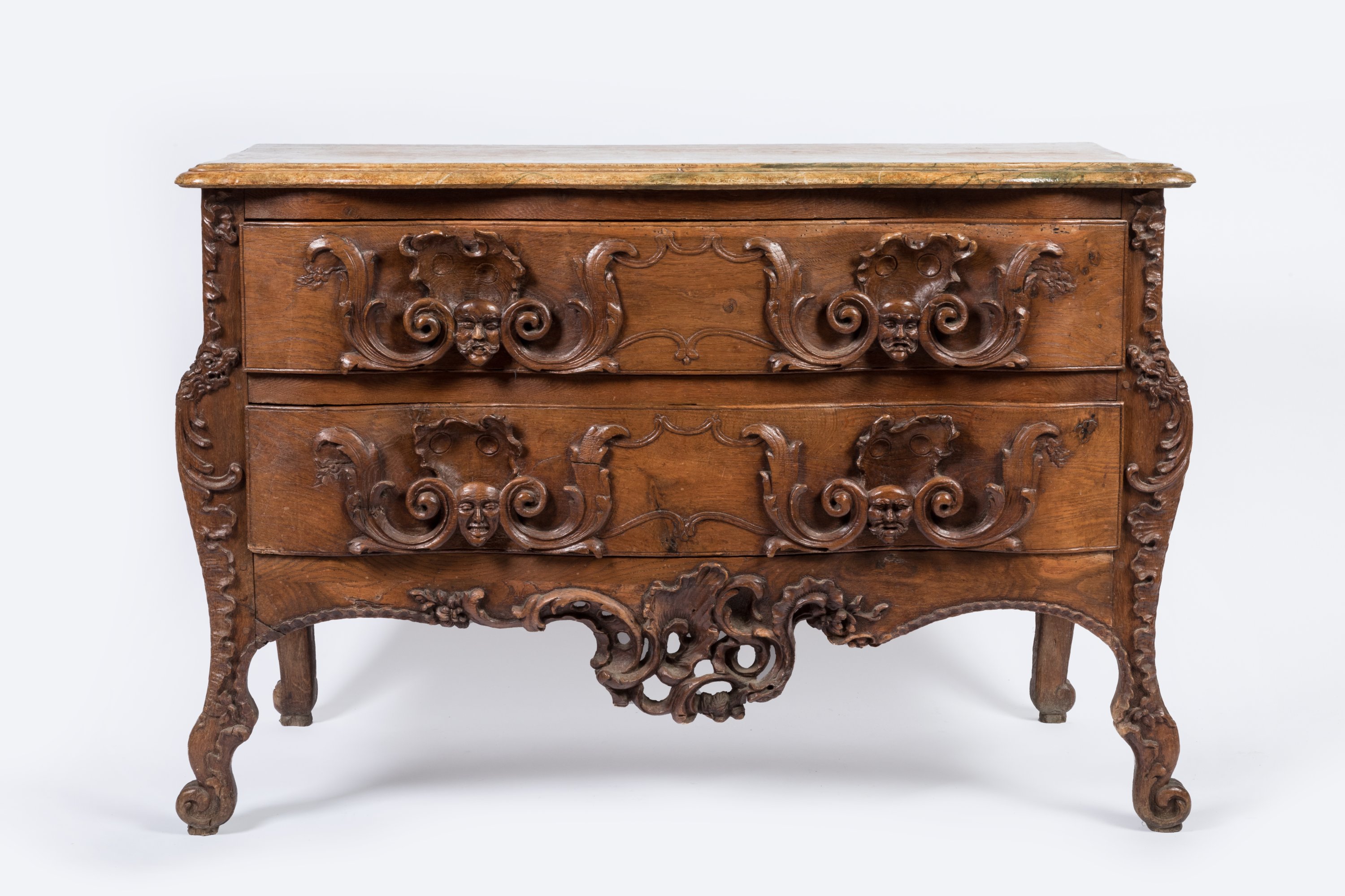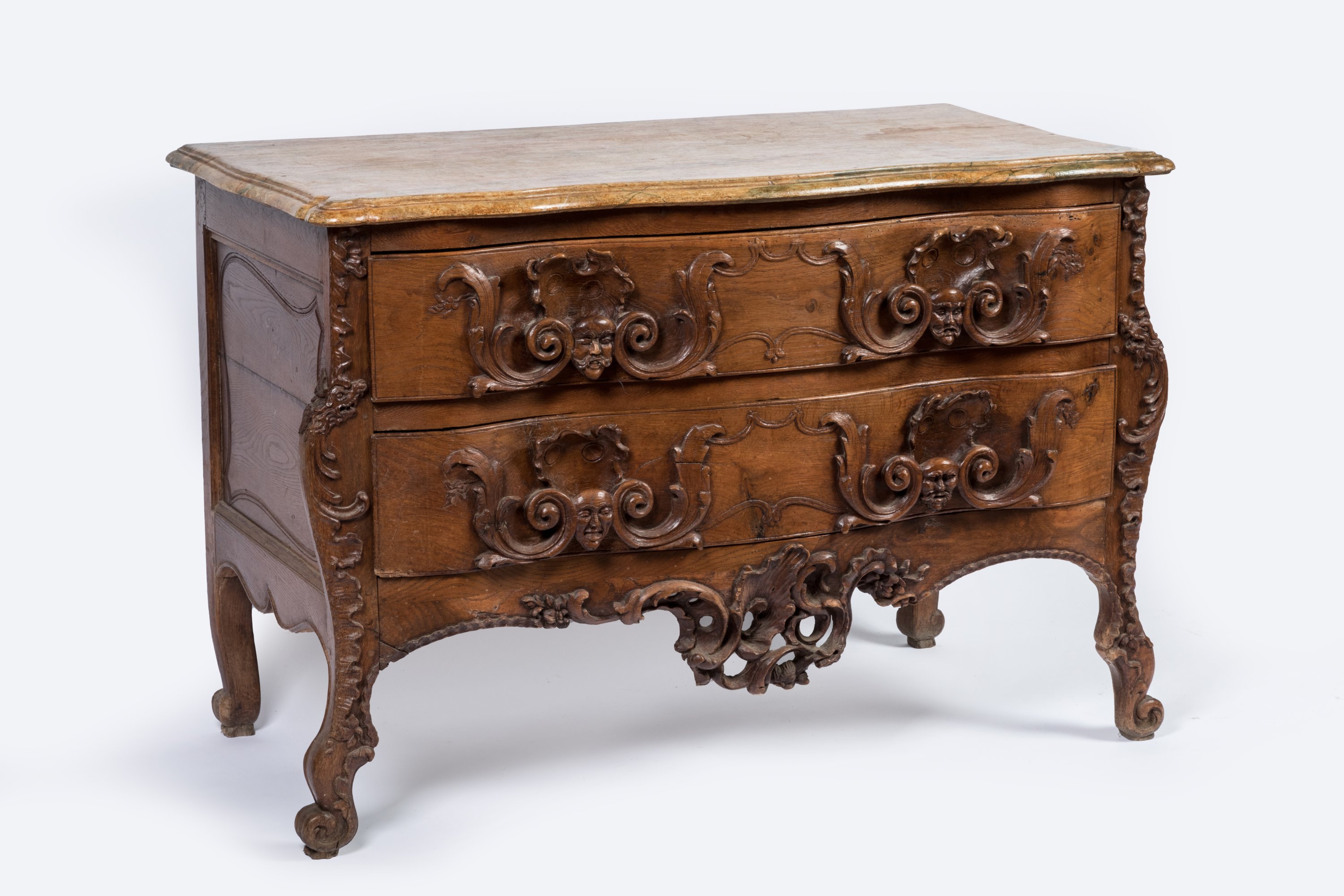 Namur, mid-18th C. A carved oakwood chest of drawers. Faux marble top.