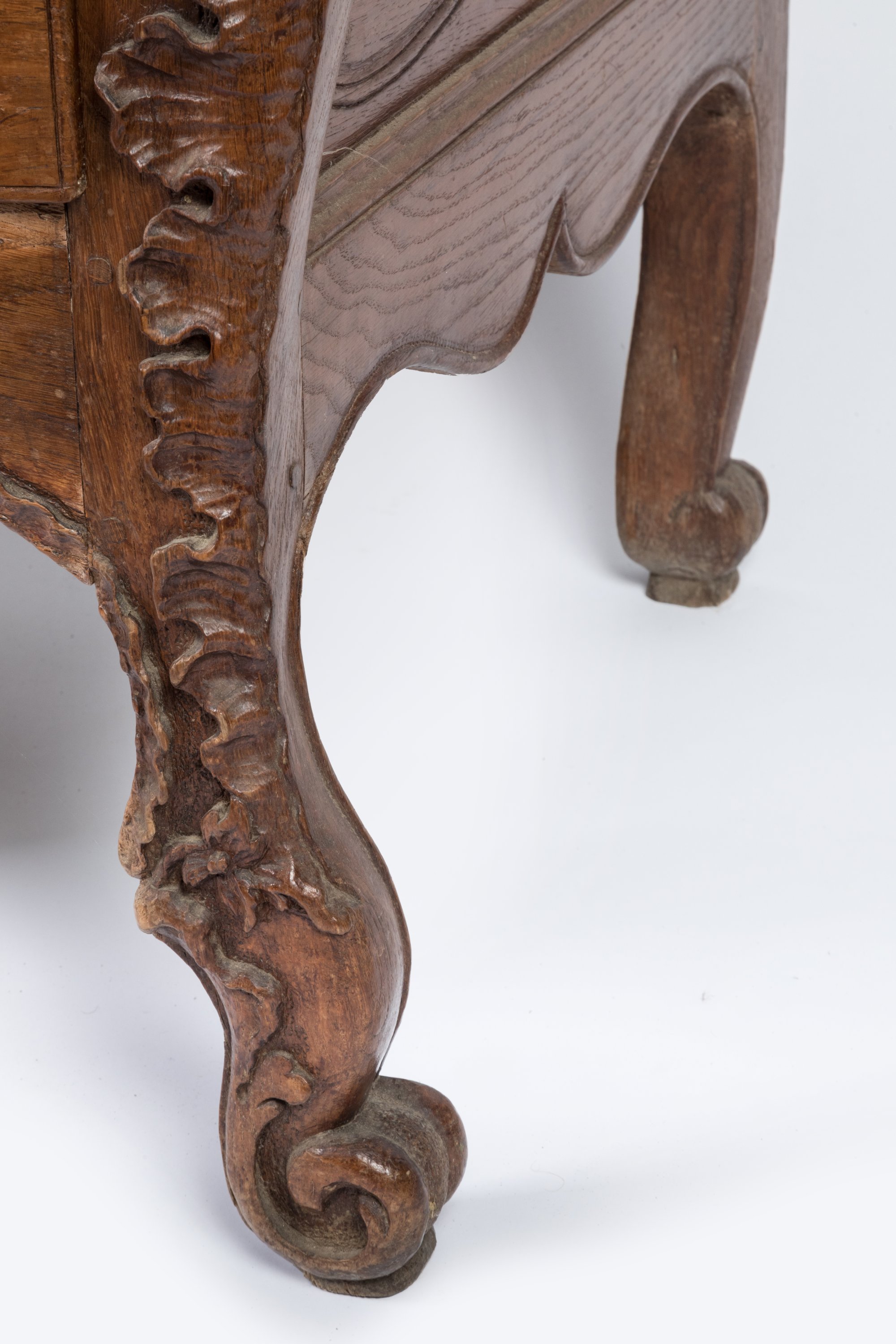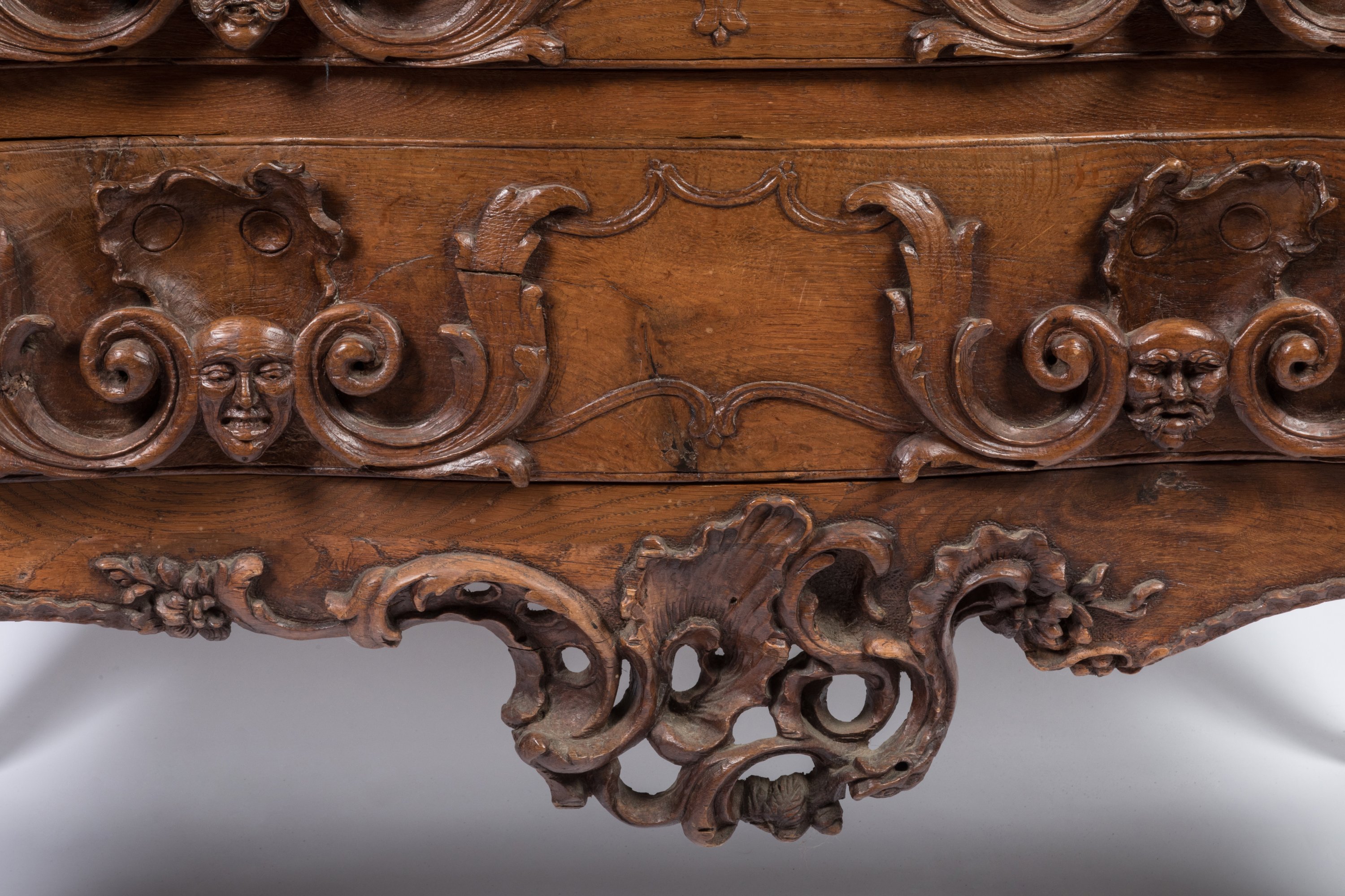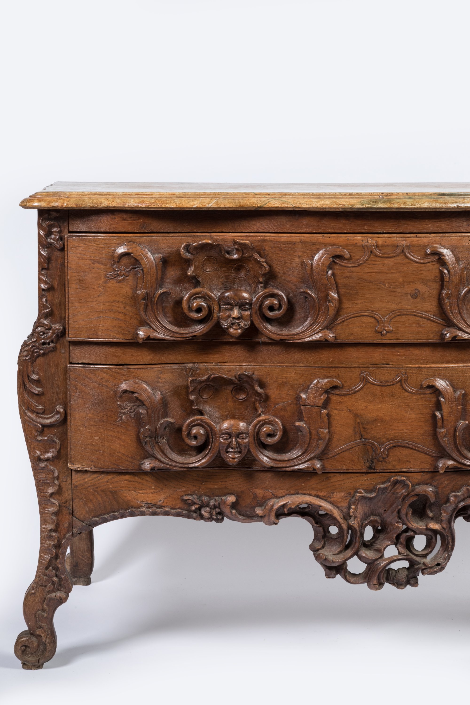 en chêne mouluré et sculpté, de forme mouvementée en façade, ouvrant par deux tiroirs encadrés de montants galbés, reposant sur des pieds aux enroulements extérieurs. Les poignées de tirage sont sculptées de têtes d’hommes aux visages individualisés, encadrées d’enroulements d’acanthe et surmontées de coquilles asymétriques. Le tablier et les montants sont à décor de chutes rocaille et d’agrafes.