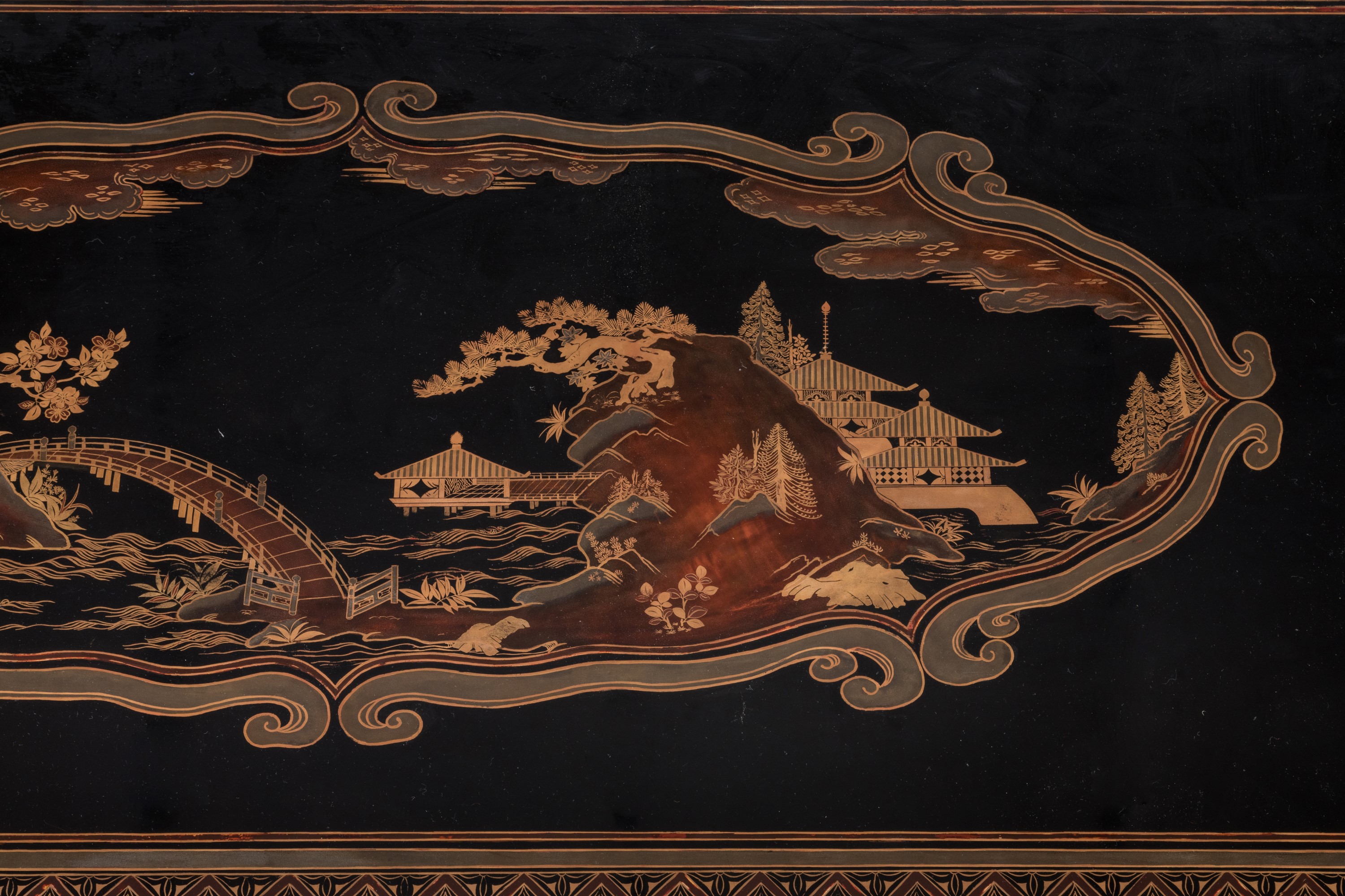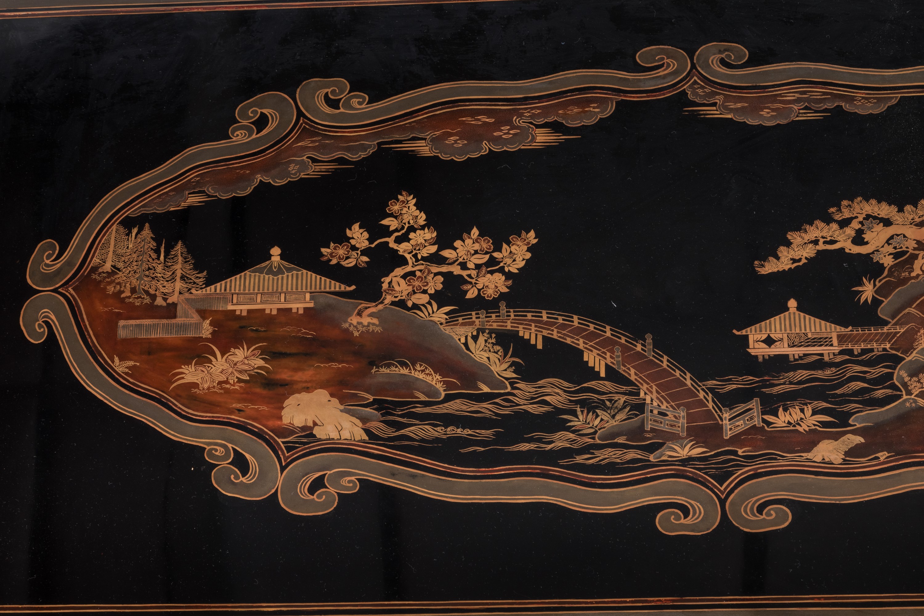 en laque à décor en makie, or et argent sur fond noir, de cartouches sur la façade, les côtés et le dessus du plateau ornés de paysages inspirés des huit vues d’Omi: un pont sur un lac avec des pins sur le couvercle ; des pavillons en escalier avec des magnolia en façade. Les bords ceints d’une frise géométrique de fleurs à quatre pétales et les extrémités du couvercle de motifs de môns sur fond nashiji, aventurine. L’arrière présente un décor en makie, or sur fond noir, de branchages à feuilles trilobées, contenu dans un encadrement de frise géométrique.