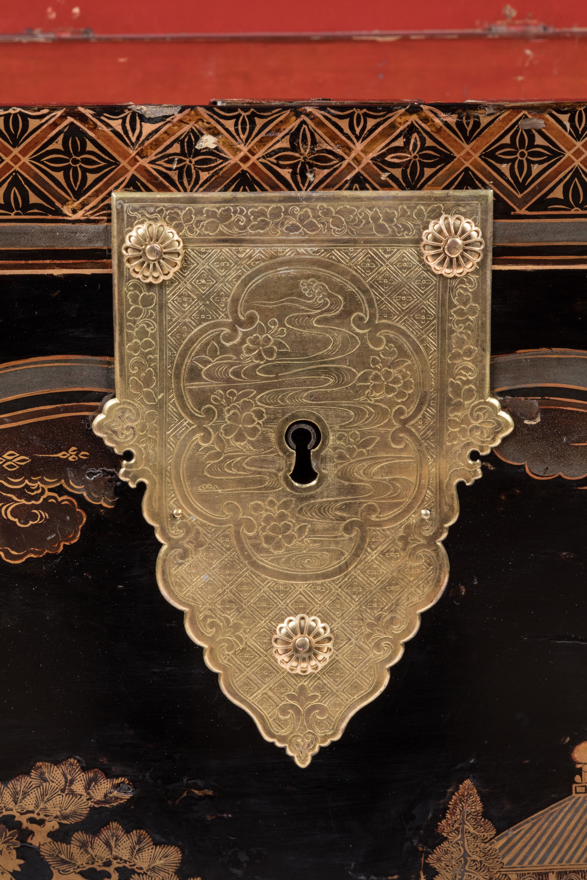 L’art de la laque est maîtrisé à un si haut point au Japon à la fin du XVIe siècle que son commerce devient prioritaire pour les puissances européennes qui y sont établies: Portugal, Pays-Bas et Angleterre. En 1635, dix ans après les Anglais, les Portugais sont définitivement évincés de l’Archipel, qui vit une période de reconfiguration politique. Le shogun Tokugawa s’impose parmi ses pairs, ouvrant l’ère Edo. La V. O. C., Compagnie néerlandaise des Indes Orientales, tire profit de la proximité de son représentant François Caron avec le Shogun Tokugawa Iemitsu pour obtenir le monopole du commerce avec le pays du Soleil Levant. Faisant travailler les meilleurs ateliers de laqueurs, un nouveau style dit « Pictorialiste » est progressivement mis au point. Le style « Namban », avec ses couvercles bombés et les incrustations de galuchat et de nacre indienne qu’affectionnaient les Portugais, est abandonné. Une nouvelle technique, à la fois plus luxueuse de par son emploi de l’or mais aussi plus économique, car utilisée parcimonieusement sur un fond noir et des couvercles plats, est élaborée. On l’appelle « makie ». Ce changement du style « Nanbam » vers le style « Pictorialiste » dure une vingtaine d’années, jusqu’à la fin des années 1650. Un rare style dit de « Transition » est alors expérimenté, faisant cohabiter le nouveau décor « makie » et l’ancien style « Namban », avec ses encadrements de cartouches et de bordures géométriques.Un rare coffre à fond rouge