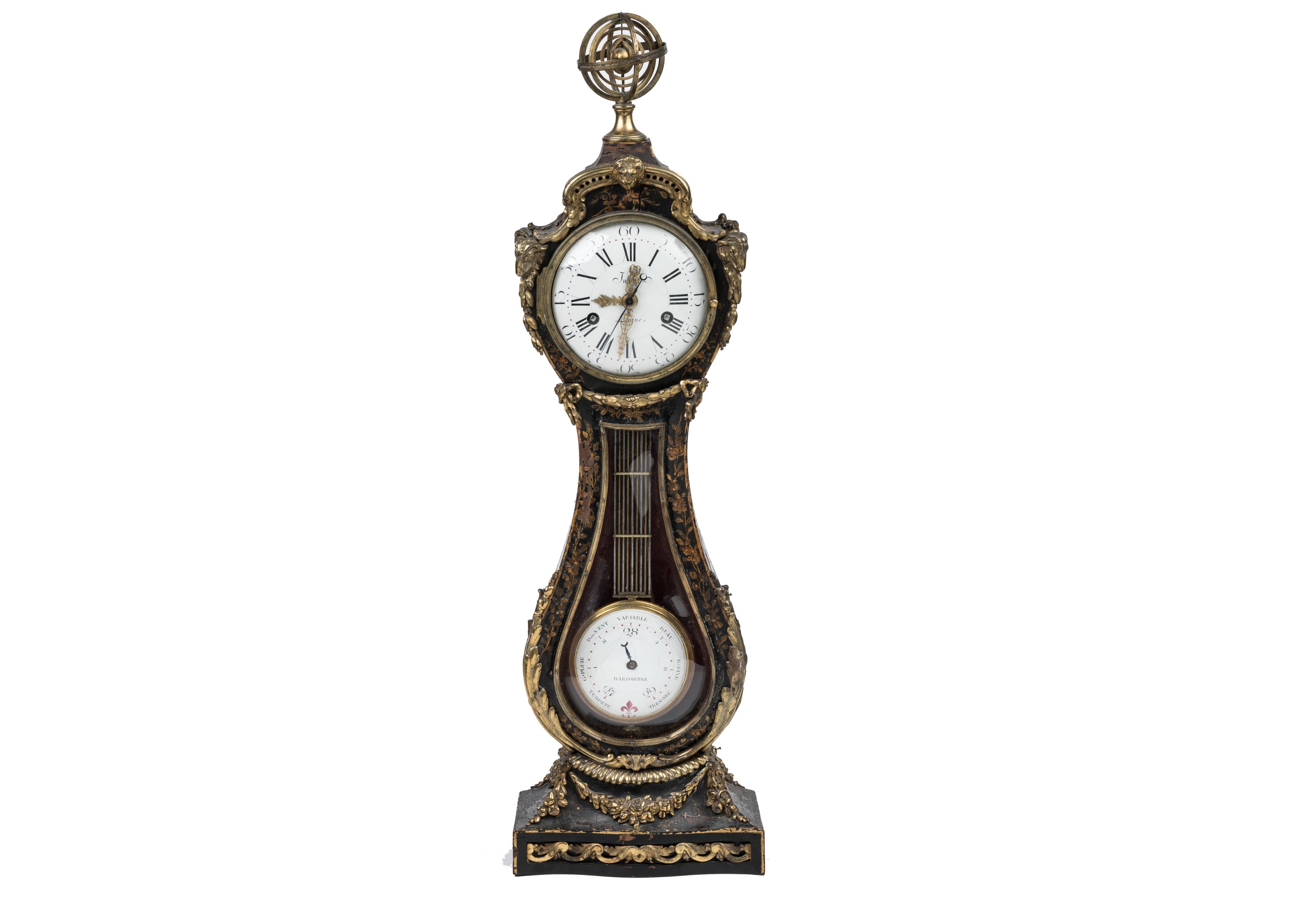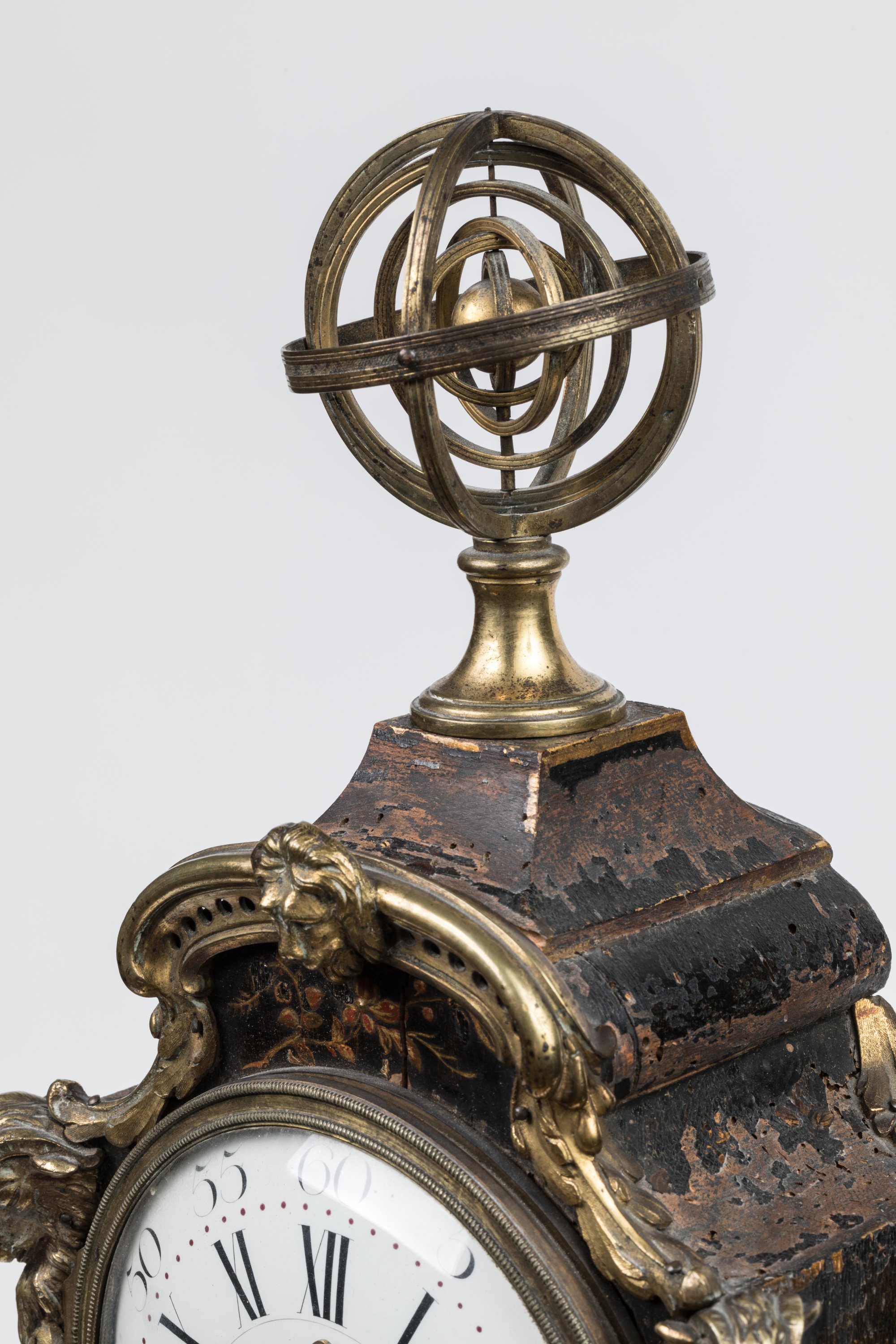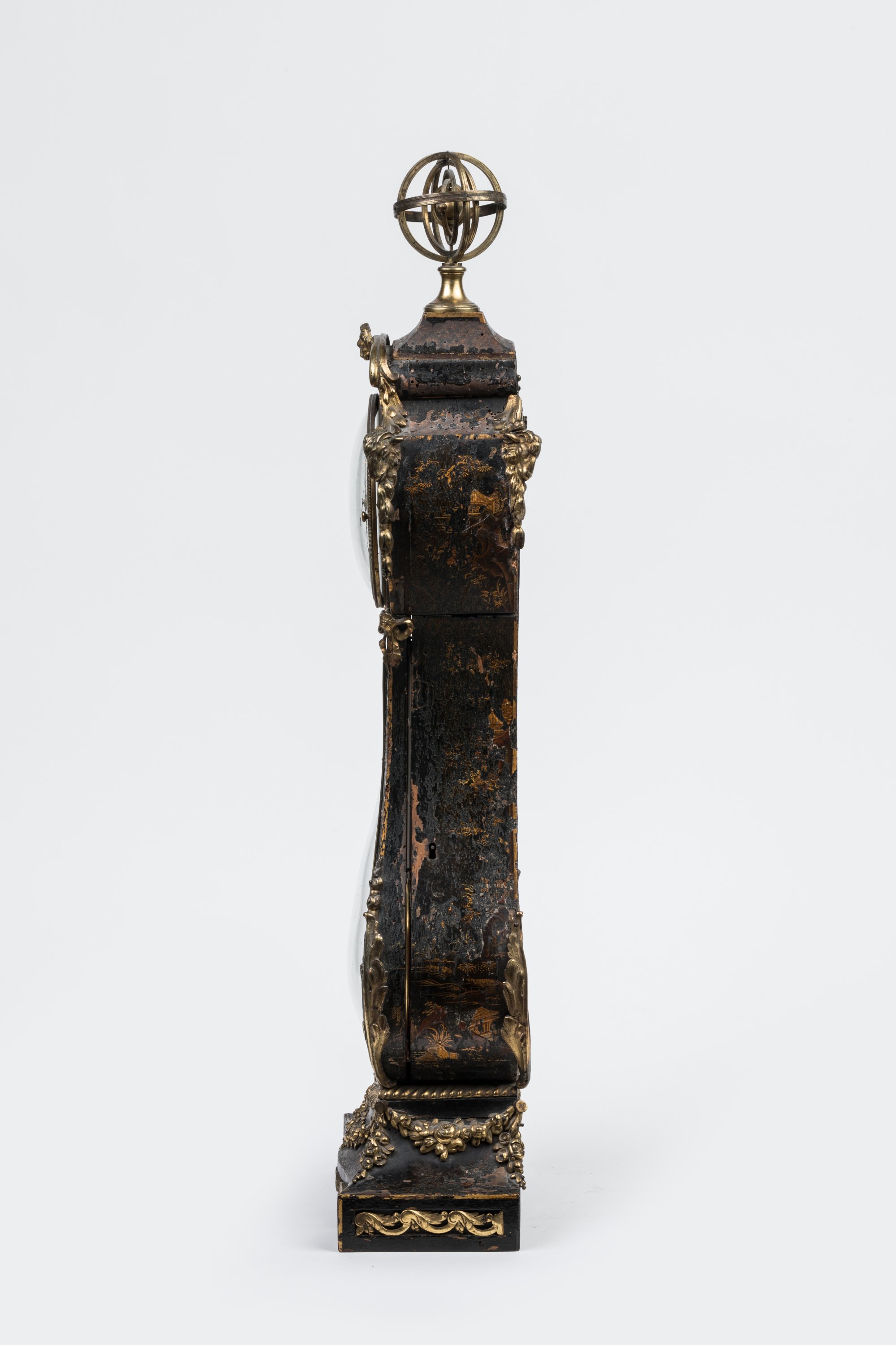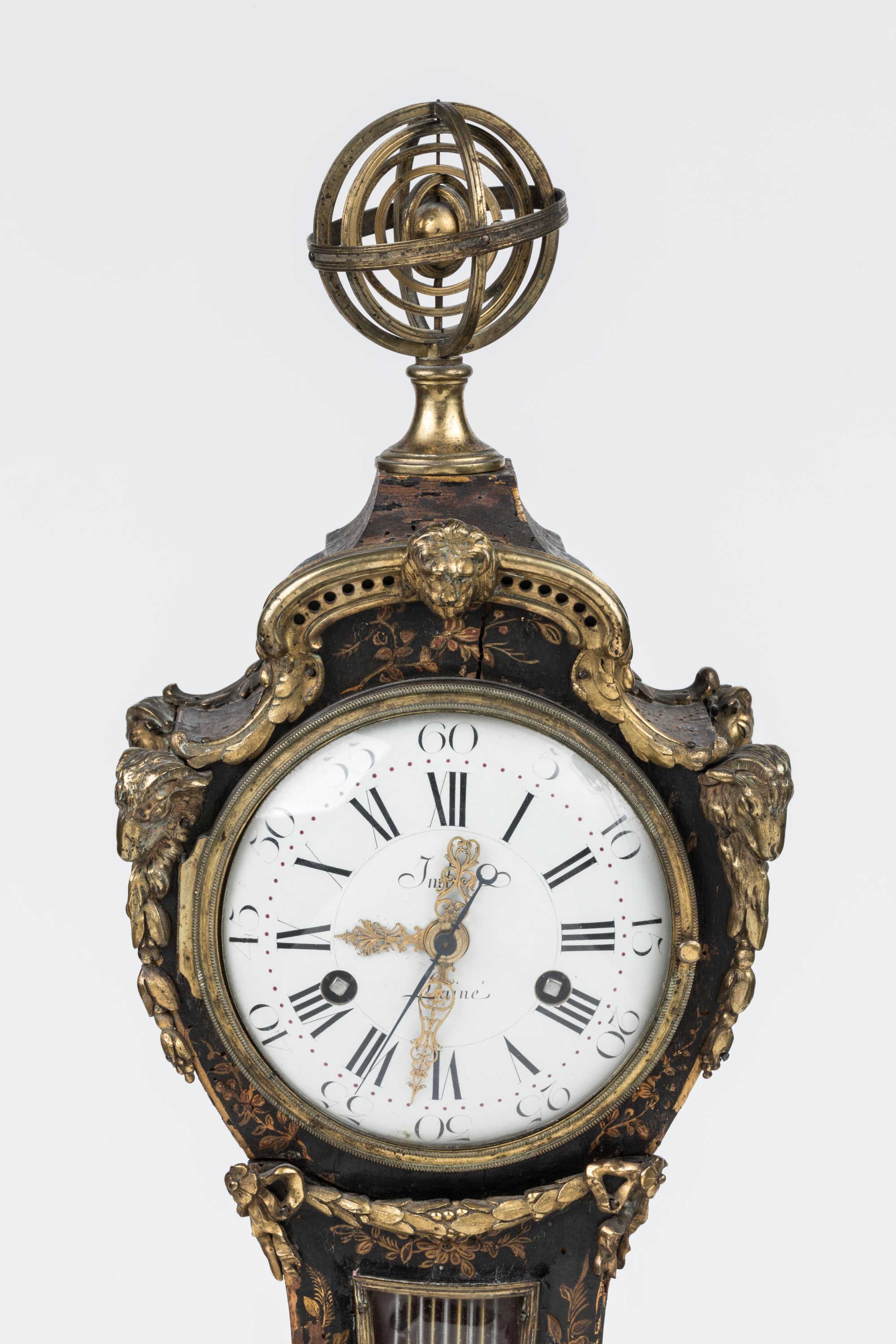 Goyer and Imbert. A Louis XV-Louis XVI Transition Period ormulu-mounted japanned long case clock topped by an ormolu armillary sphere.