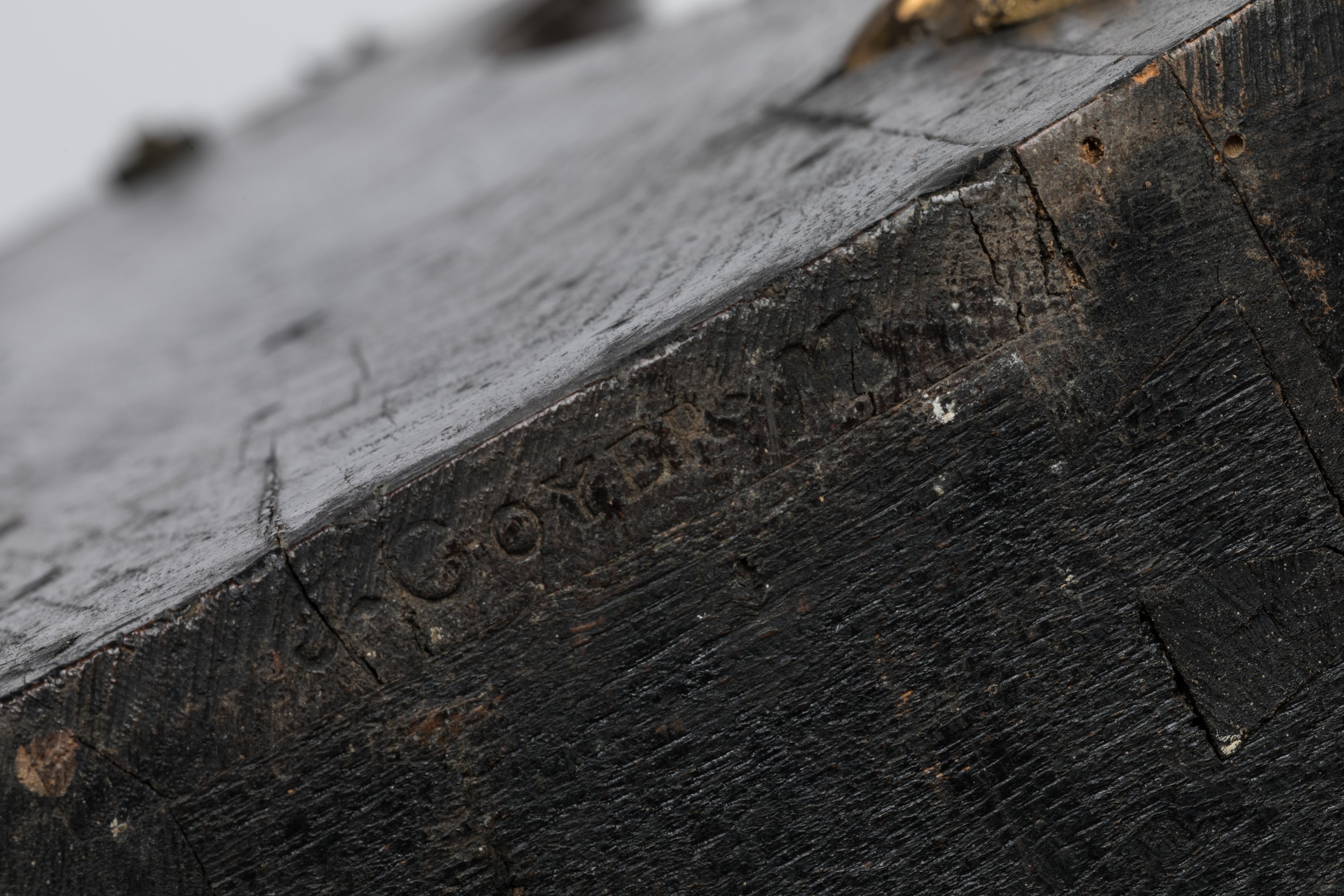 François, le père de Jean Goyer, est réputé d'après Kjellberg avoir créé le modèle de notre pendule. Ebéniste parisien reçu maître en 1740, il exerce rue du Faubourg-Saint-Antoine à "L'Autruche", avant de se fixer rue de Charonne à "l'Eau qui dort". Il produit des boîtes d'horloge laquées dans le goût chinois, ornées de bronzes rocaille. Son inventaire après décès en 1763 compte pas moins de trois pendules et 26 "boëtes de cadran", dont 16 "plaquées en bois pour vernir". Son fils Jean poursuit la production de gaines d'horloges durant une vingtaine d'années rue de Charenton. Egalement fondeur talentueux, il est condamné en 1766 par les jurés ciseleurs constatant qu'il loge chez lui des ouvriers bronziers, et est enjoint à choisir entre les deux professions. Sa collaboration avec son beau-frère René Dubois donne lieu à de spectaculaires réalisations, dont le célèbre secrétaire monumental dans la collection de James A. de Rothschild à Waddesdon Manor (Kjellberg, 1998, p.372).