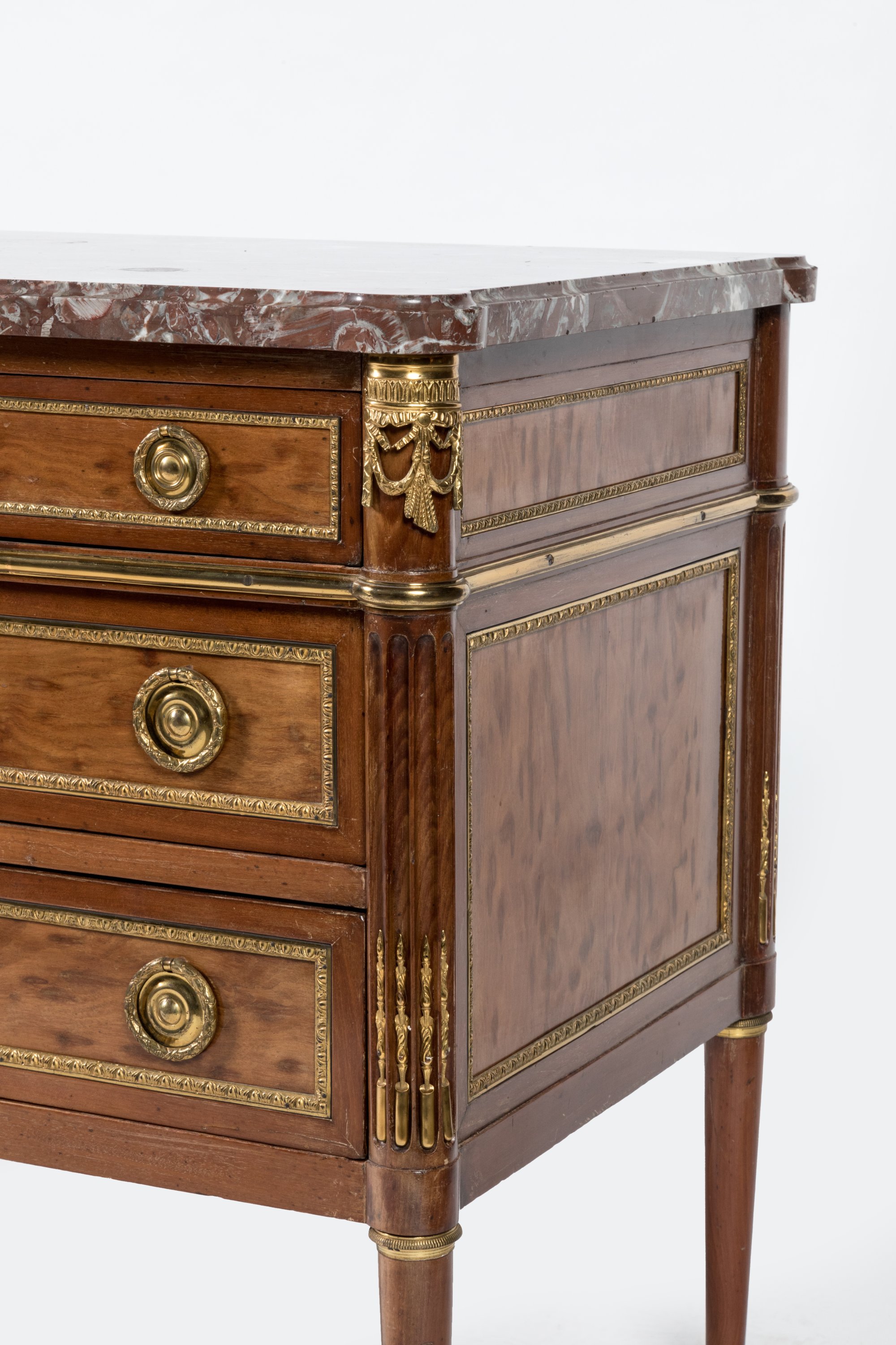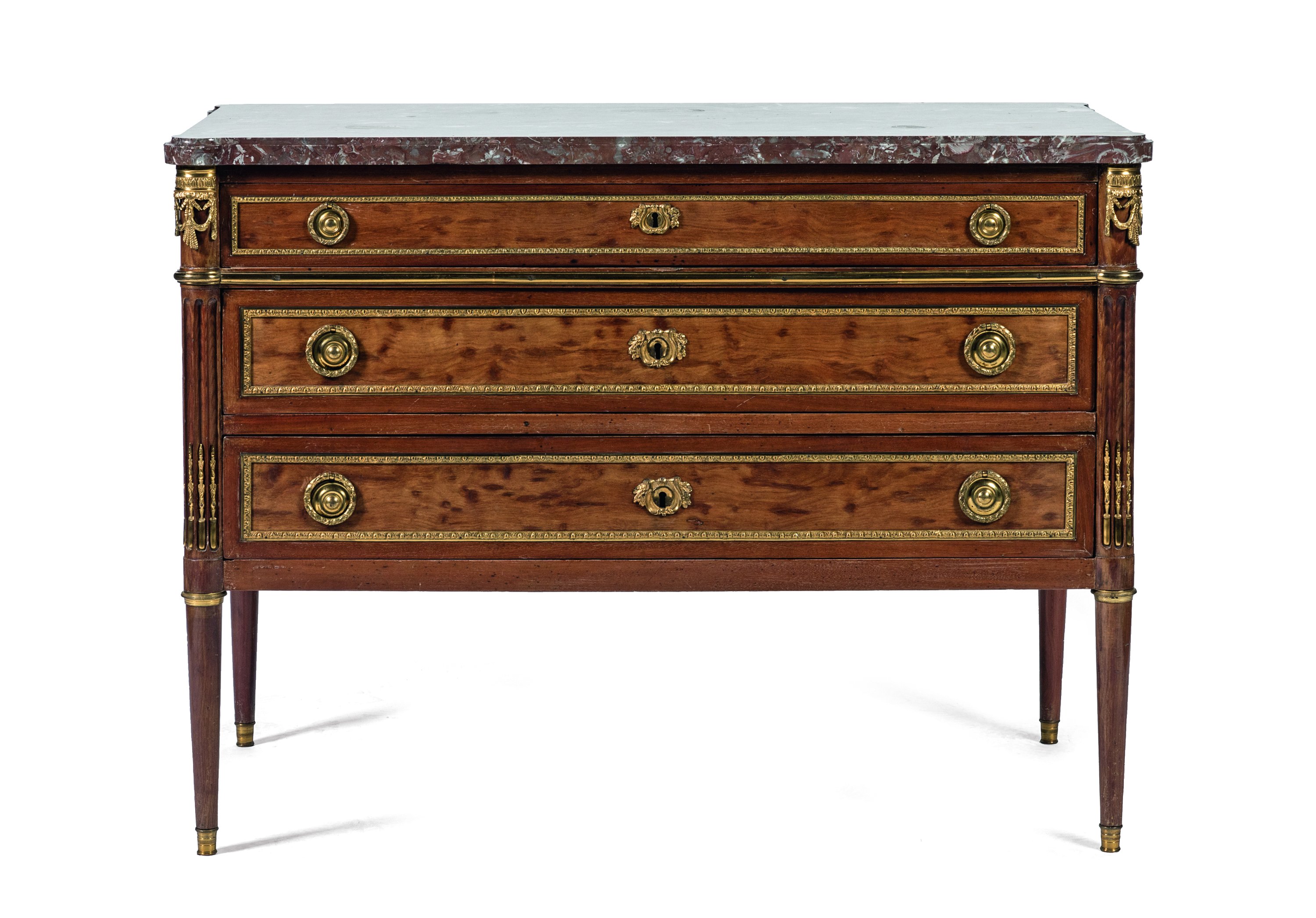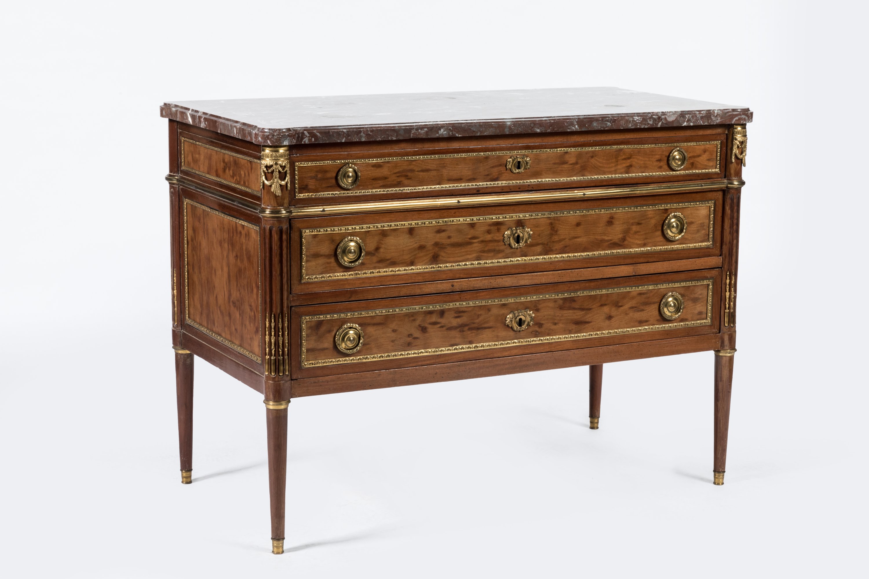 Jacques Bircklé. A Louis XVI ormolu-mounted mahogany and speckled mahogany veneer chest of drawers. Red marble top.