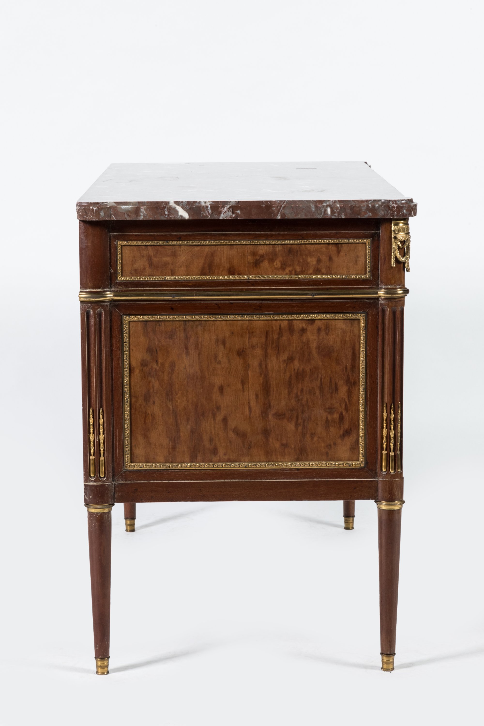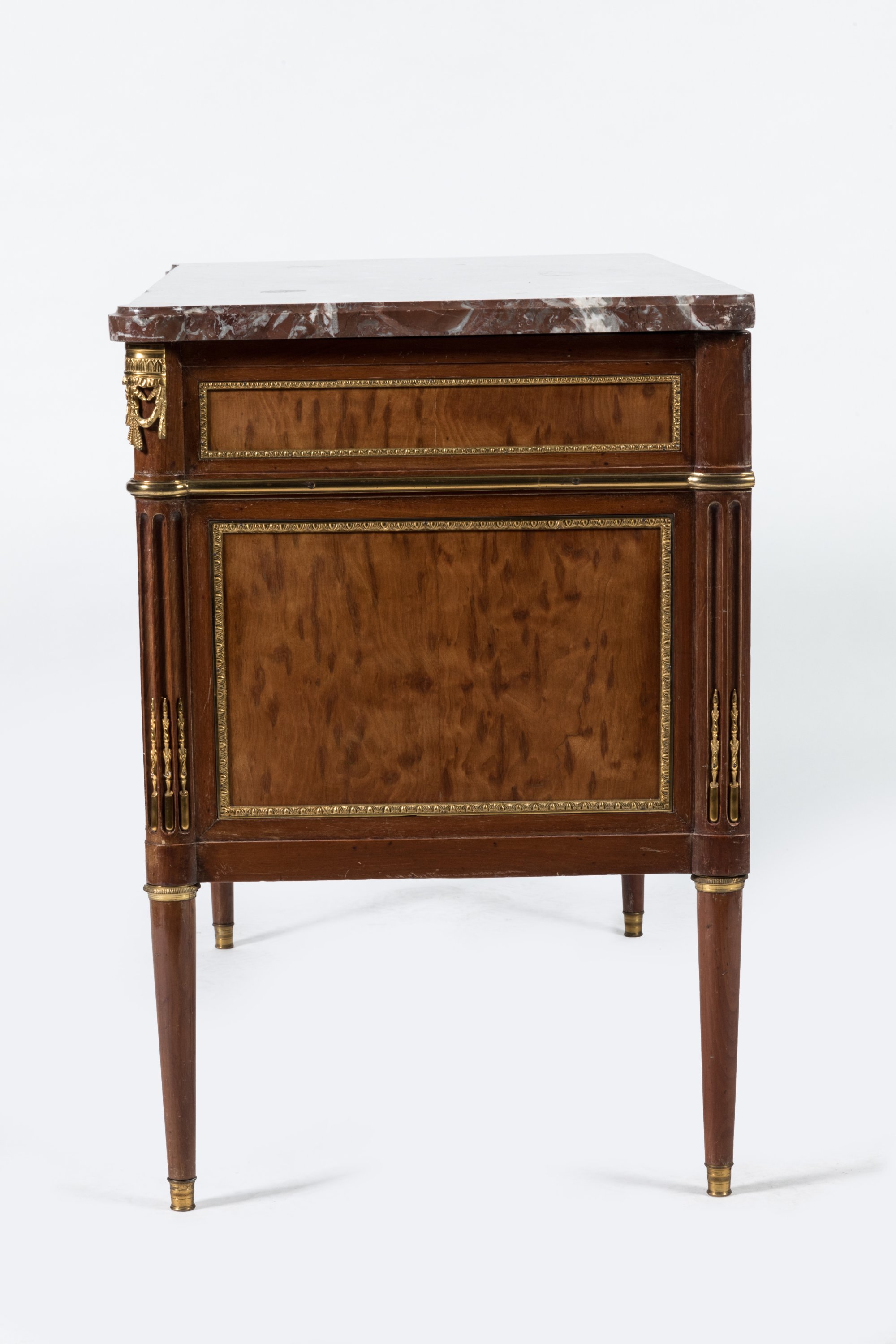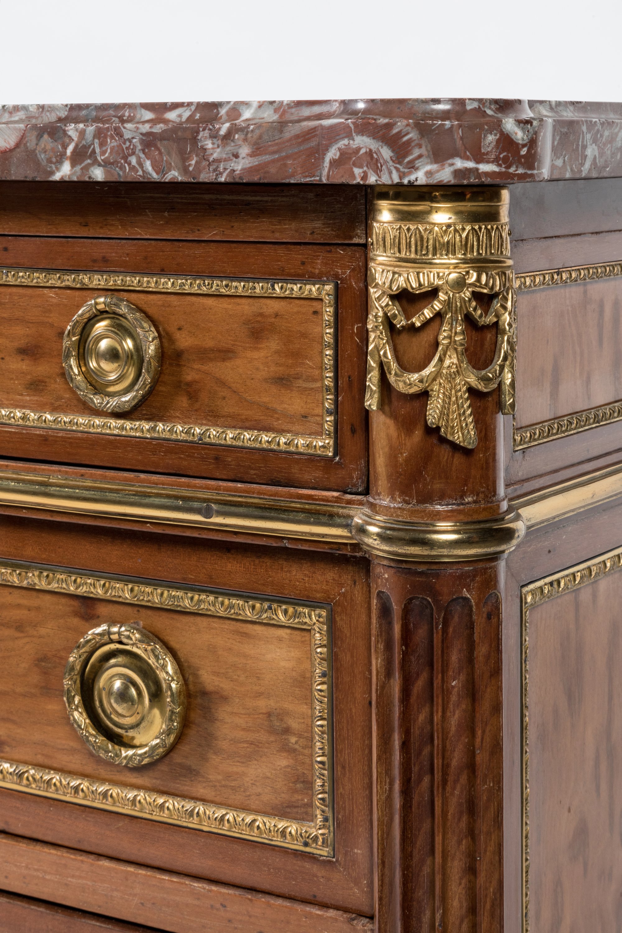 Jacques Bircklé. A Louis XVI ormolu-mounted mahogany and speckled mahogany veneer chest of drawers. Red marble top.
