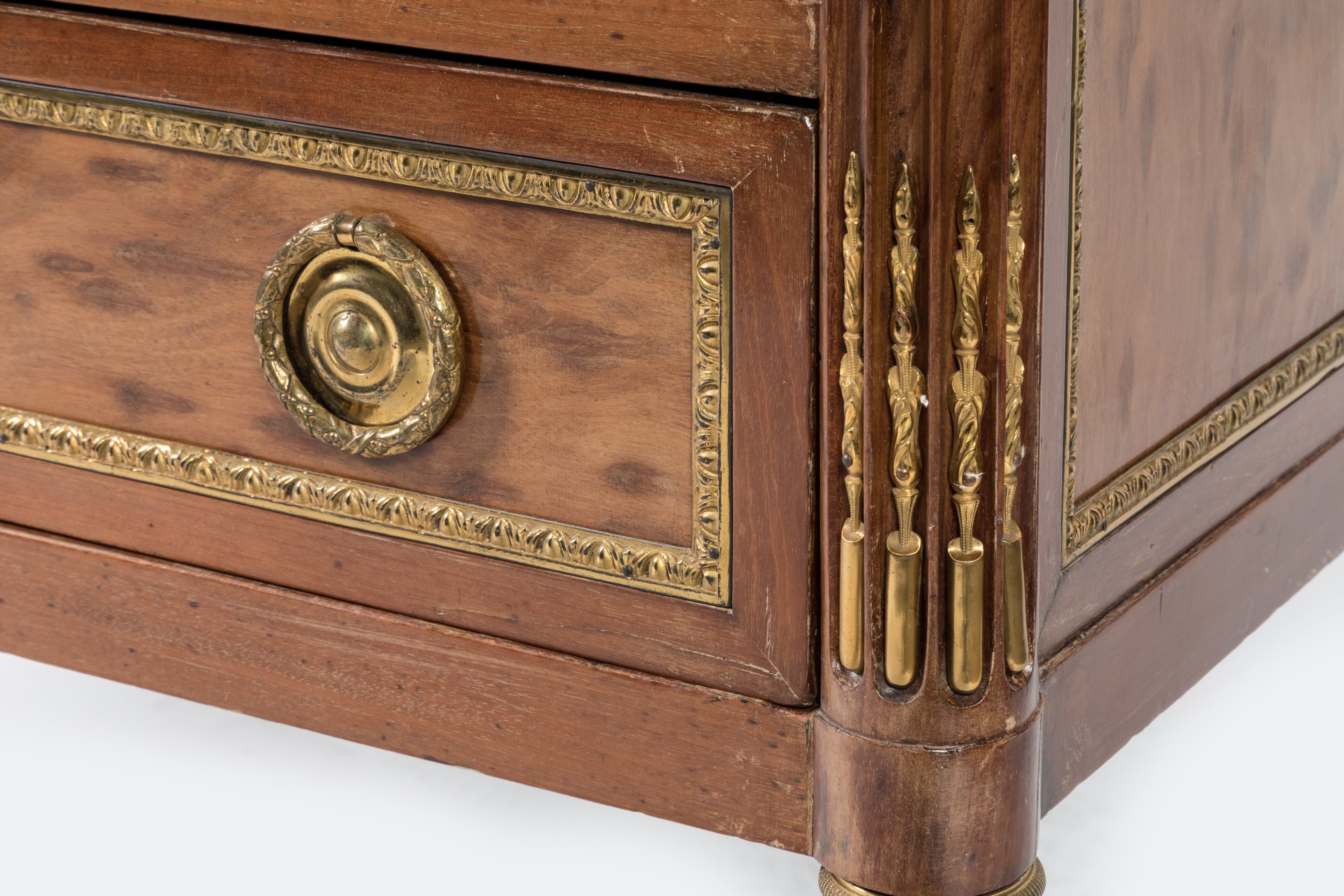 Riche ornementation en bronze doré aux encadrements de tiroirs, prises mobiles, entrées de serrures, chutes d'angles, lingotière, bagues et sabots.
