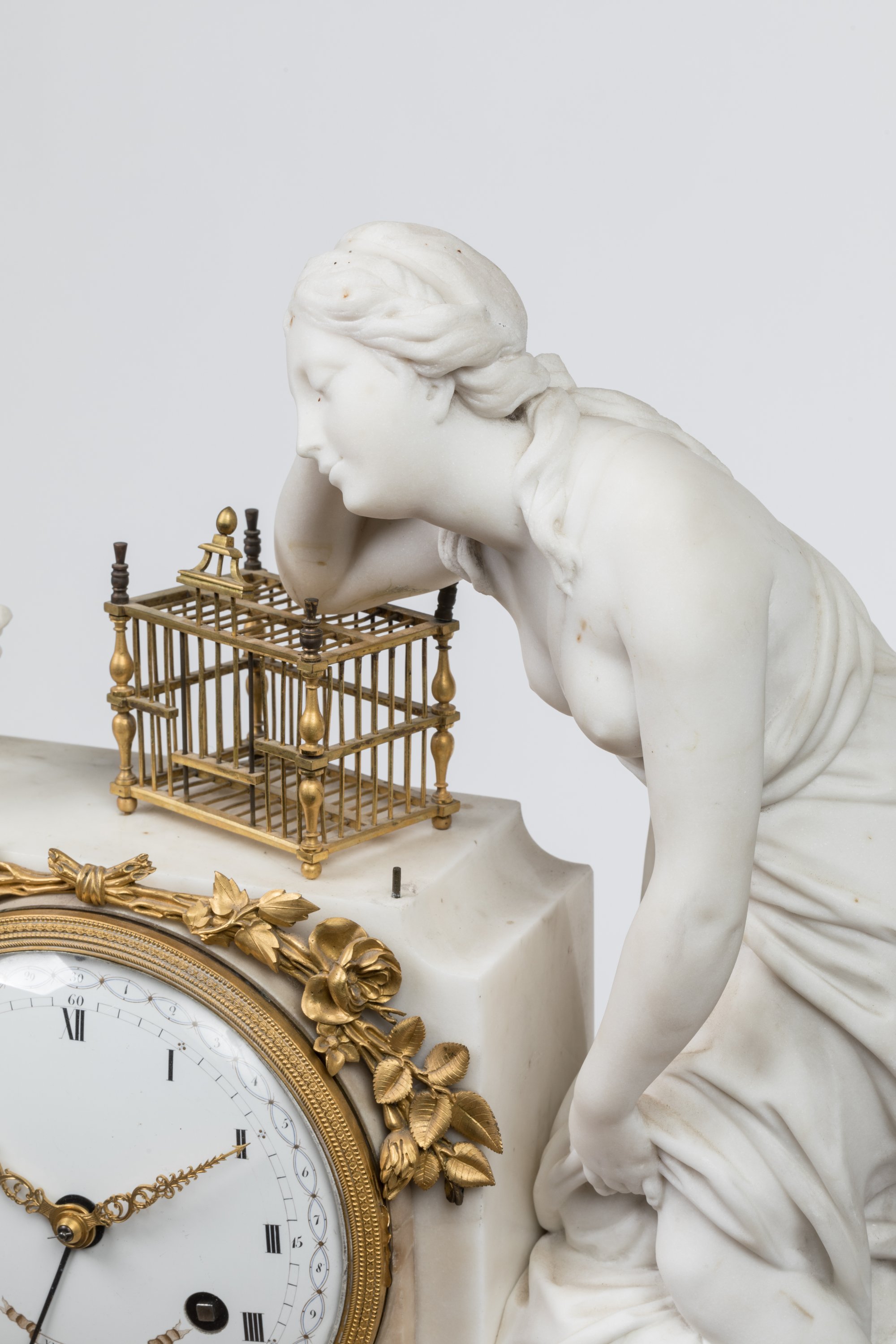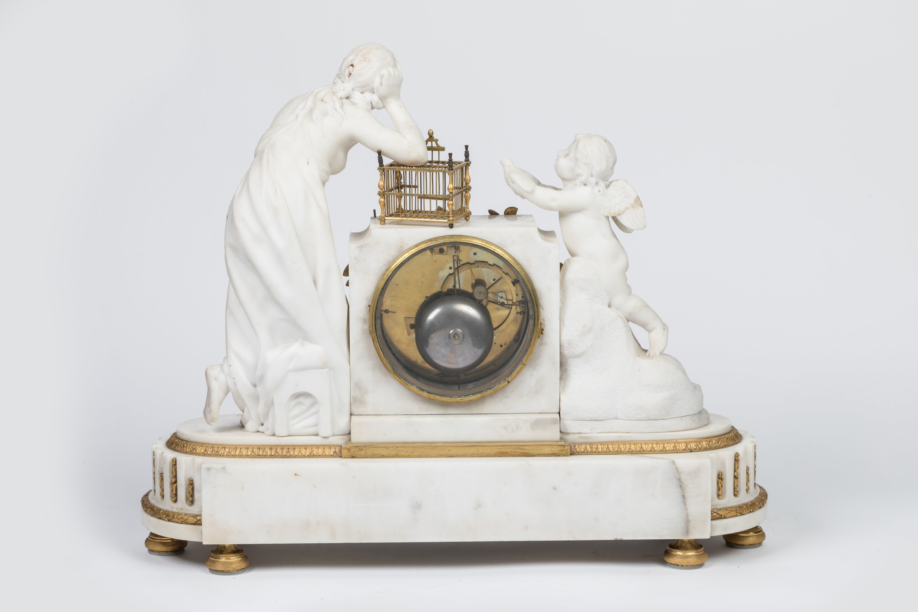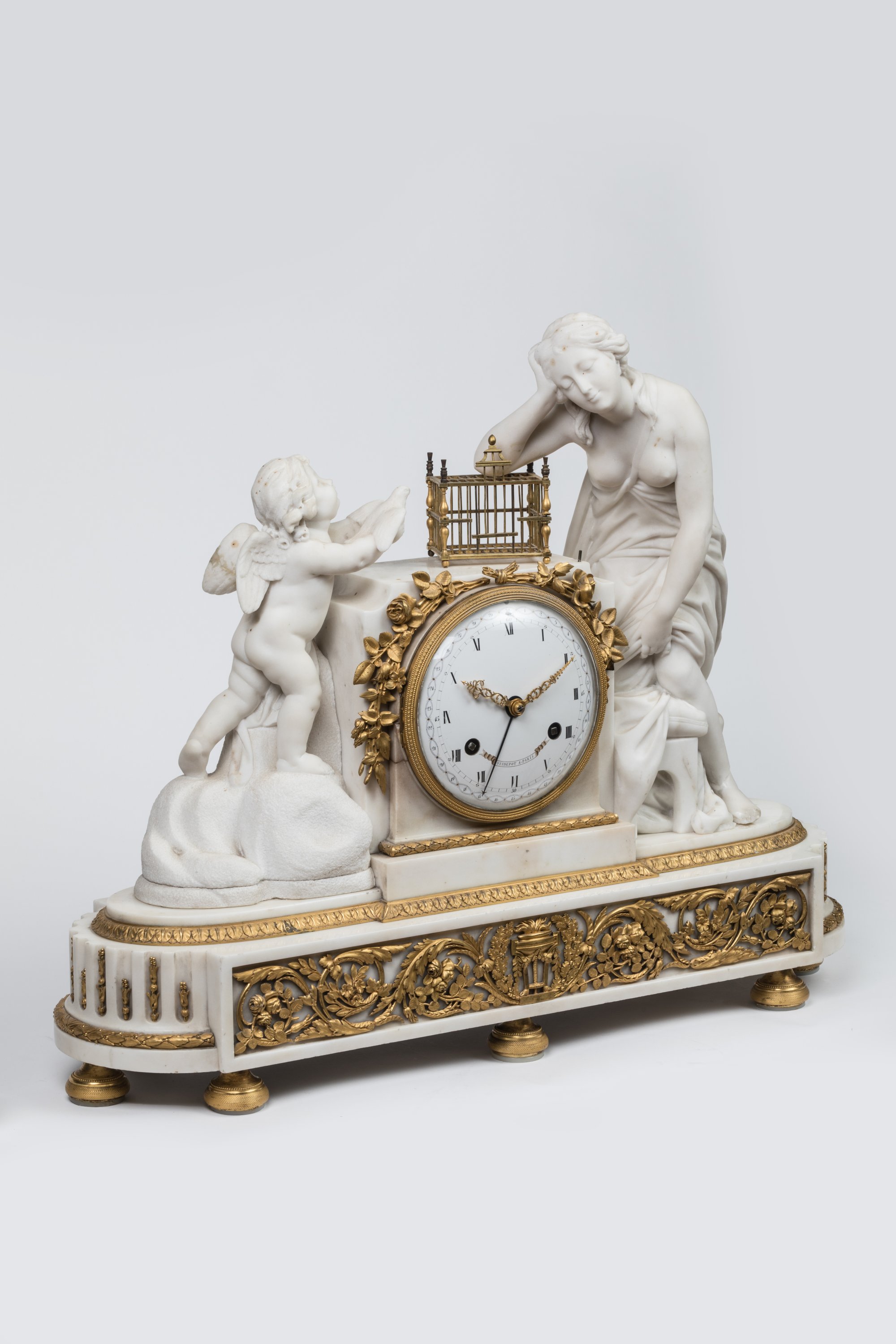 en marbre blanc et bronze doré ciselé figurant l'amour remettant une colombe dans sa cage dorée devant Vénus alanguie. Le groupe entourant le cadran décoré par deux branches de rosier est bordé d'une frise d'oves et de dards, installé sur une terrasse en marbre blanc oblongue et rudentée, à décor de frise d'acanthe et de roses. Il repose sur huit pieds toupie.