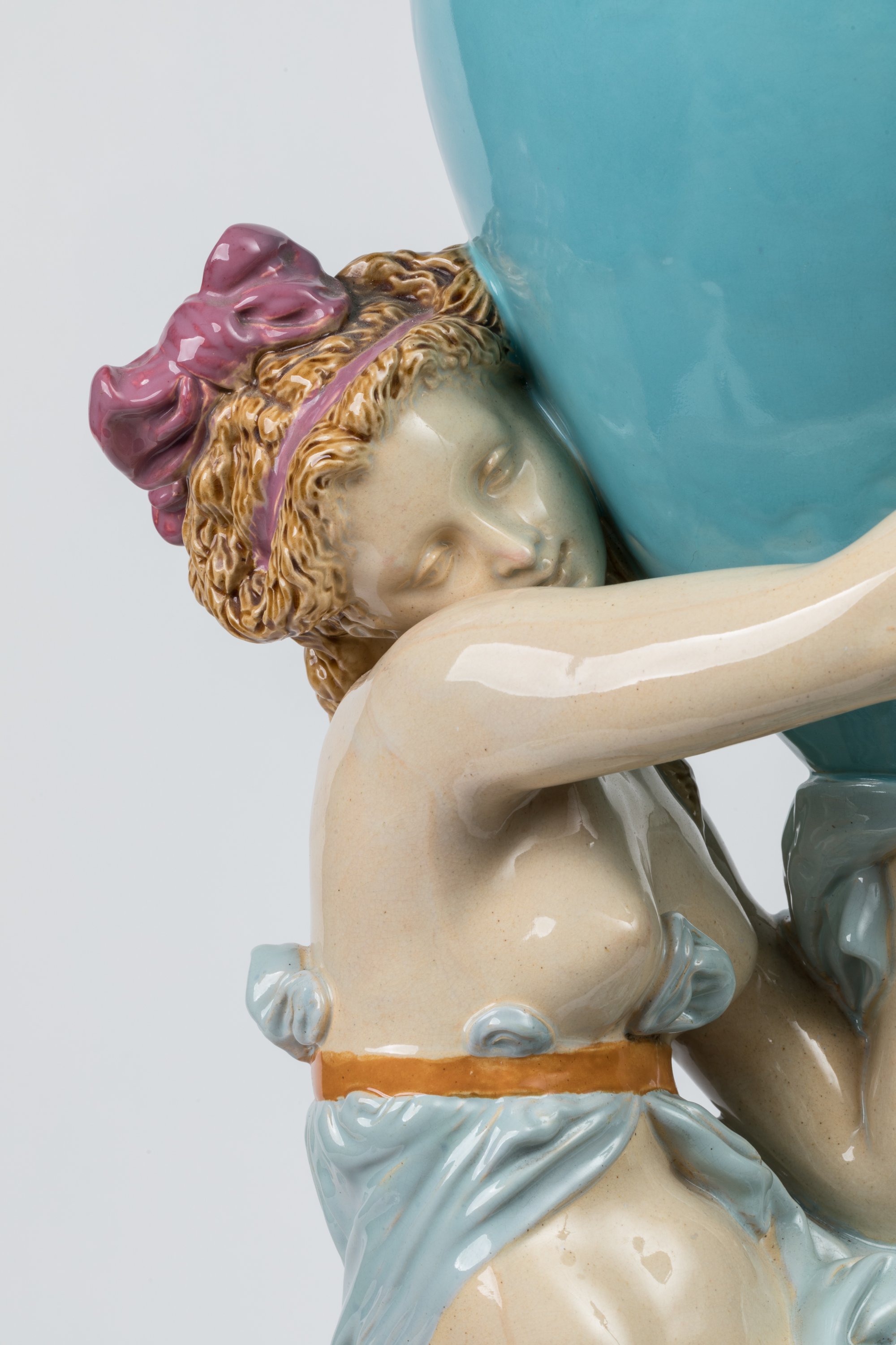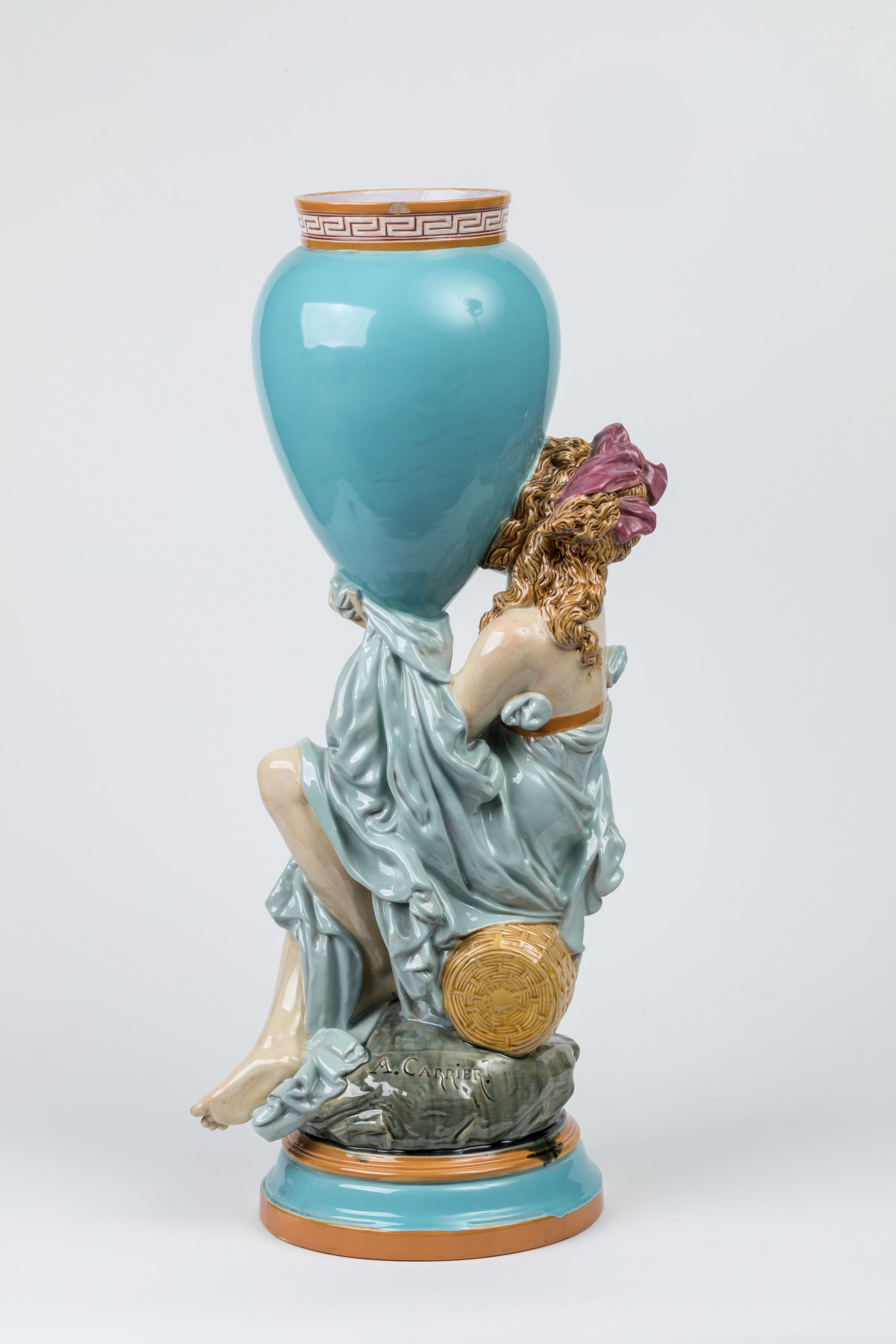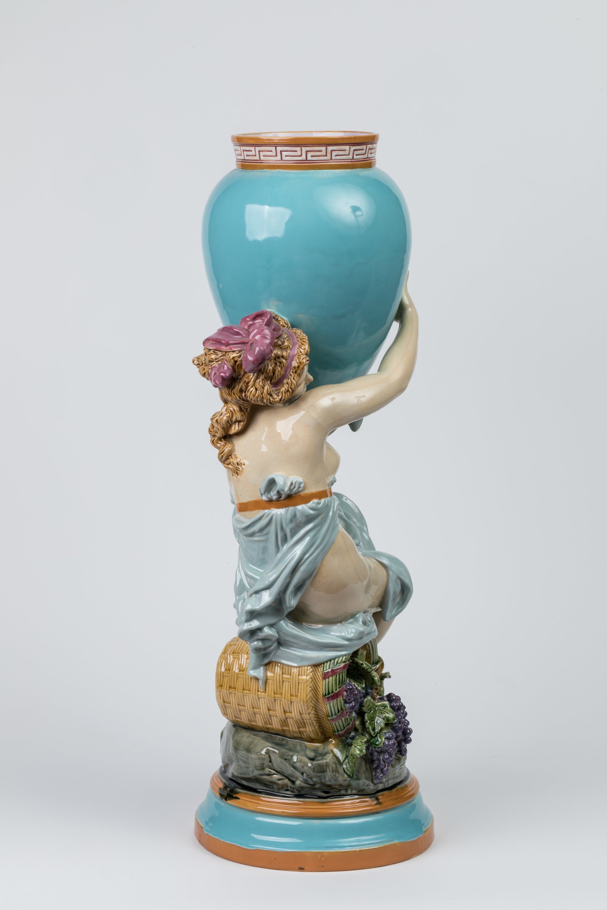 Albert-Ernest Carrier-Belleuse for Minton, 1878. A polychrome glazed majolica vase figuring a scantily clad nymph seated on a wicker basket overflowing with grapes while supporting an amphora.