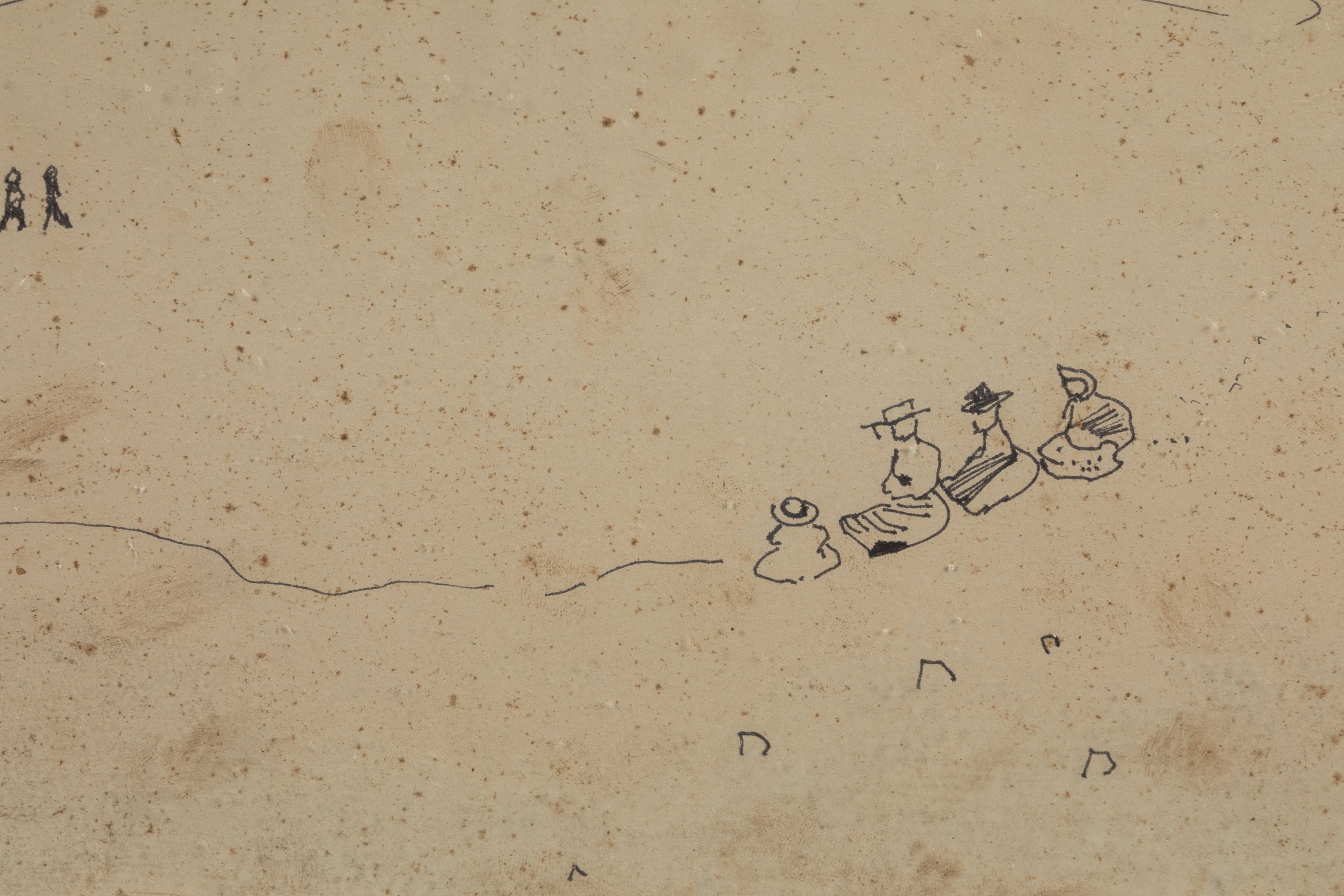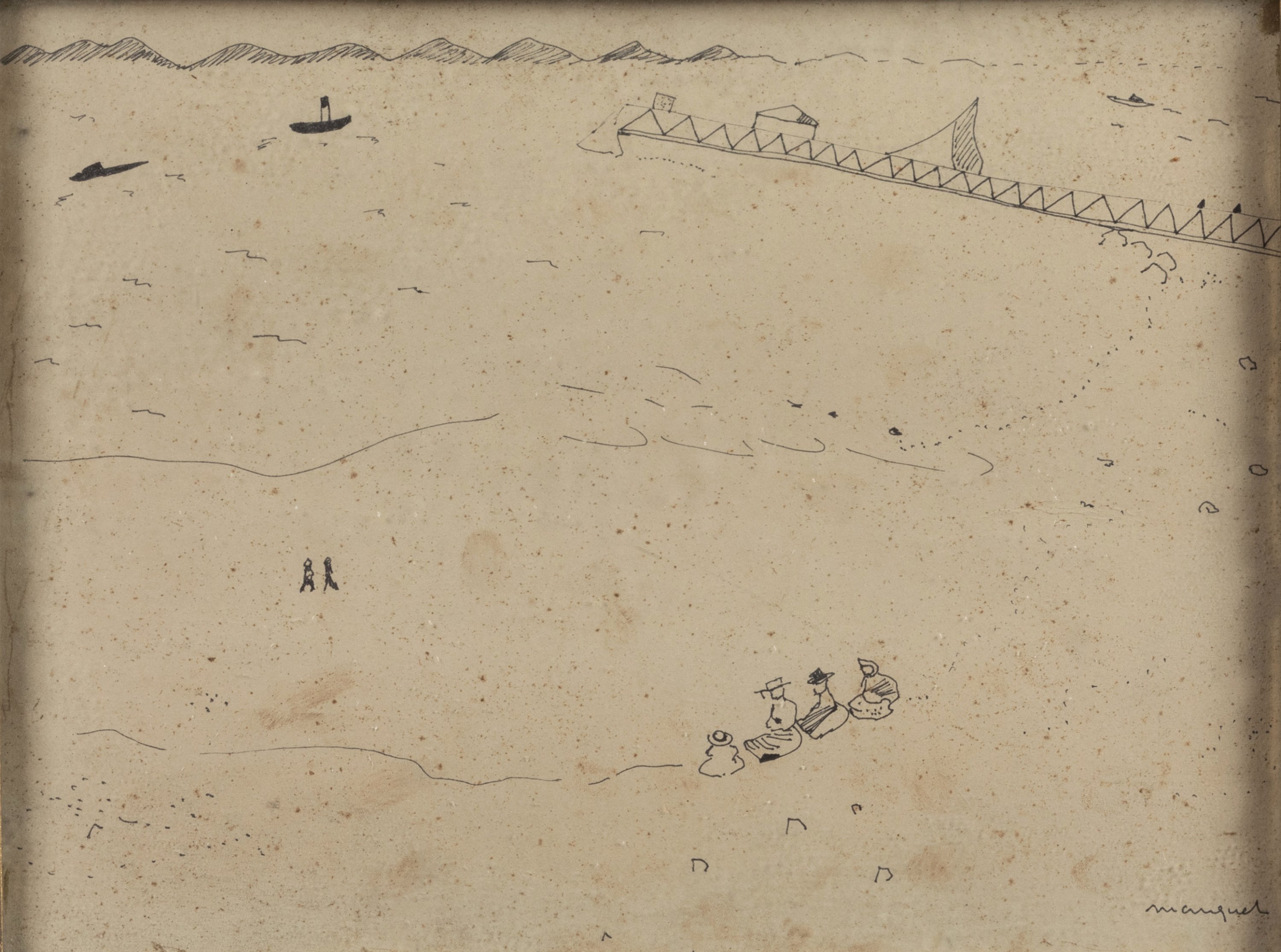 Notre dessin montre tout l'intérêt d'Albert Marquet pour les marines en général et pour la représentation des plages en particulier, qu'il effectue pour la première fois dans les années 1905-1906. C'est à l'occasion d'un voyage avec Raoul Dufy au Havre et Sainte-Adresse que Marquet s'intéresse à un sujet traité antérieurement par les impressionnistes. Il garde de ces derniers le goût pour les variations. Ainsi, ce dessin reprend le groupe de personnages de "La Jetée" et traite l'arrière-plan avec plus de simplicité. L'oeuvre graphique de ce peintre de la Marine est marquée par une économie de moyens.