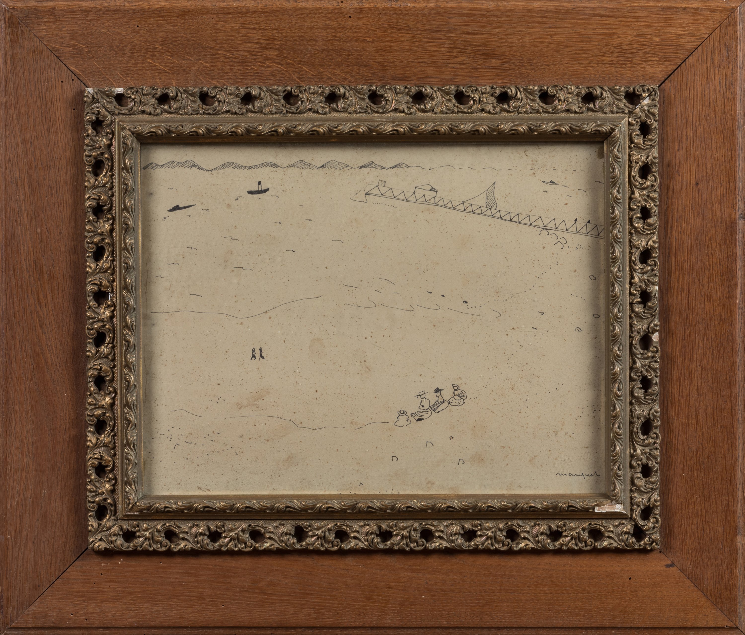 Albert Marquet. An ink drawing of a beach. Signed. In a carved giltwood frame.