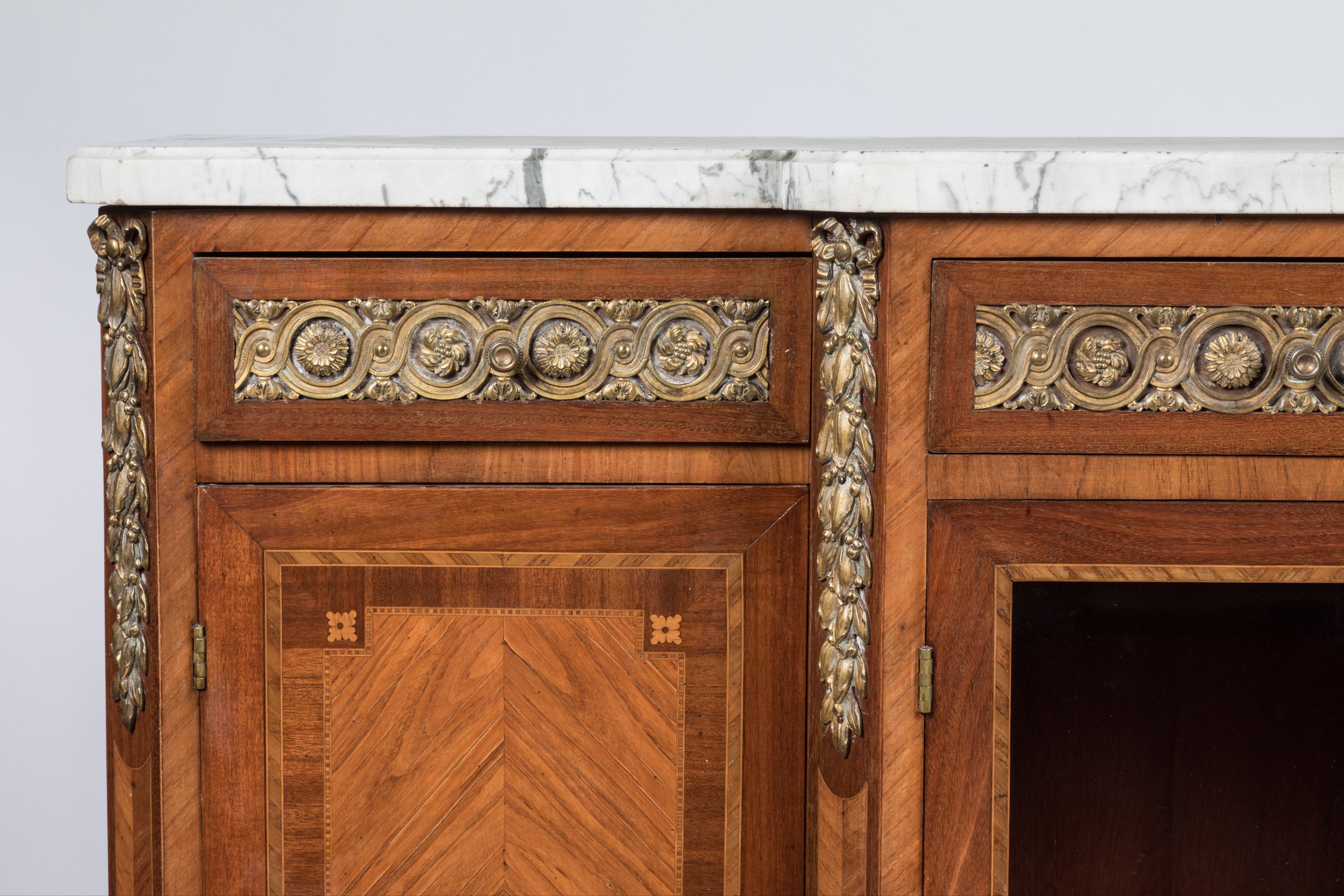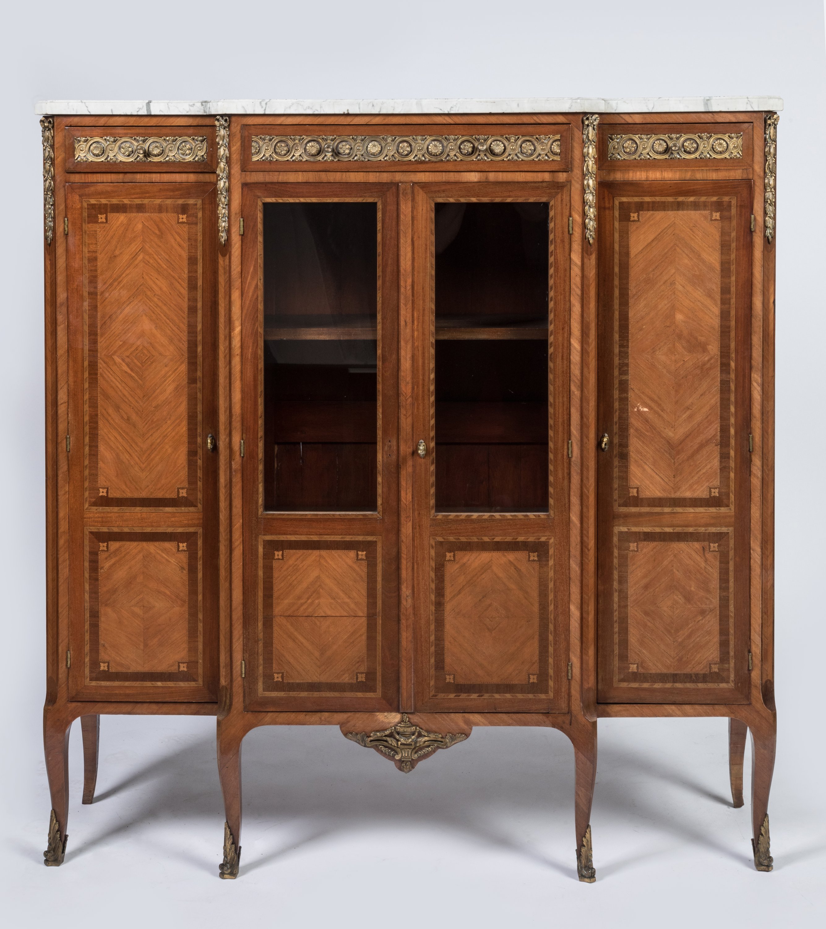 Maison Jansen. A Louis XVI style ormolu-mounted veneered wood bookcase. White marble top. Bespoke piece of furniture for the Parisian apartment of Princess Radziwill.