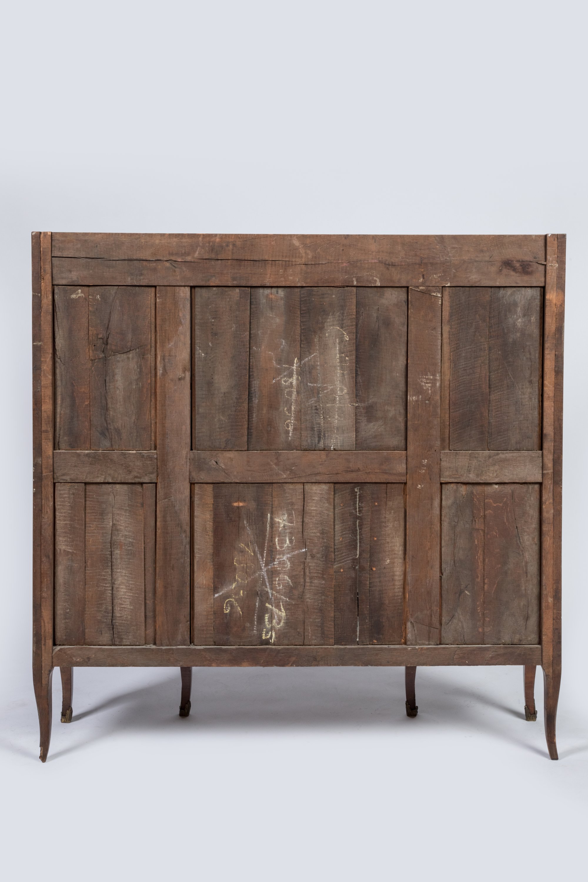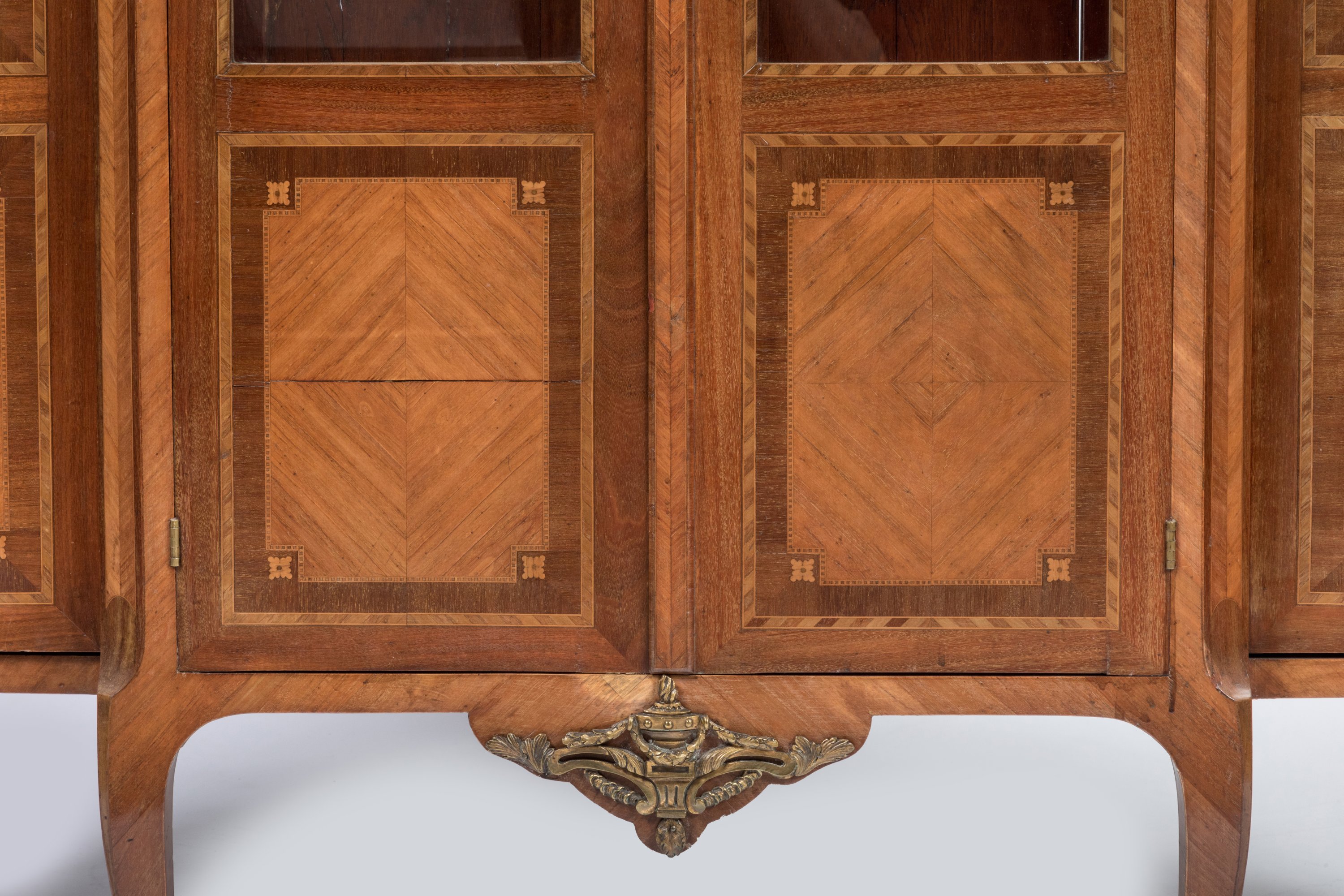 en bois de placage. Elle ouvre en partie supérieure par trois tiroirs, la partie centrale à deux portes vitrées entourée par deux vantaux à décor de tables aux angles rentrés. Les montants à pans coupés, le tablier en cul de lampe. Six pieds cambrés.