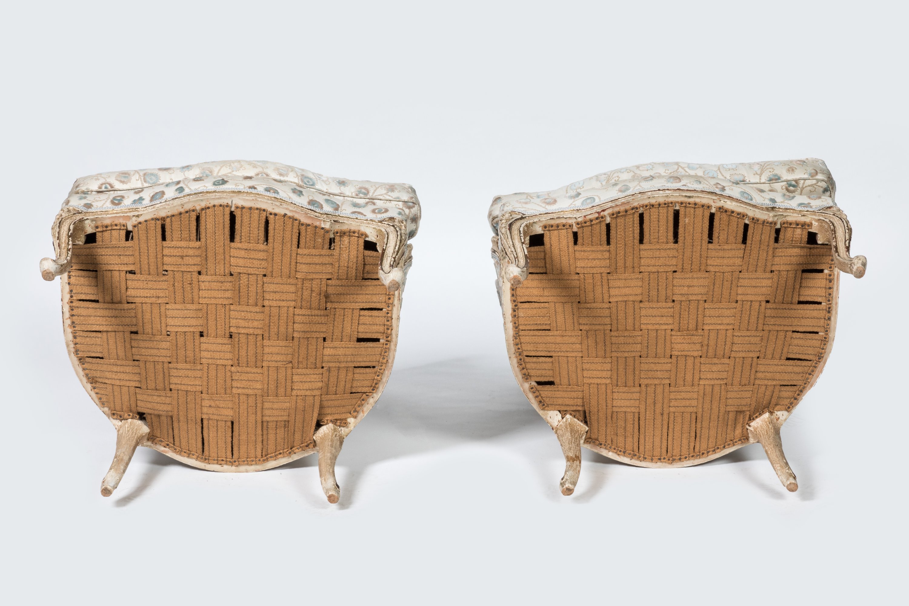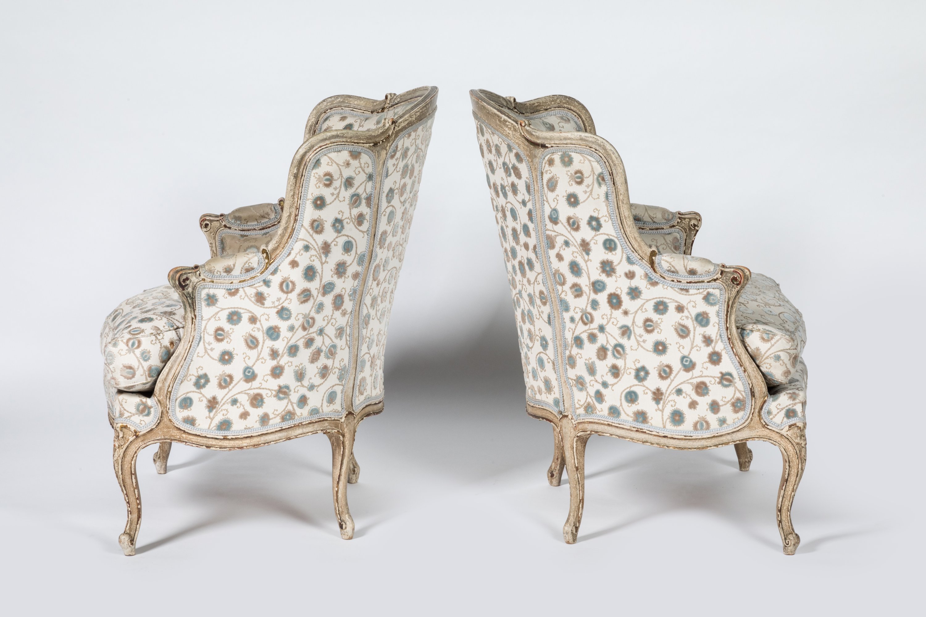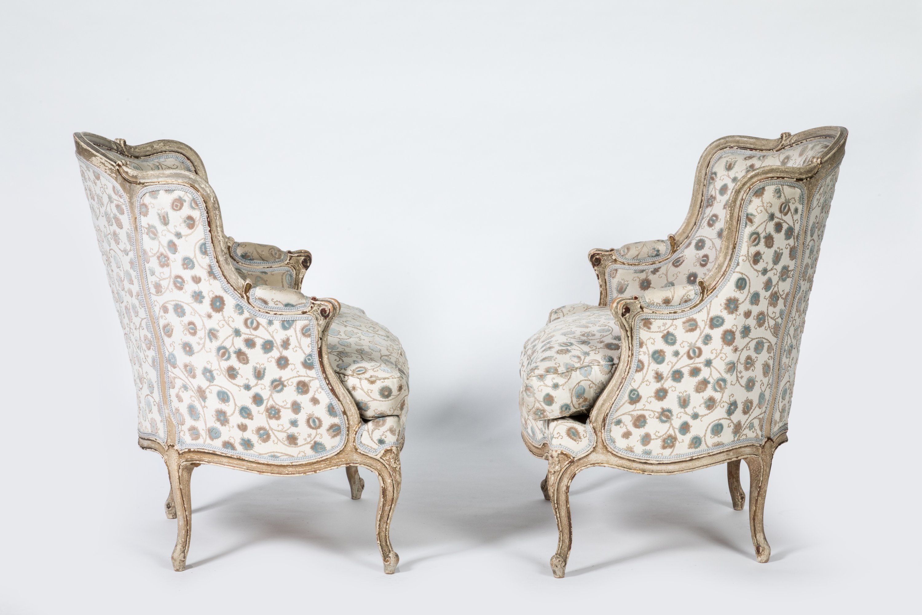 Maison Jansen. A pair of Louis XV style lacquered wood bergère armchairs. Silk, velvet and cotton upholstery. Bespoke pieces of furniture for the Parisian apartment of Princess Radziwill.